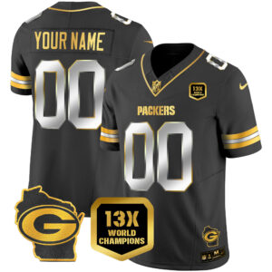 Packers 13 Time World Champions & Home Patch Gold Vapor Custom Jersey – All Stitched