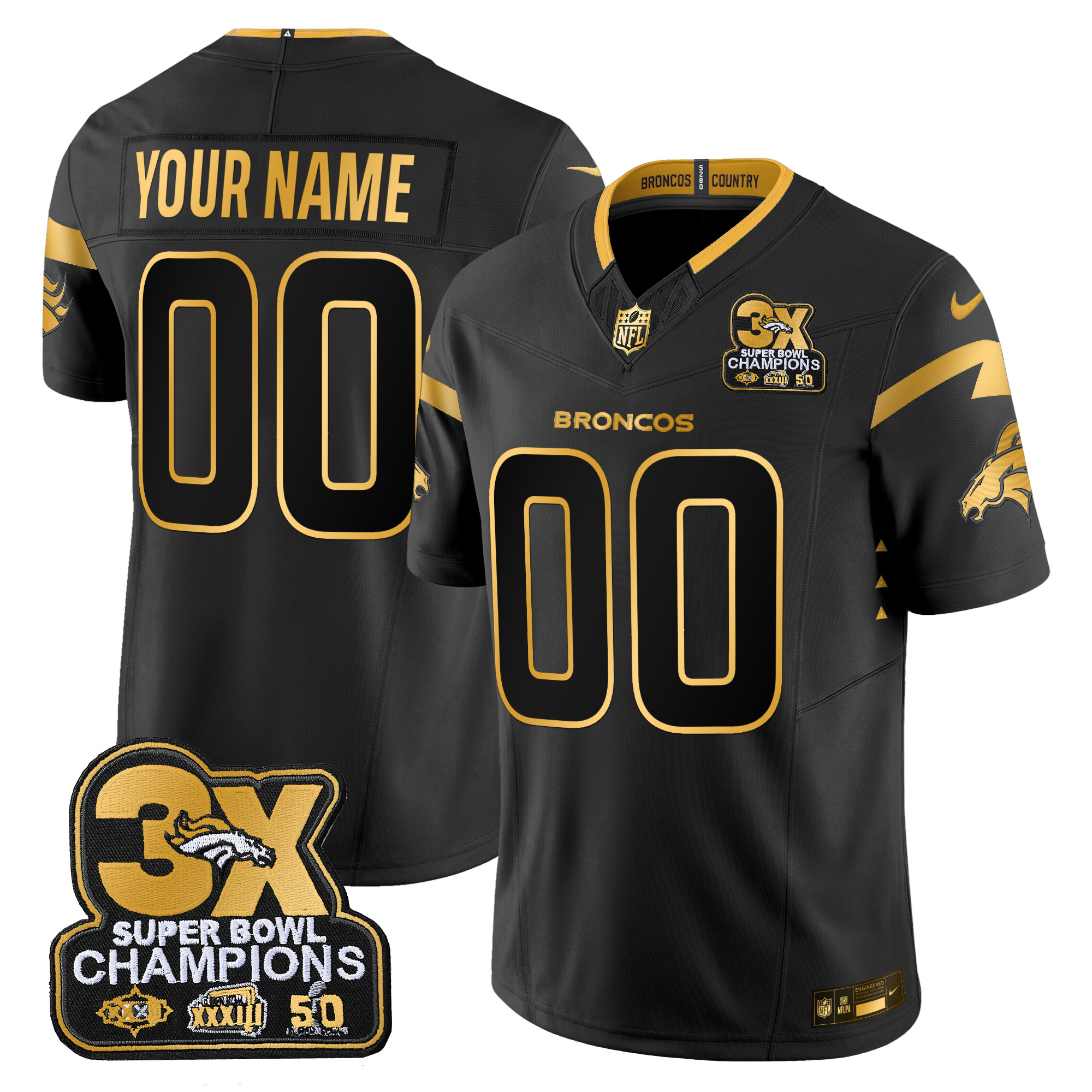 Denver Broncos 3-Time Champions Patch Gold Vapor Limited Custom Jersey – All Stitched