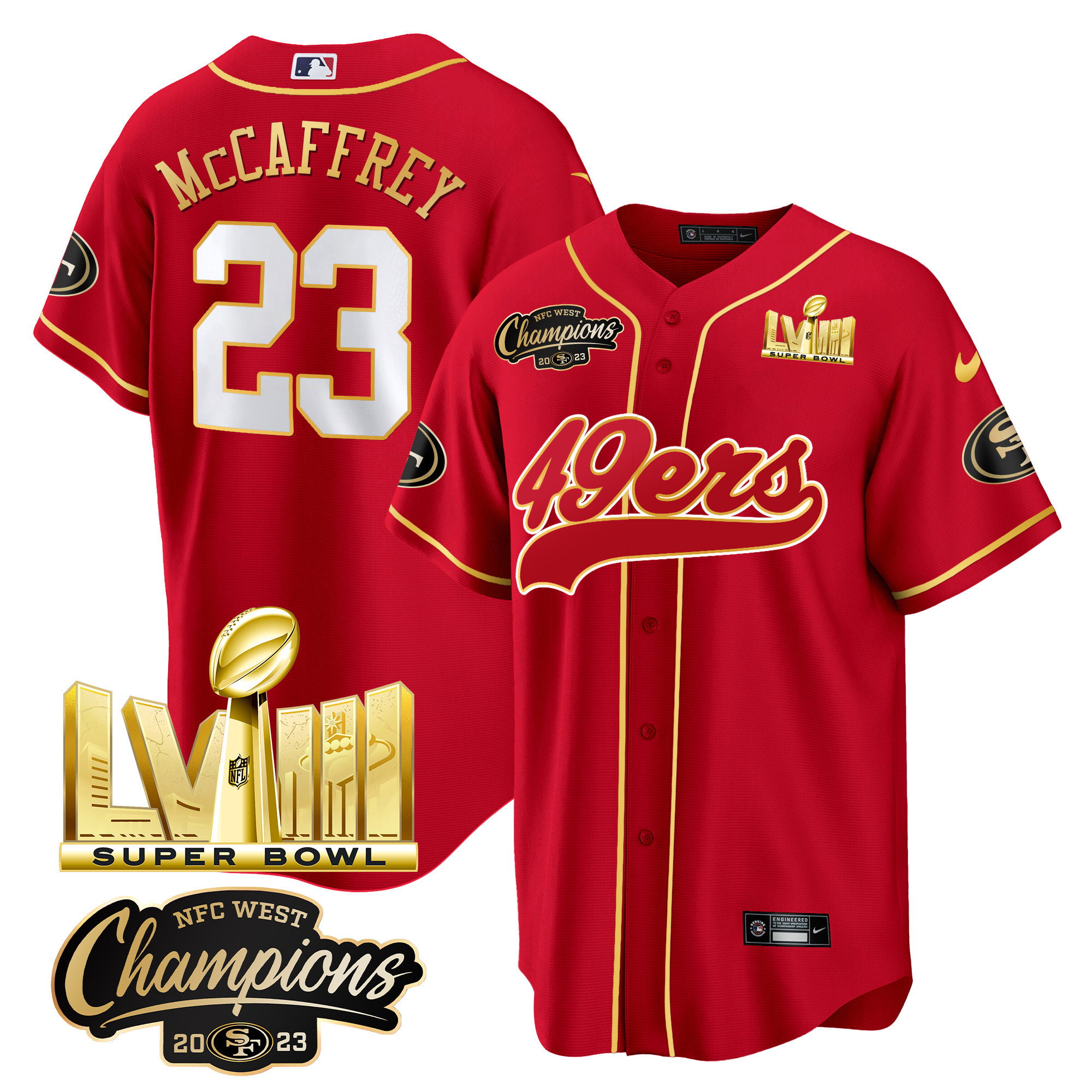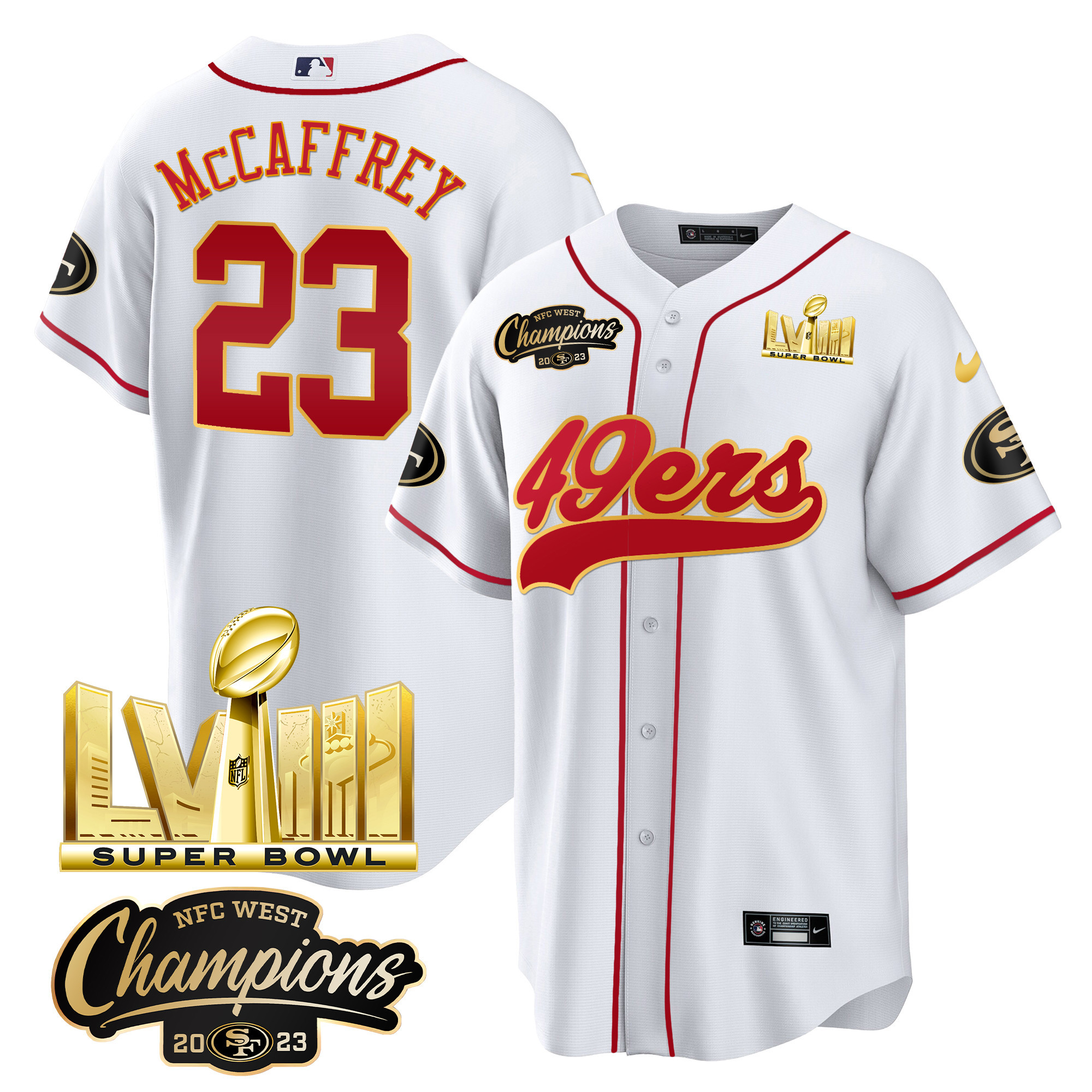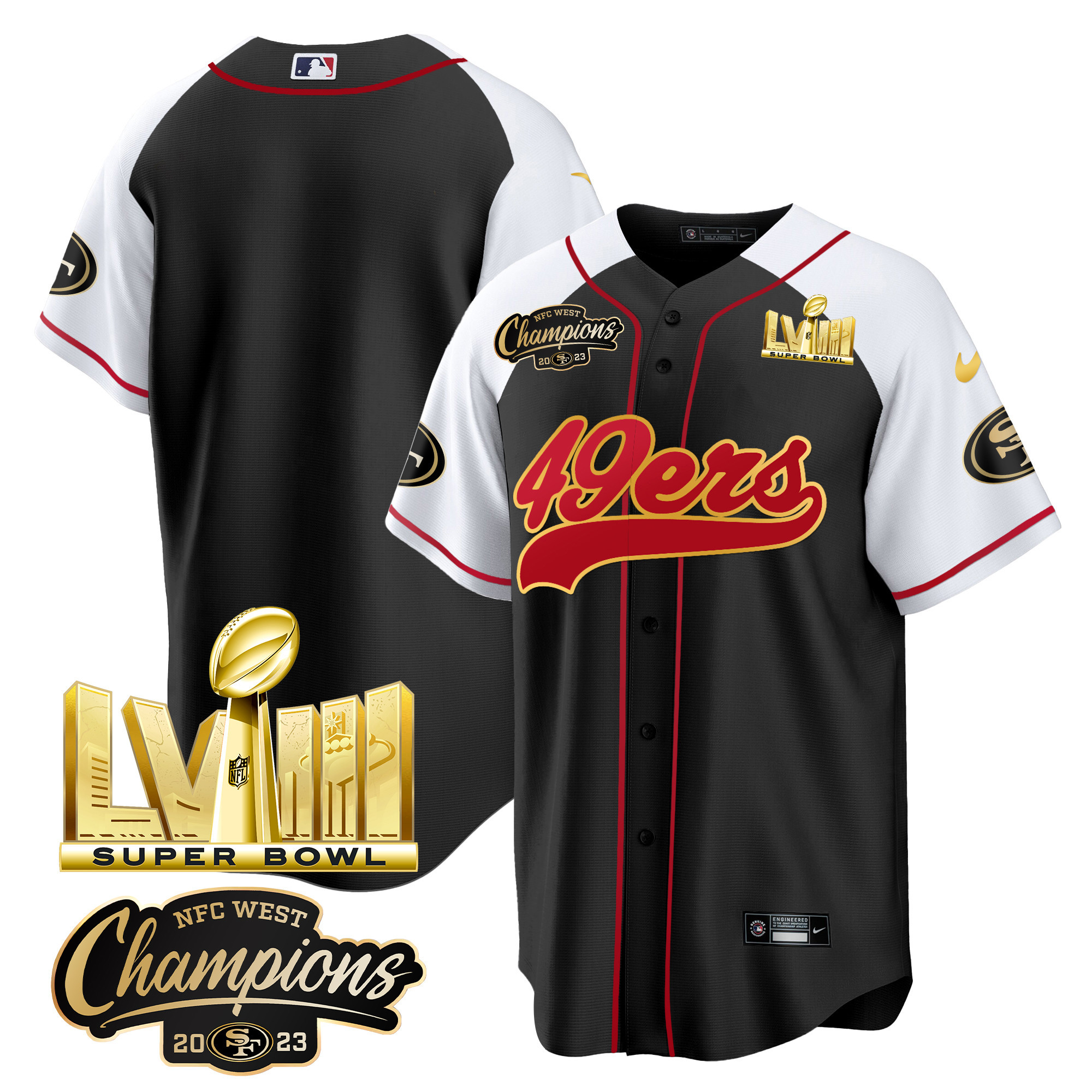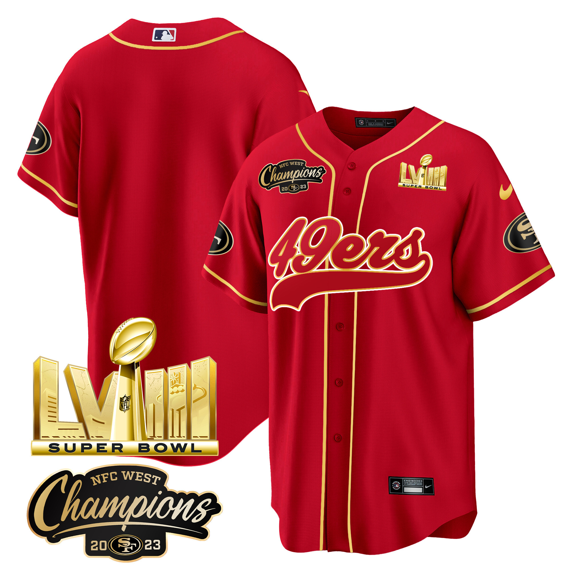 Men’s 49ers NFC West Champions & Super Bowl LVIII Gold Patch Baseball Jersey – All Stitched
