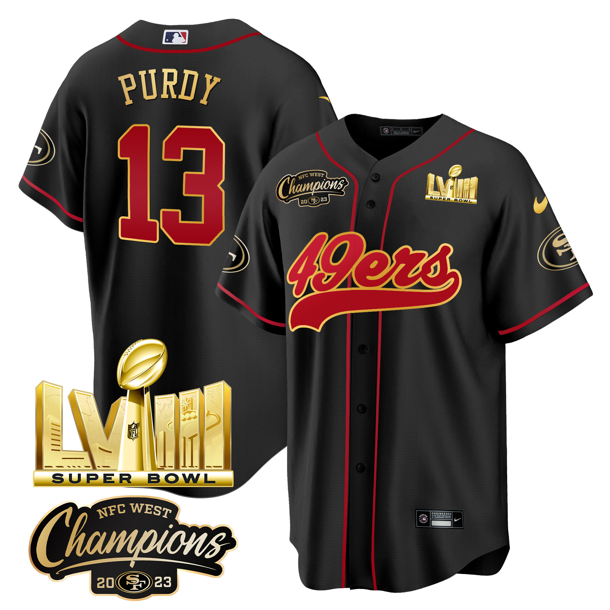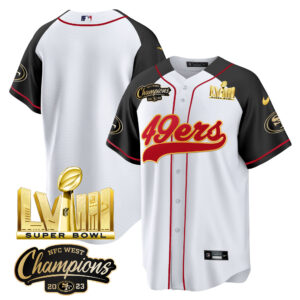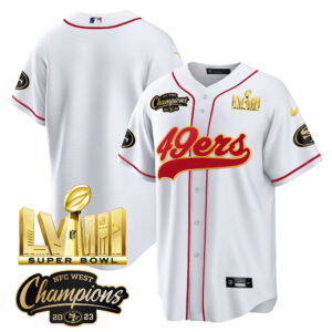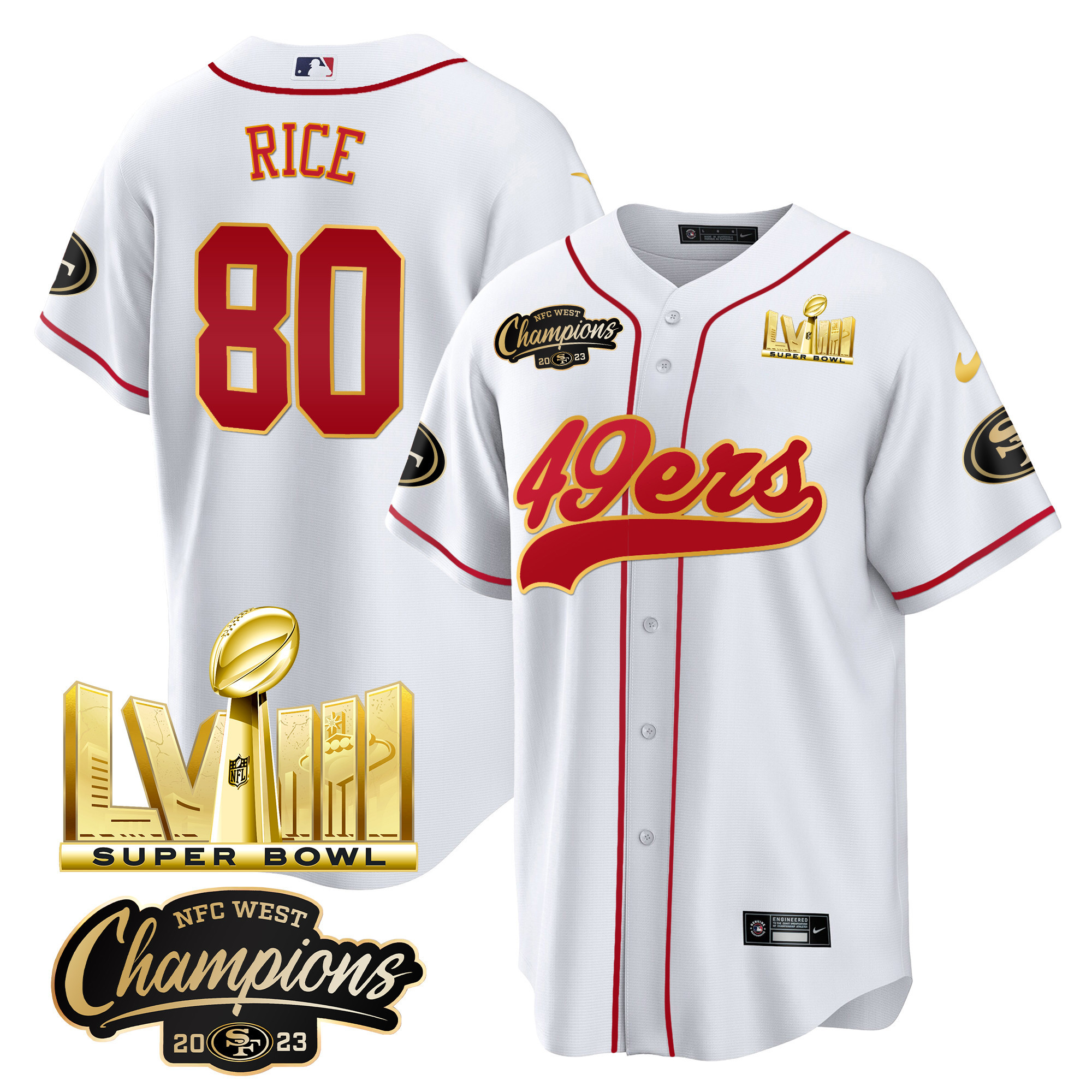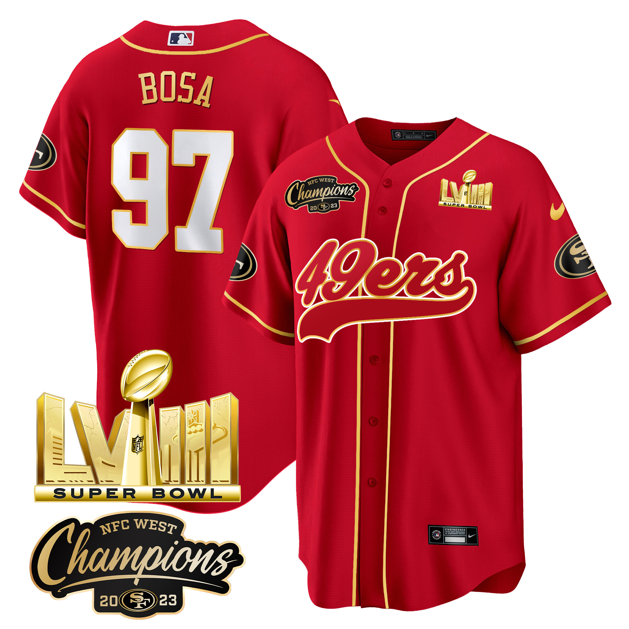 Men’s 49ers NFC West Champions & Super Bowl LVIII Gold Patch Baseball Jersey – All Stitched