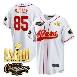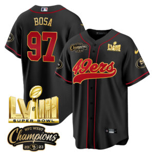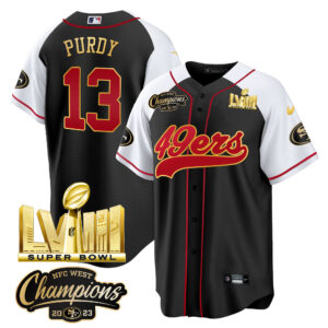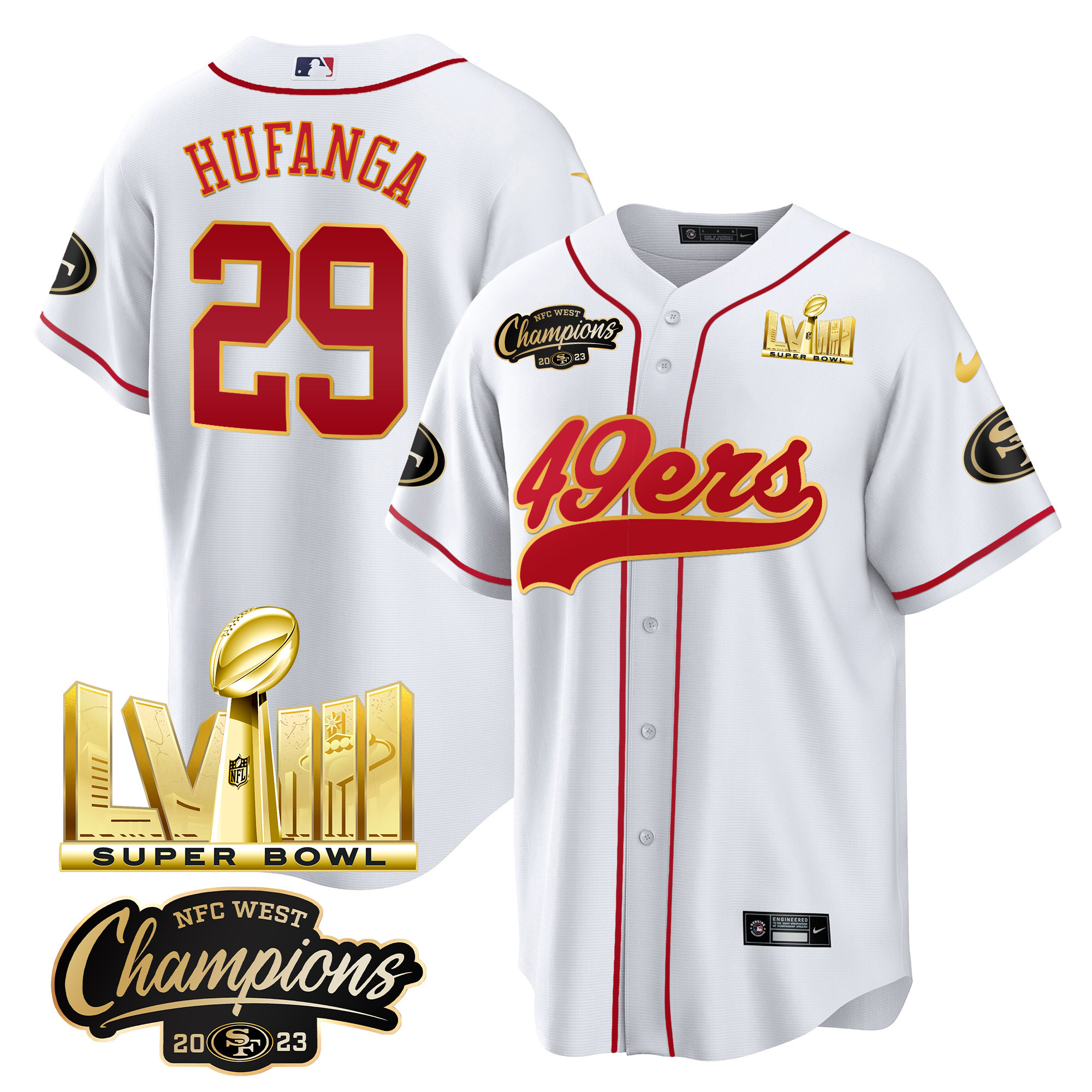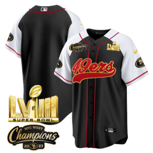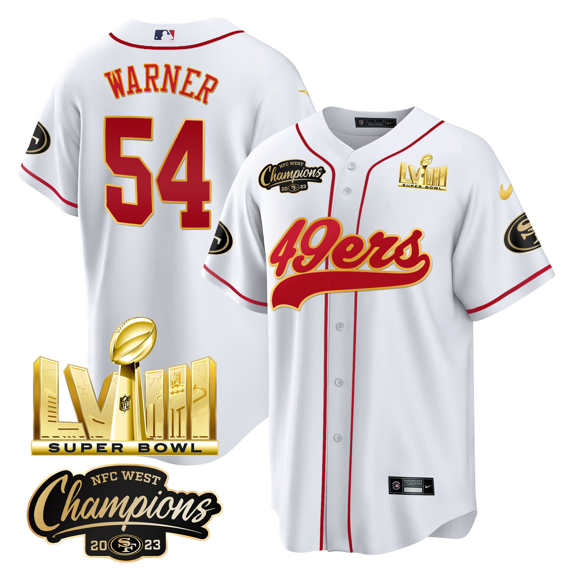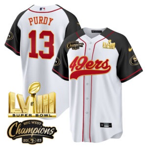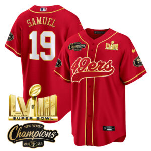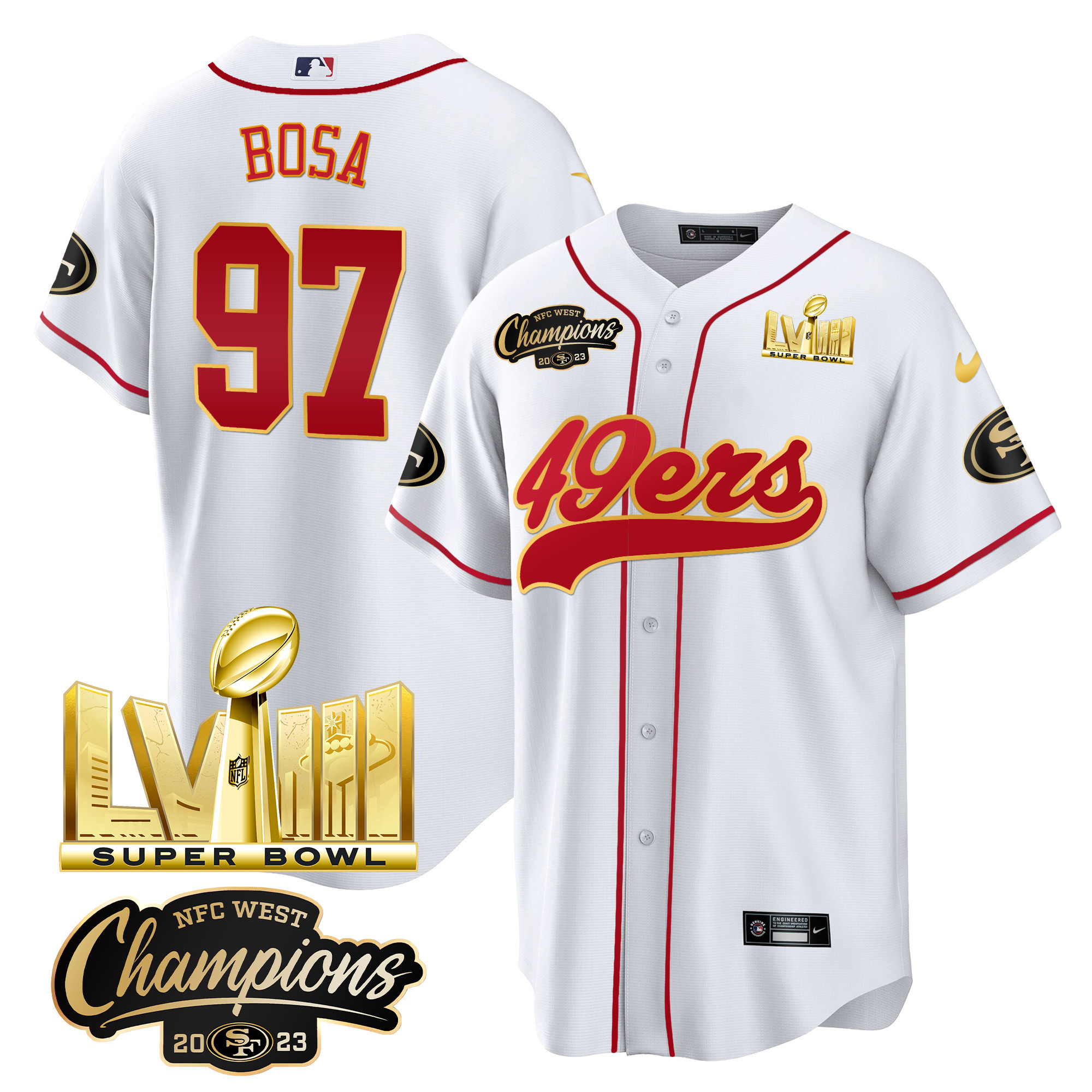 Men’s 49ers NFC West Champions & Super Bowl LVIII Gold Patch Baseball Jersey – All Stitched