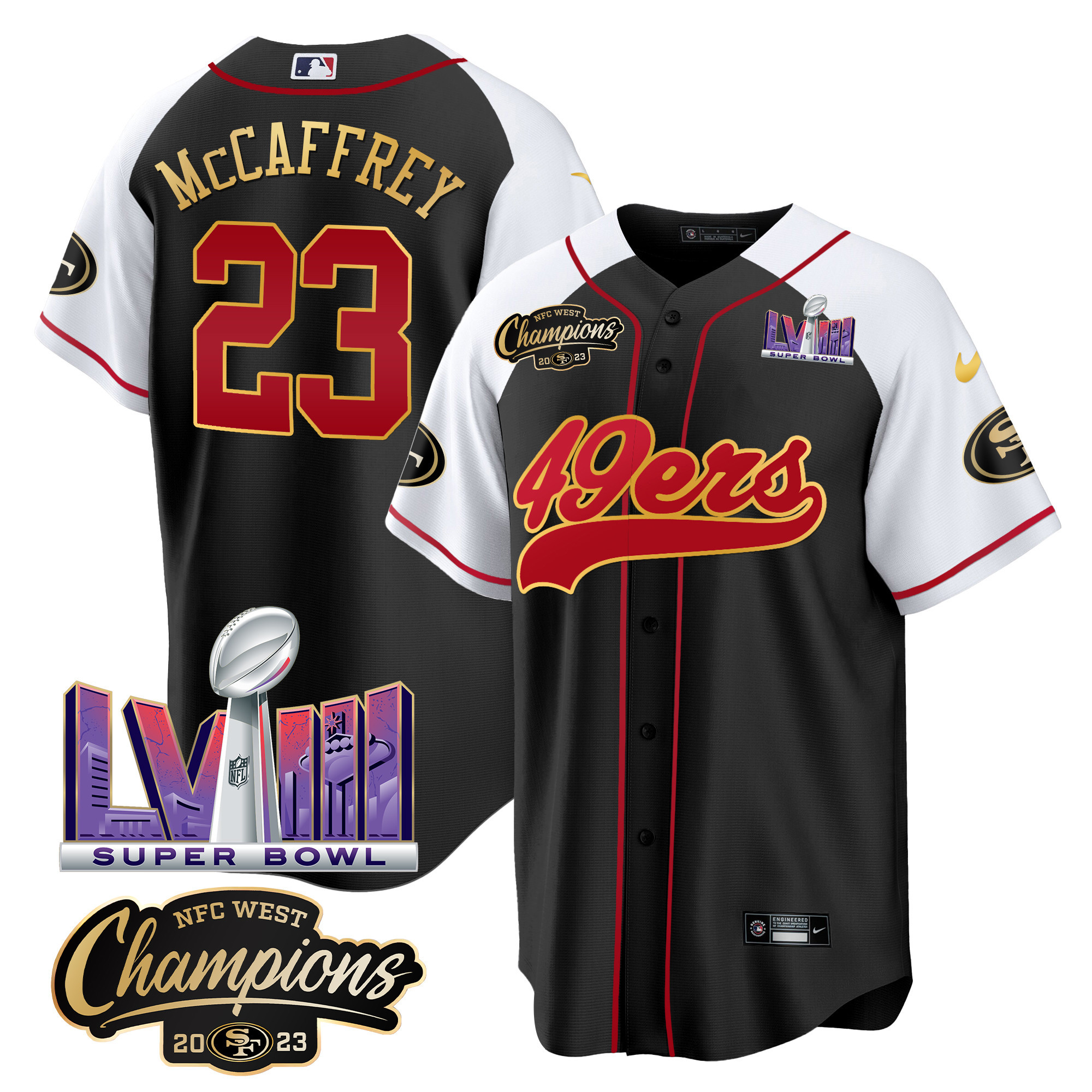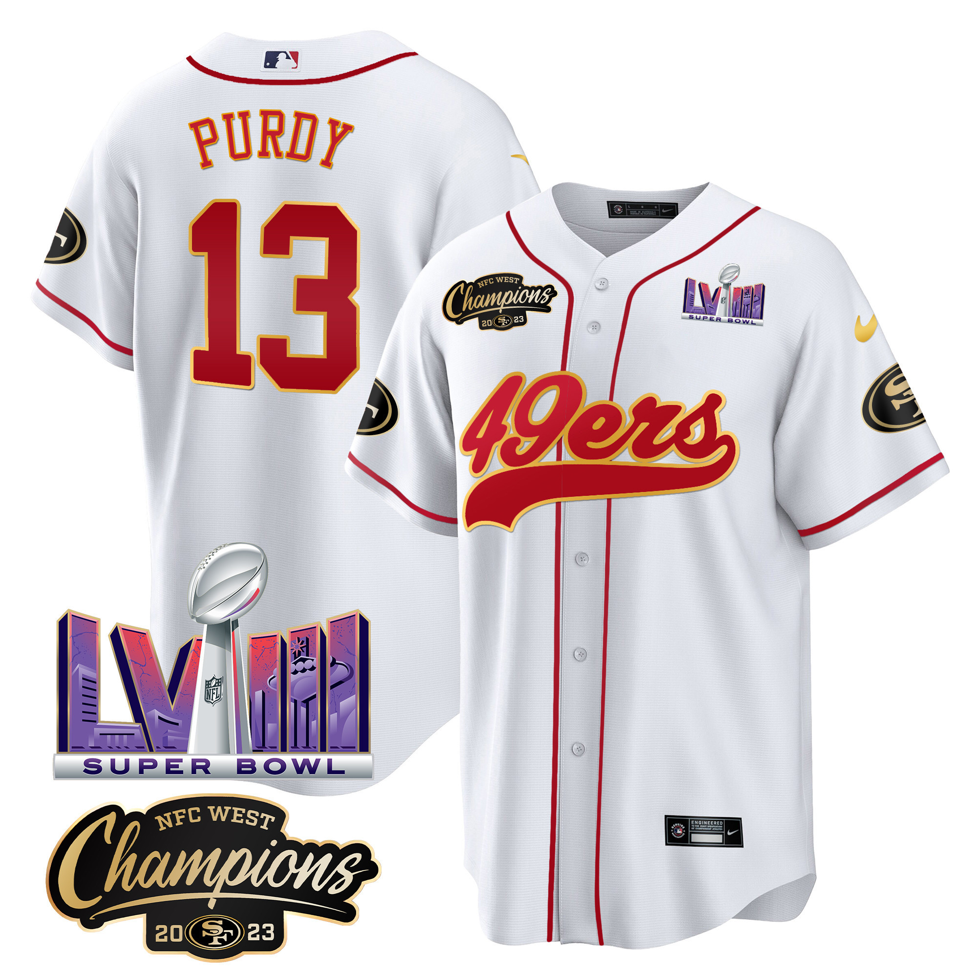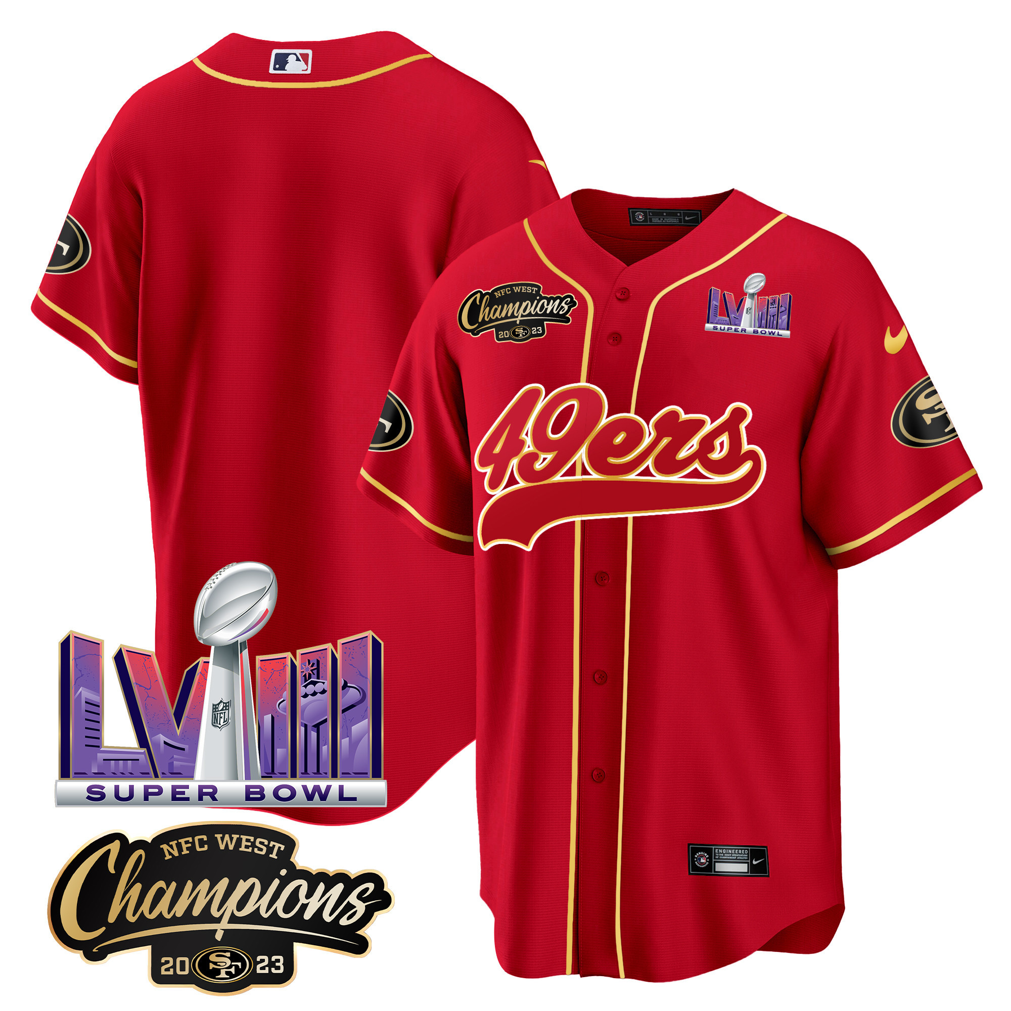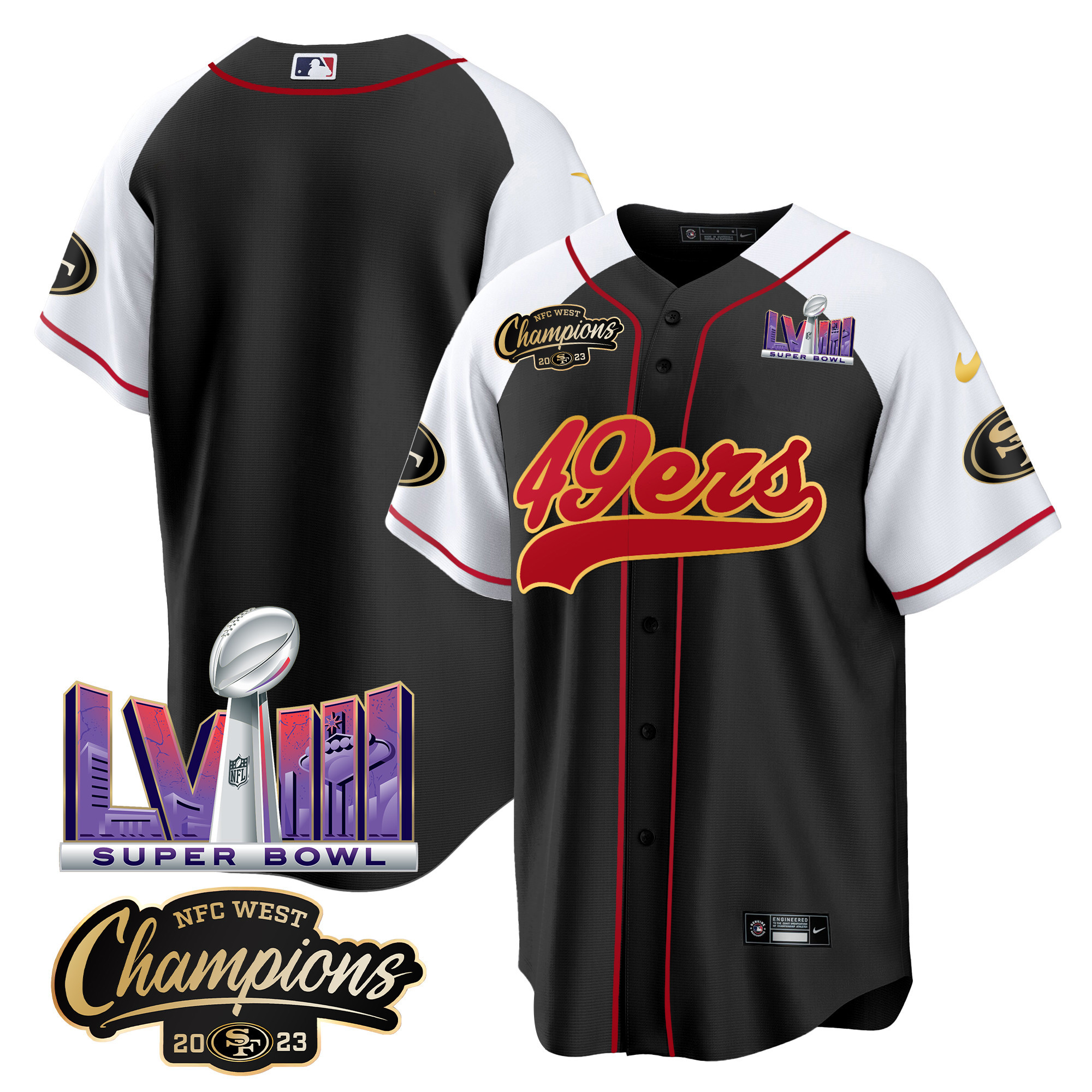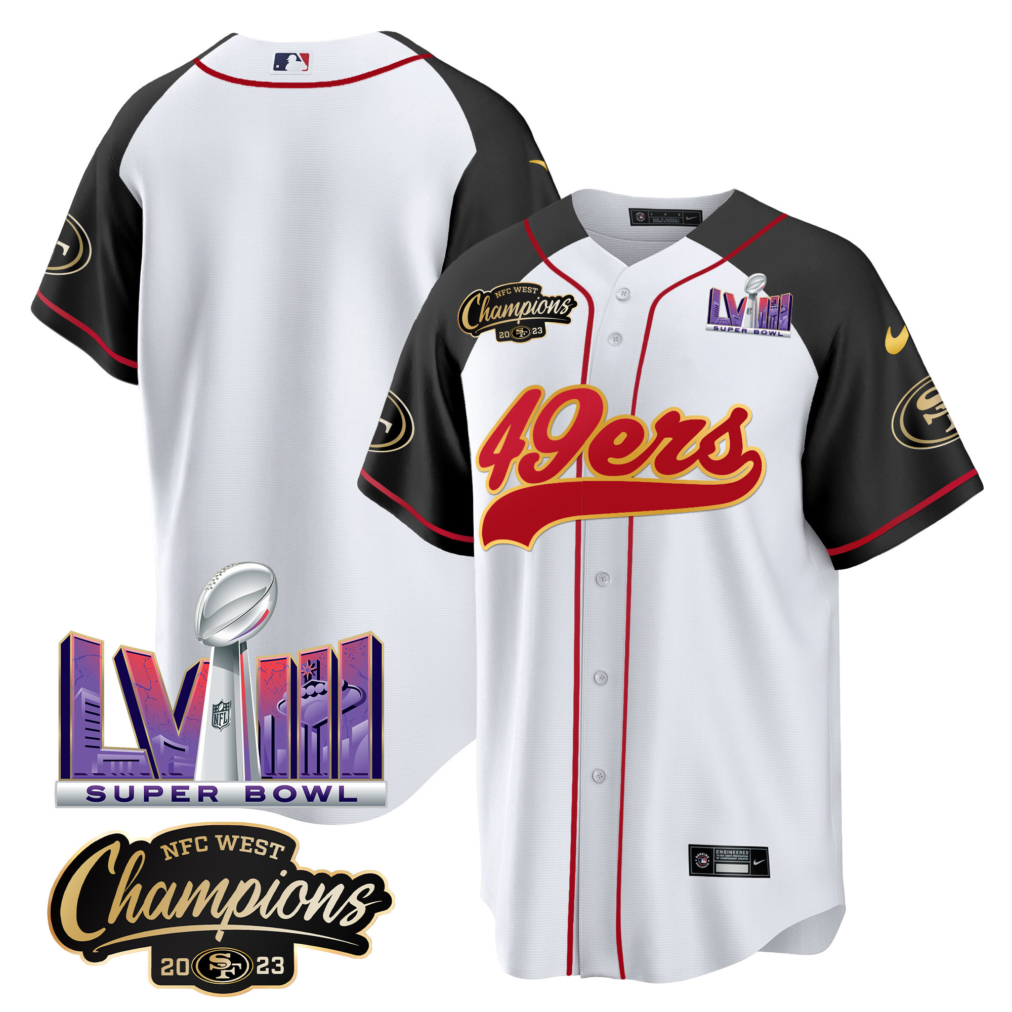 Men’s 49ers NFC West Champions & Super Bowl LVIII Patch Baseball Jersey – All Stitched
