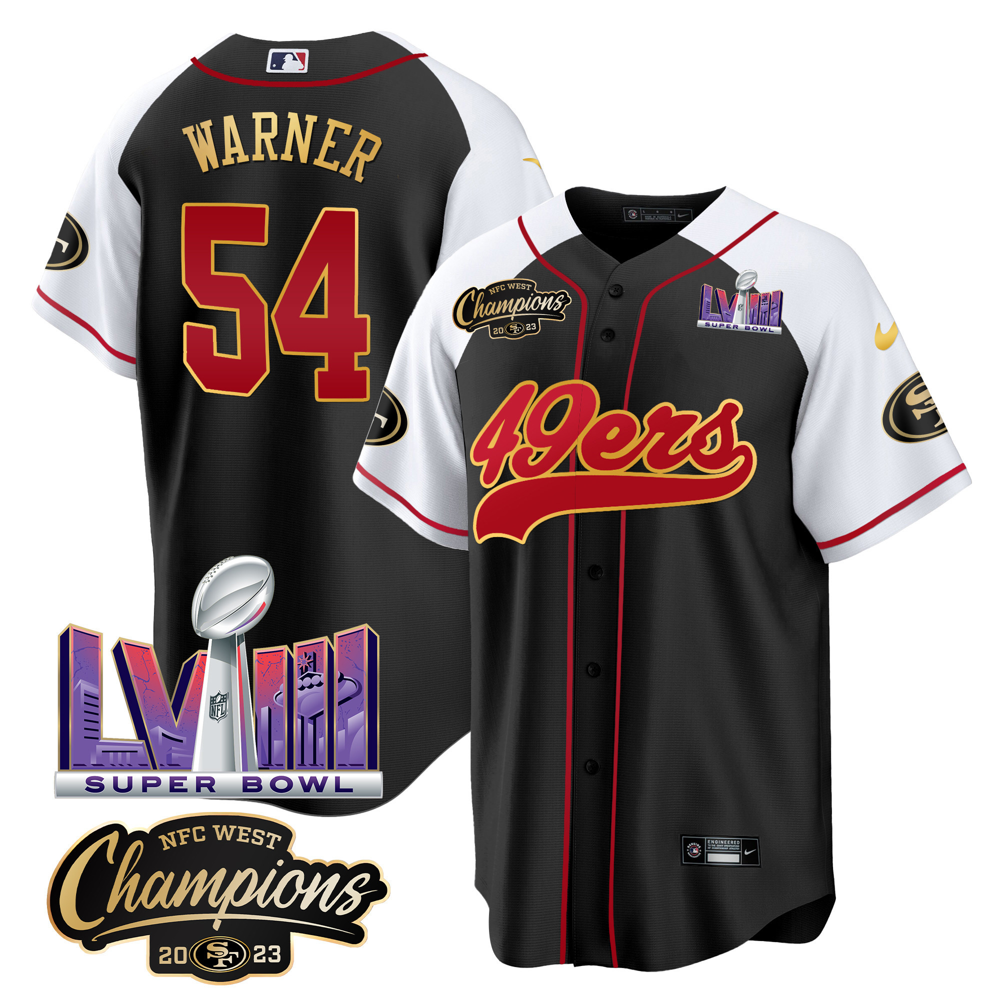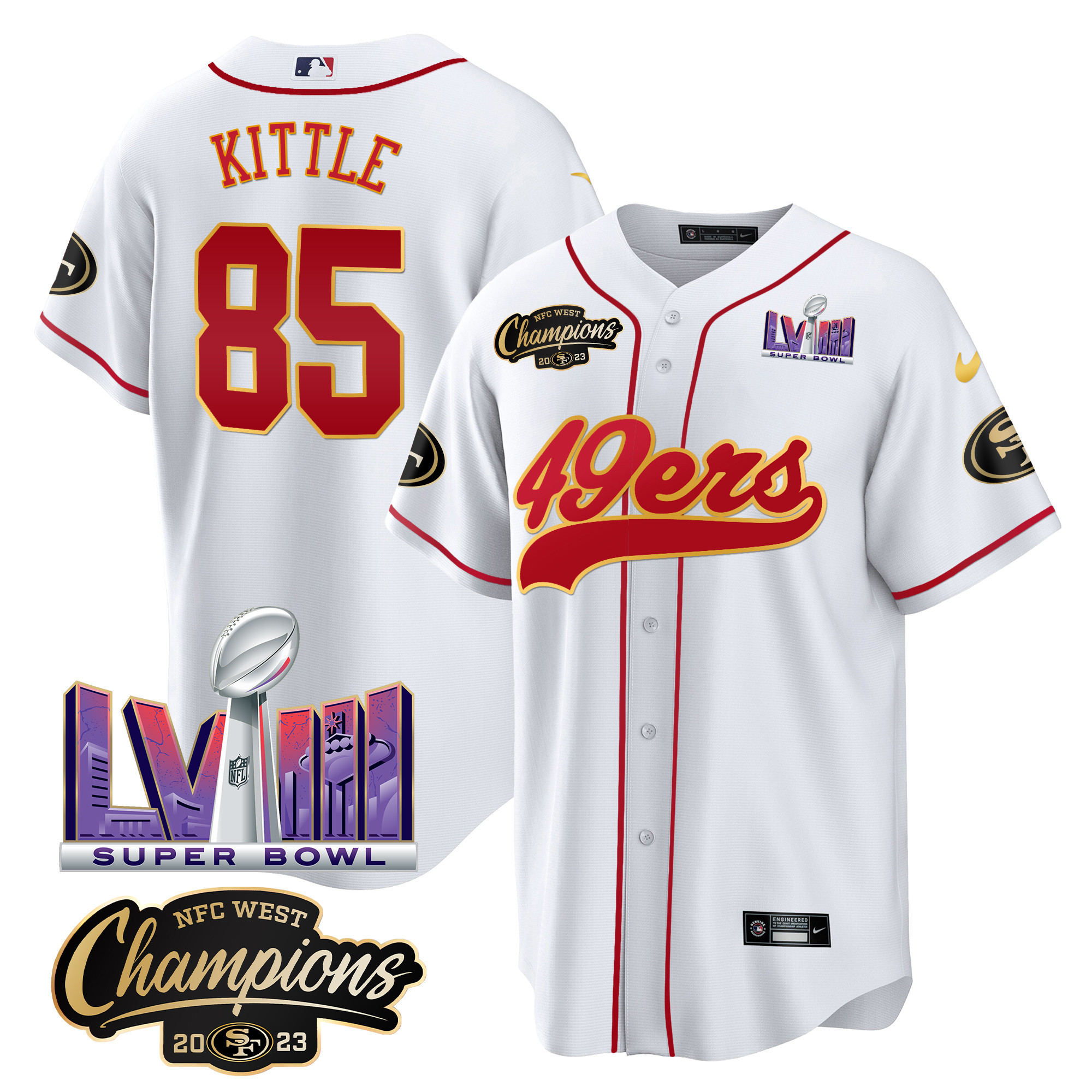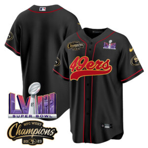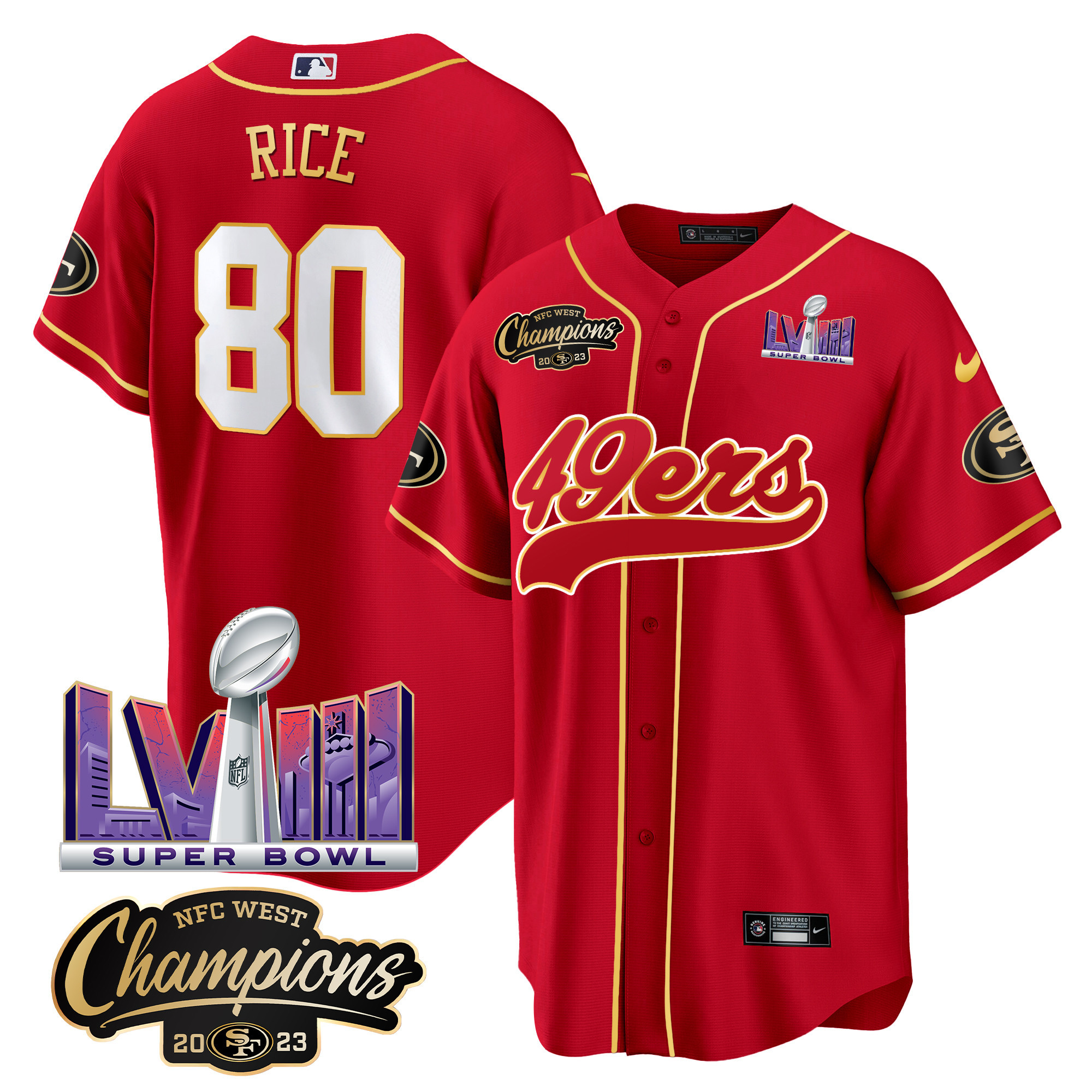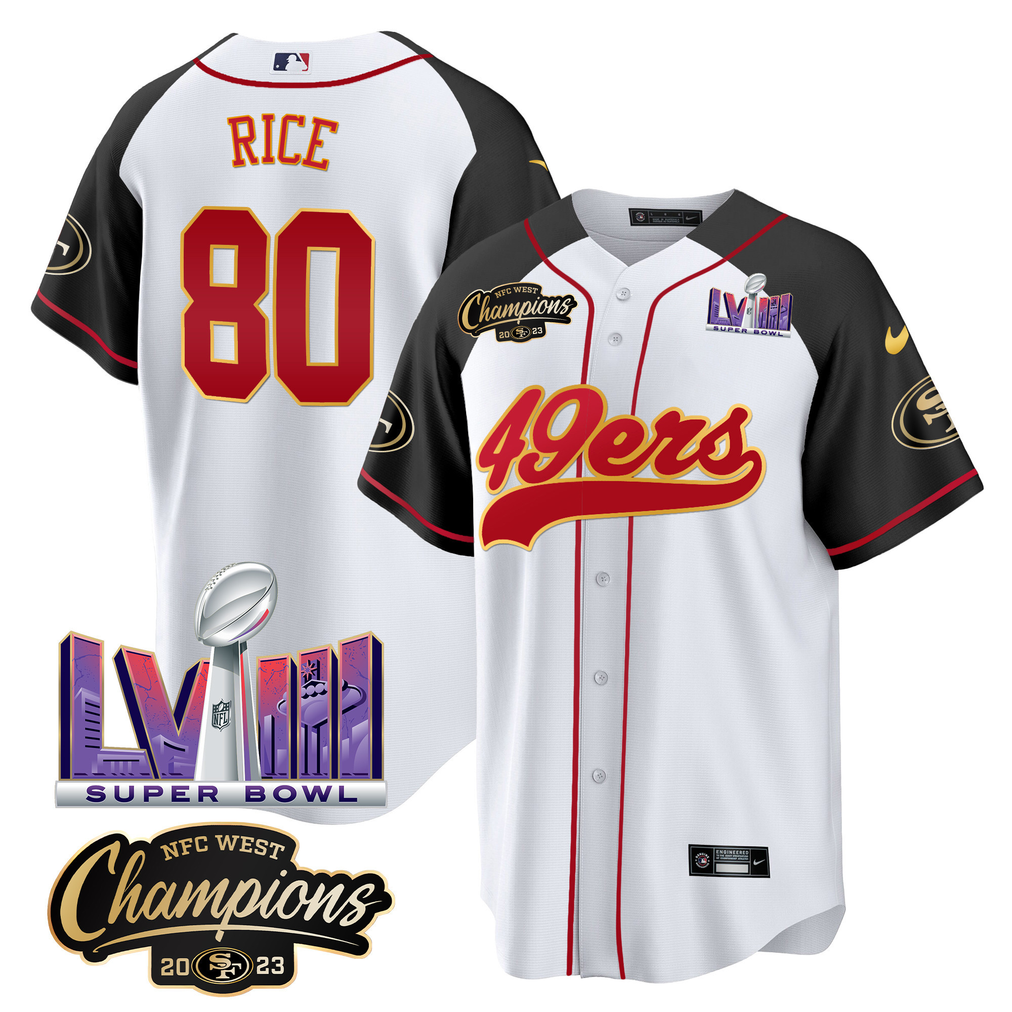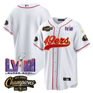 Men’s 49ers NFC West Champions & Super Bowl LVIII Patch Baseball Jersey – All Stitched