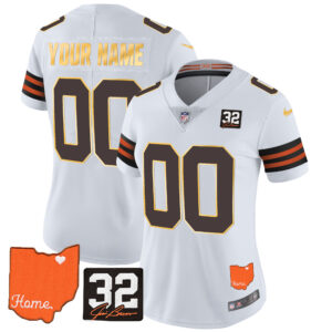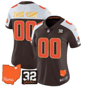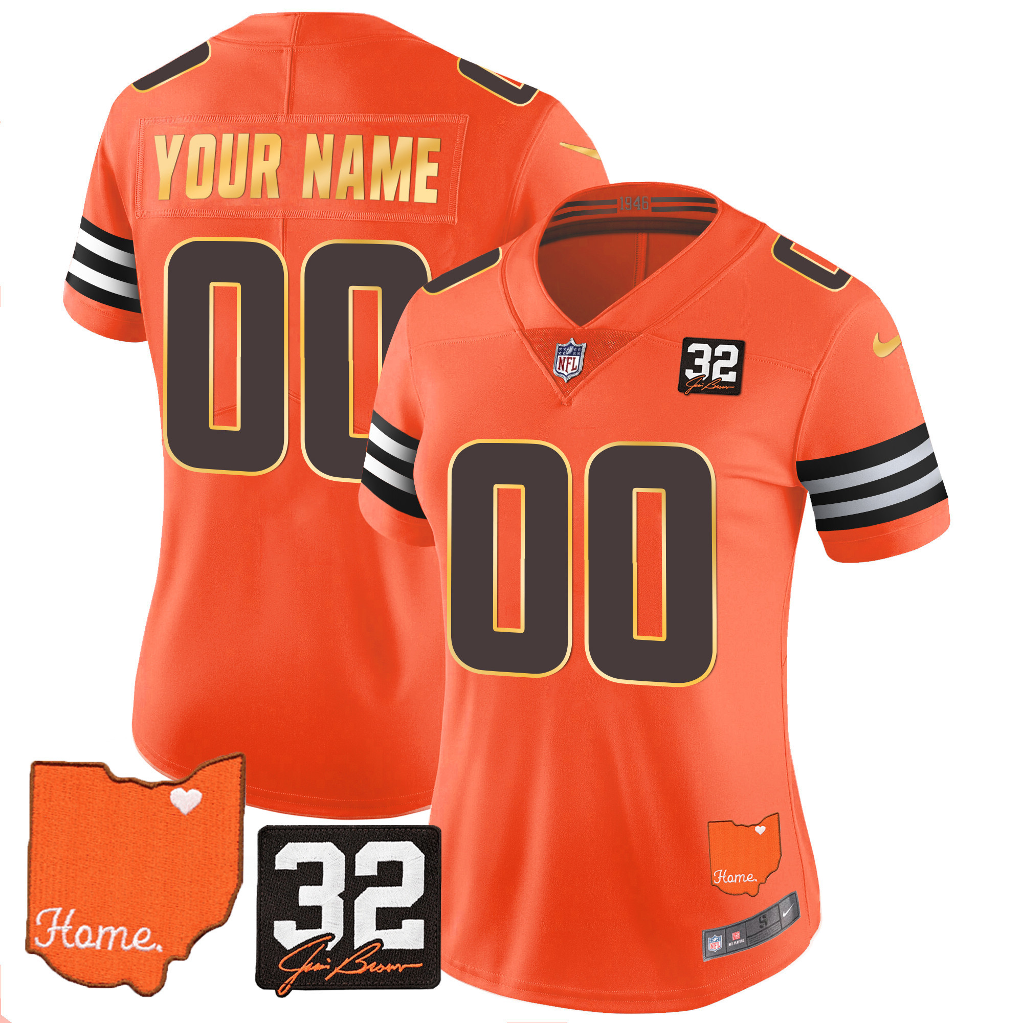 Men’s Browns #32 Jim Brown Memorial & Home Patch Gold Trim Custom Jersey – All Stitched