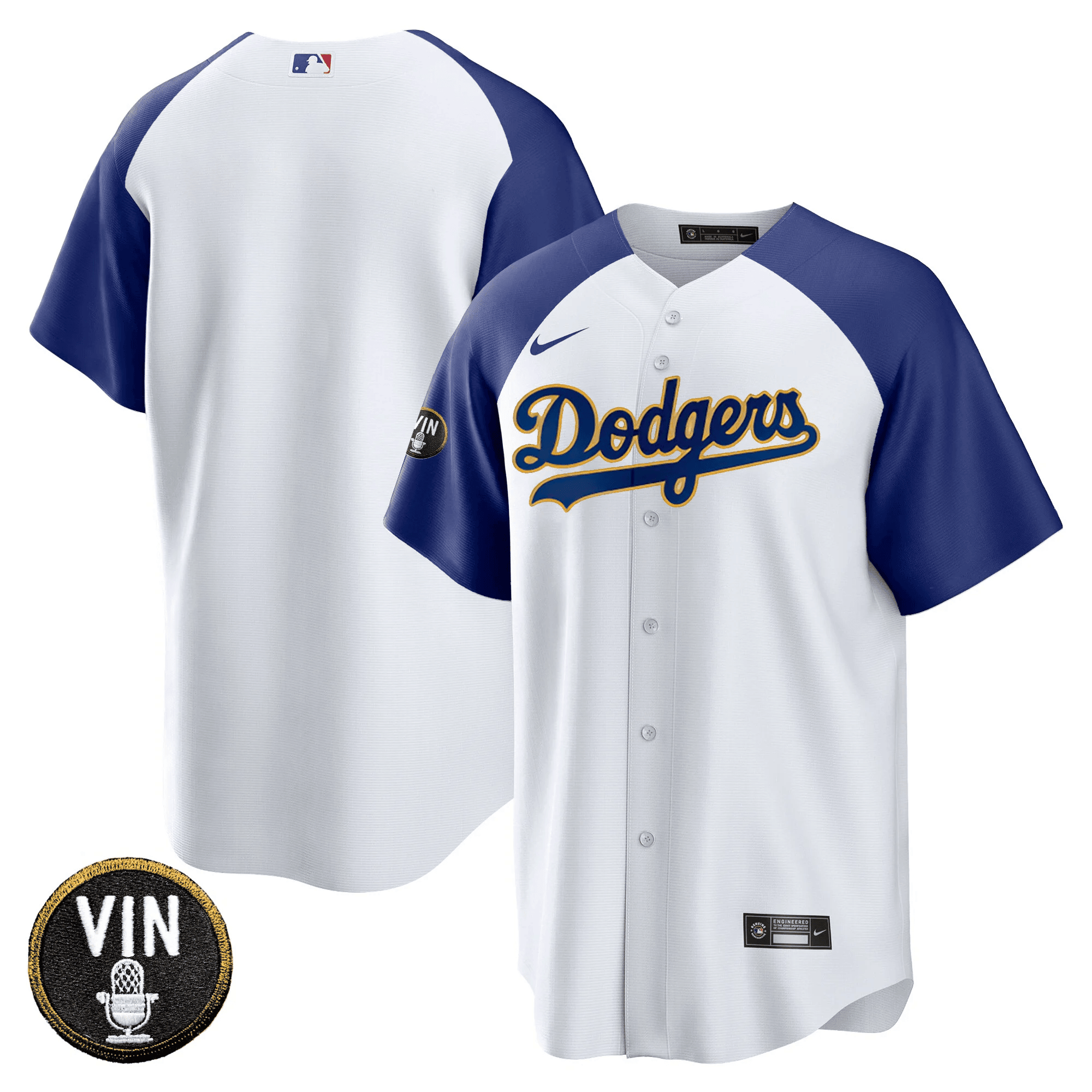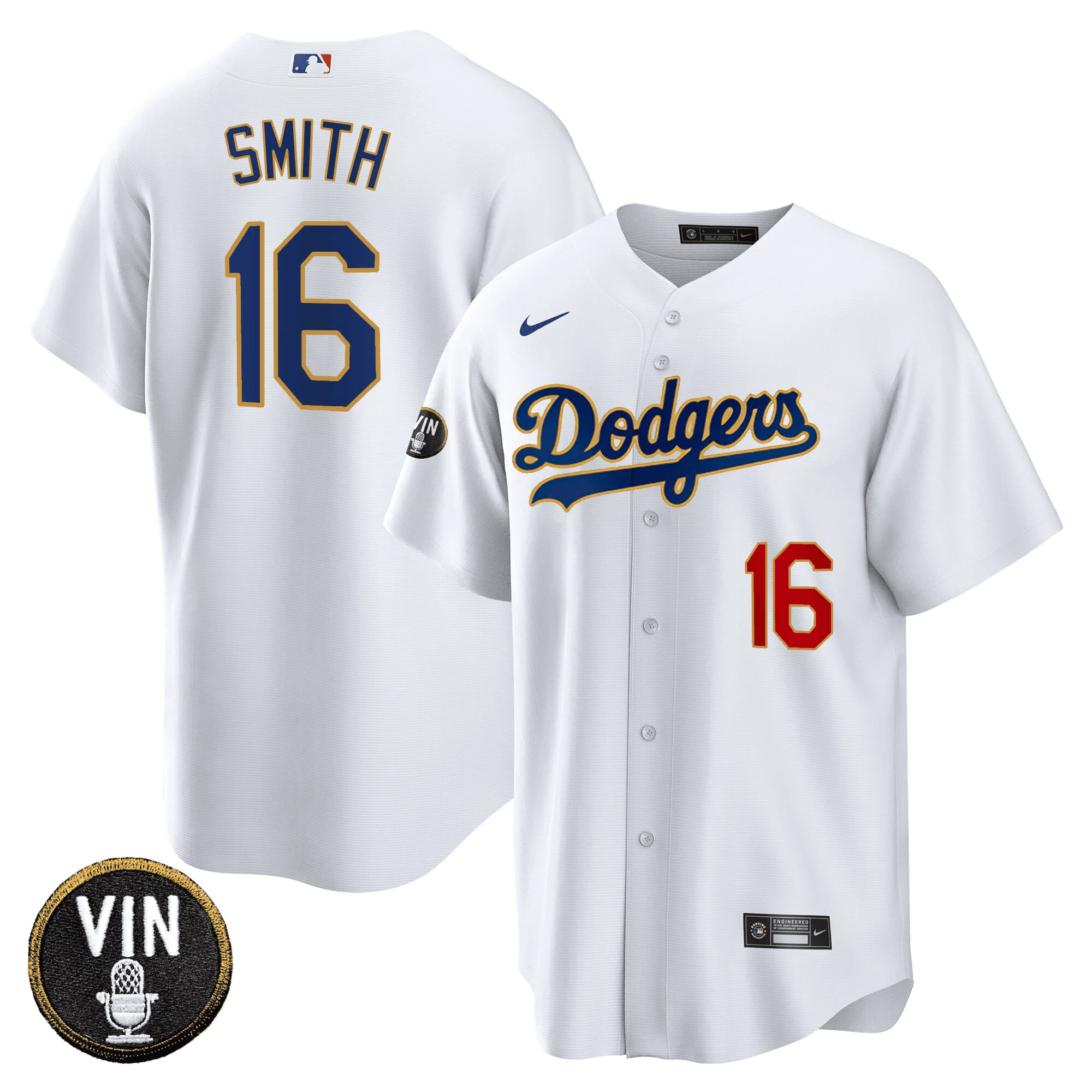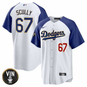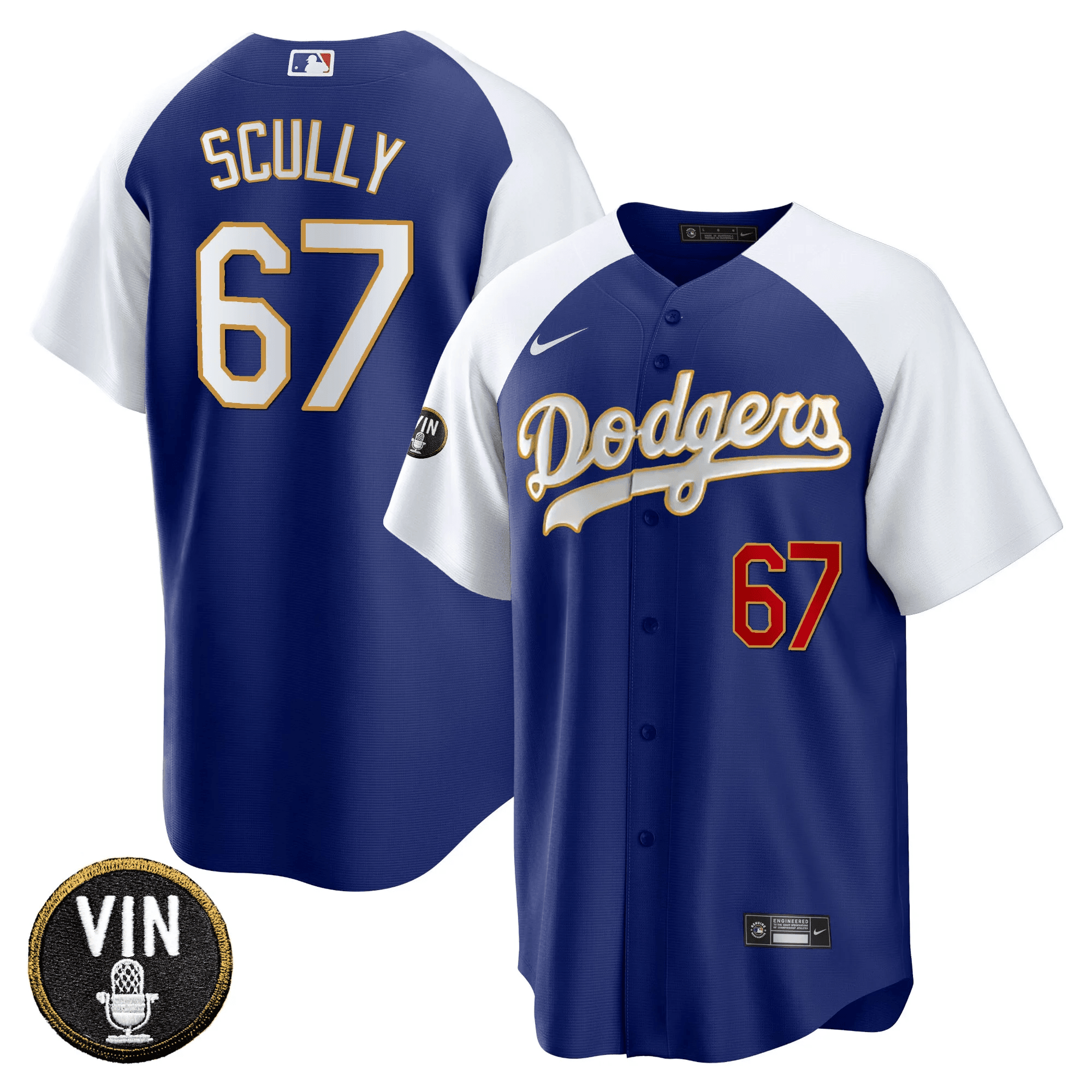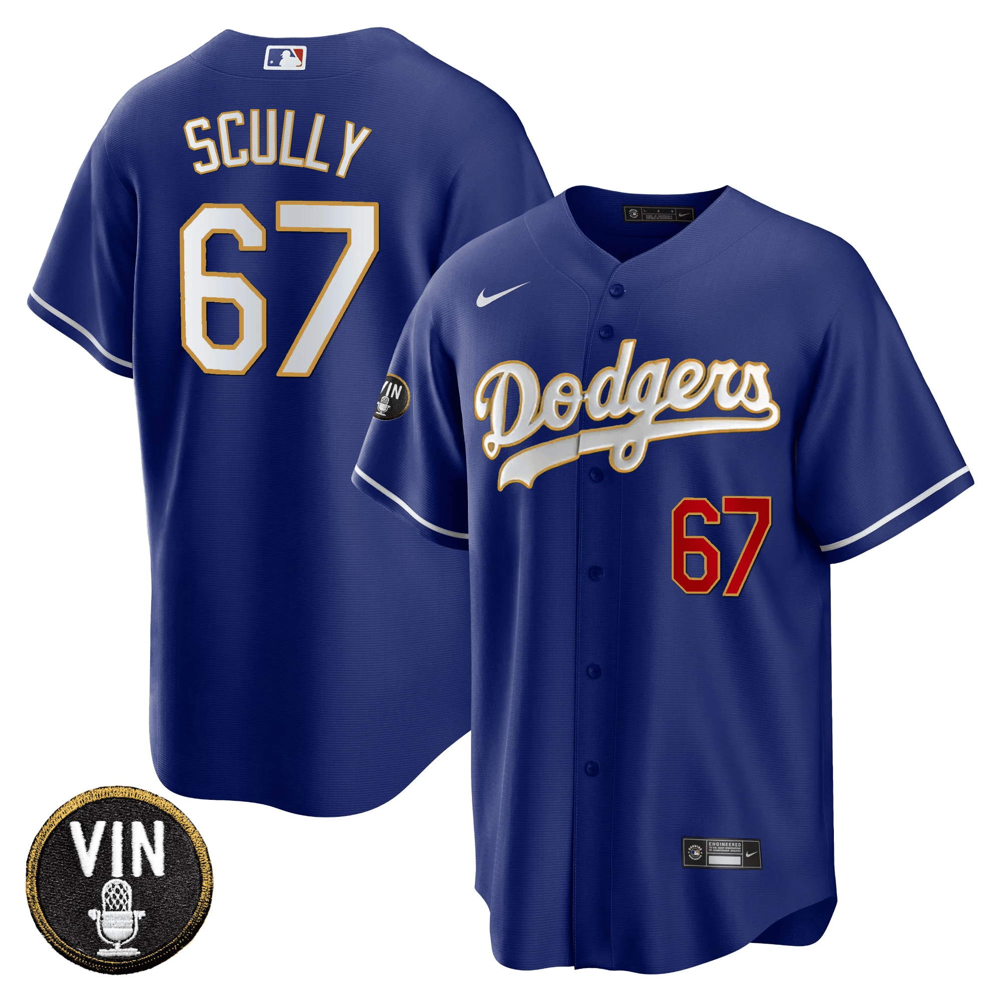 Men’s Dodgers Vin Scully Patch Cool Base Gold Trim Jersey – All Stitched