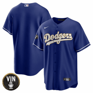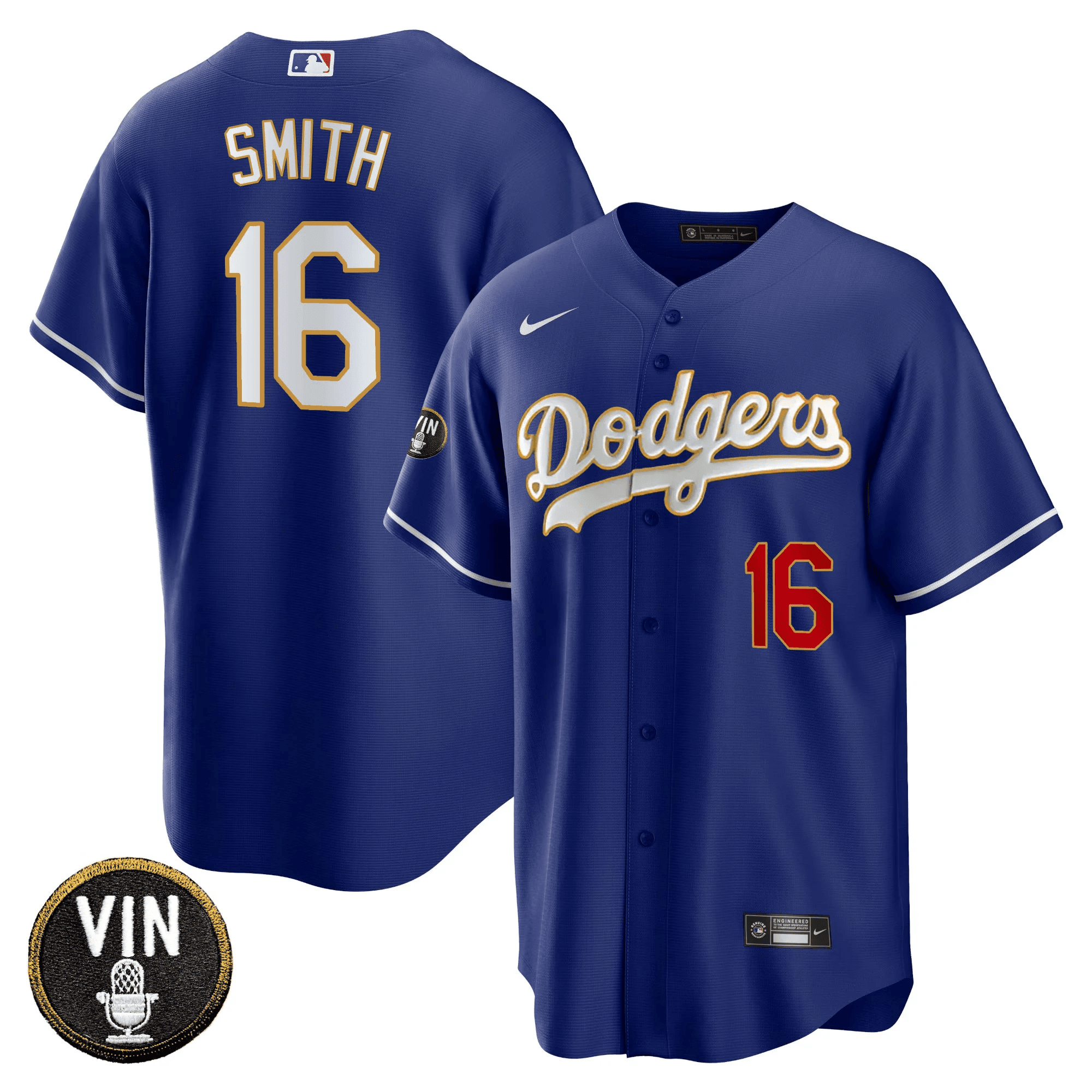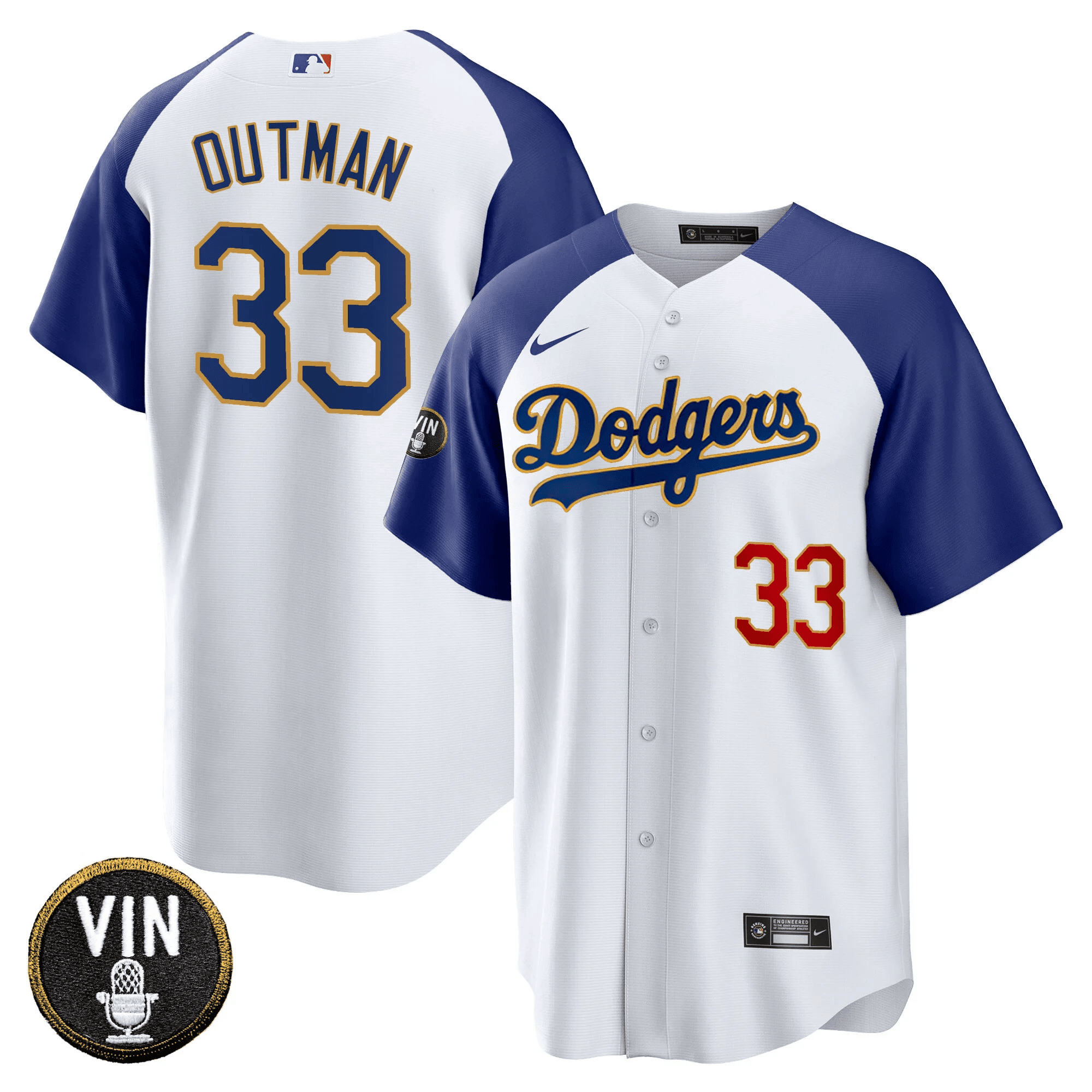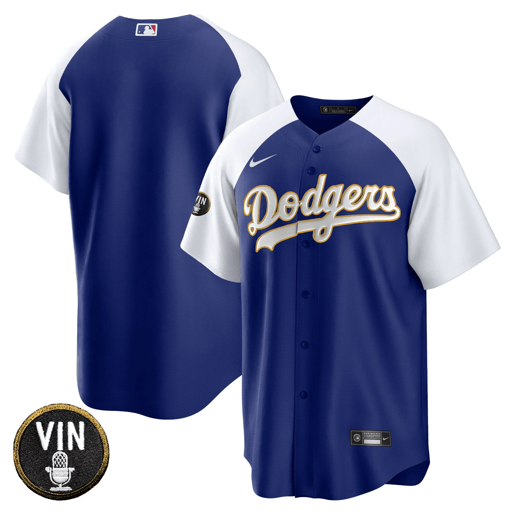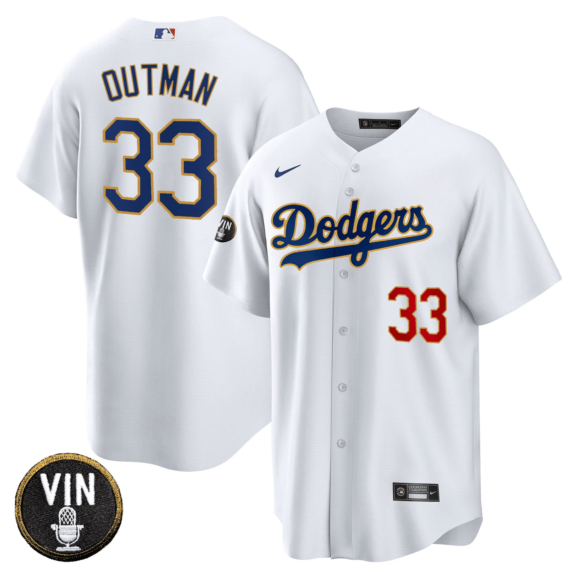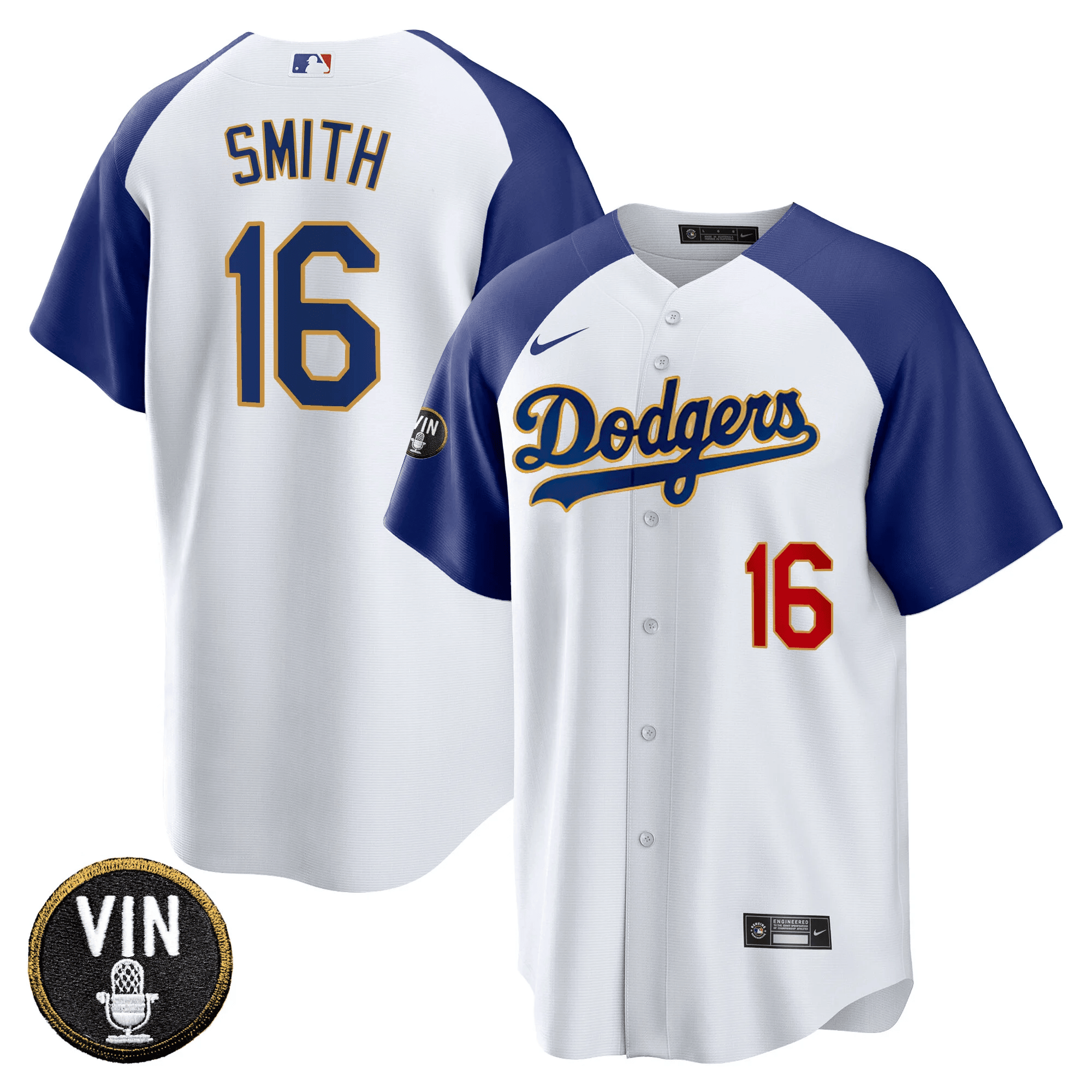Men’s Dodgers Vin Scully Patch Cool Base Gold Trim Jersey – All Stitched
