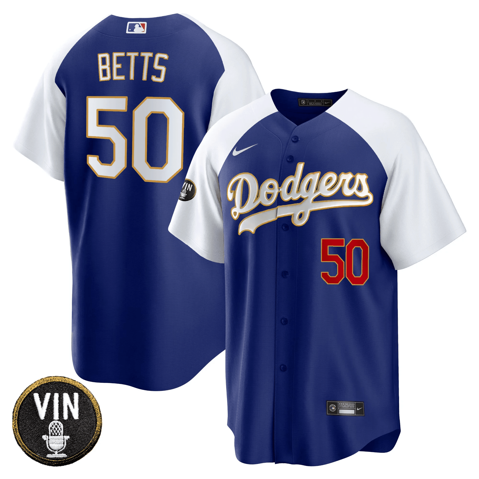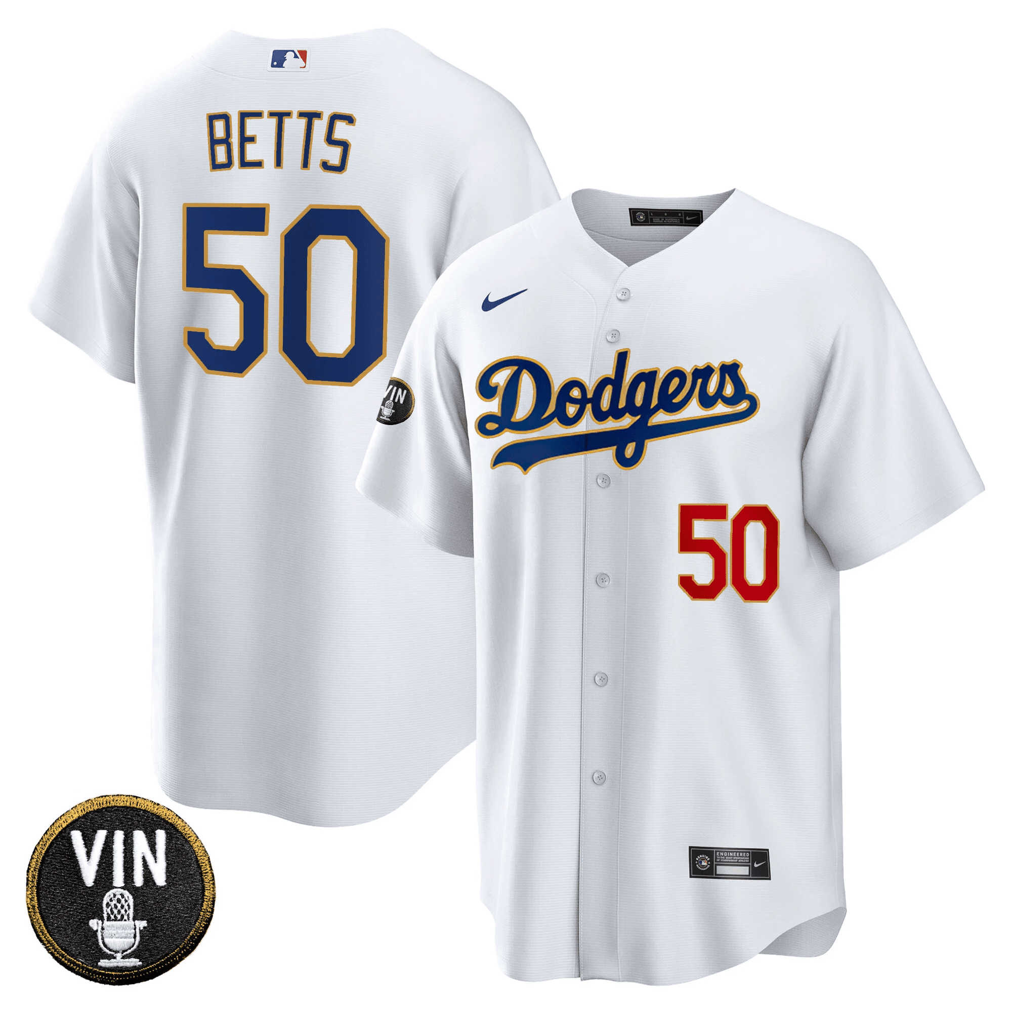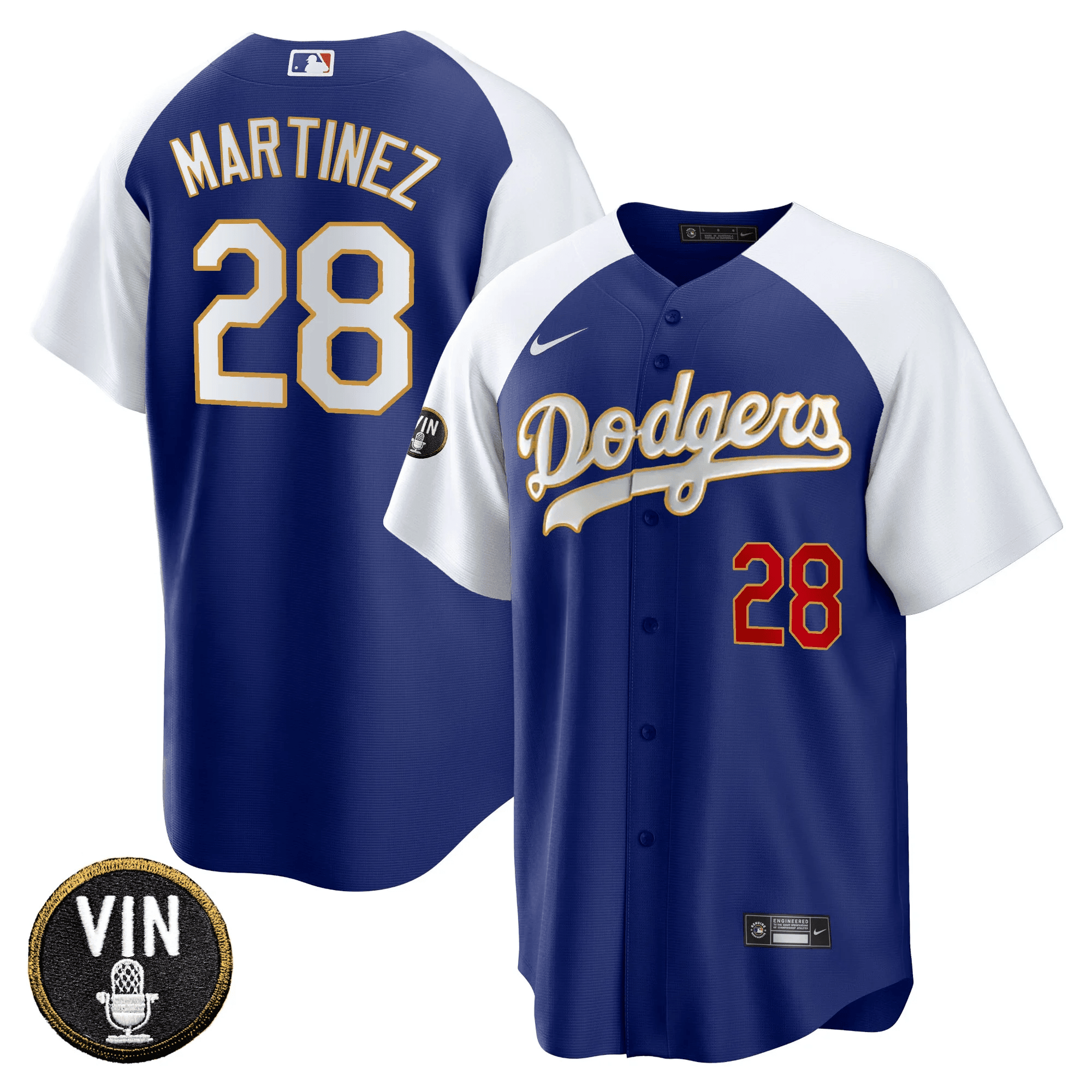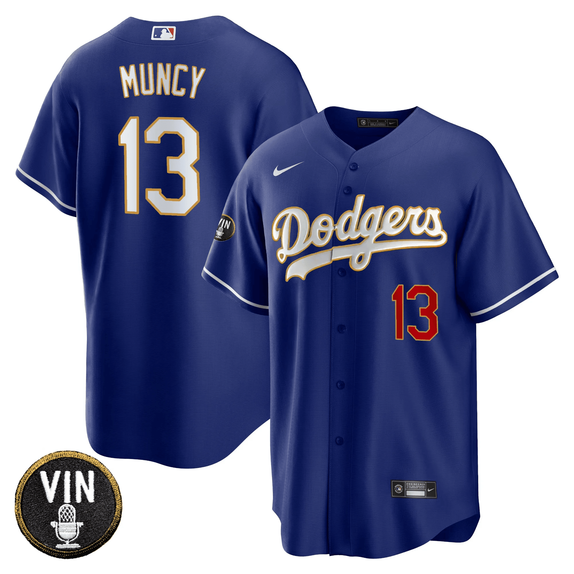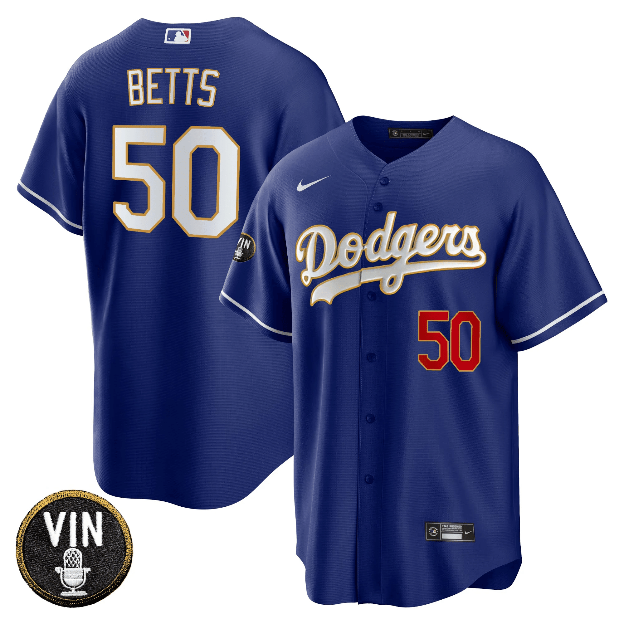 Men’s Dodgers Vin Scully Patch Cool Base Gold Trim Jersey – All Stitched