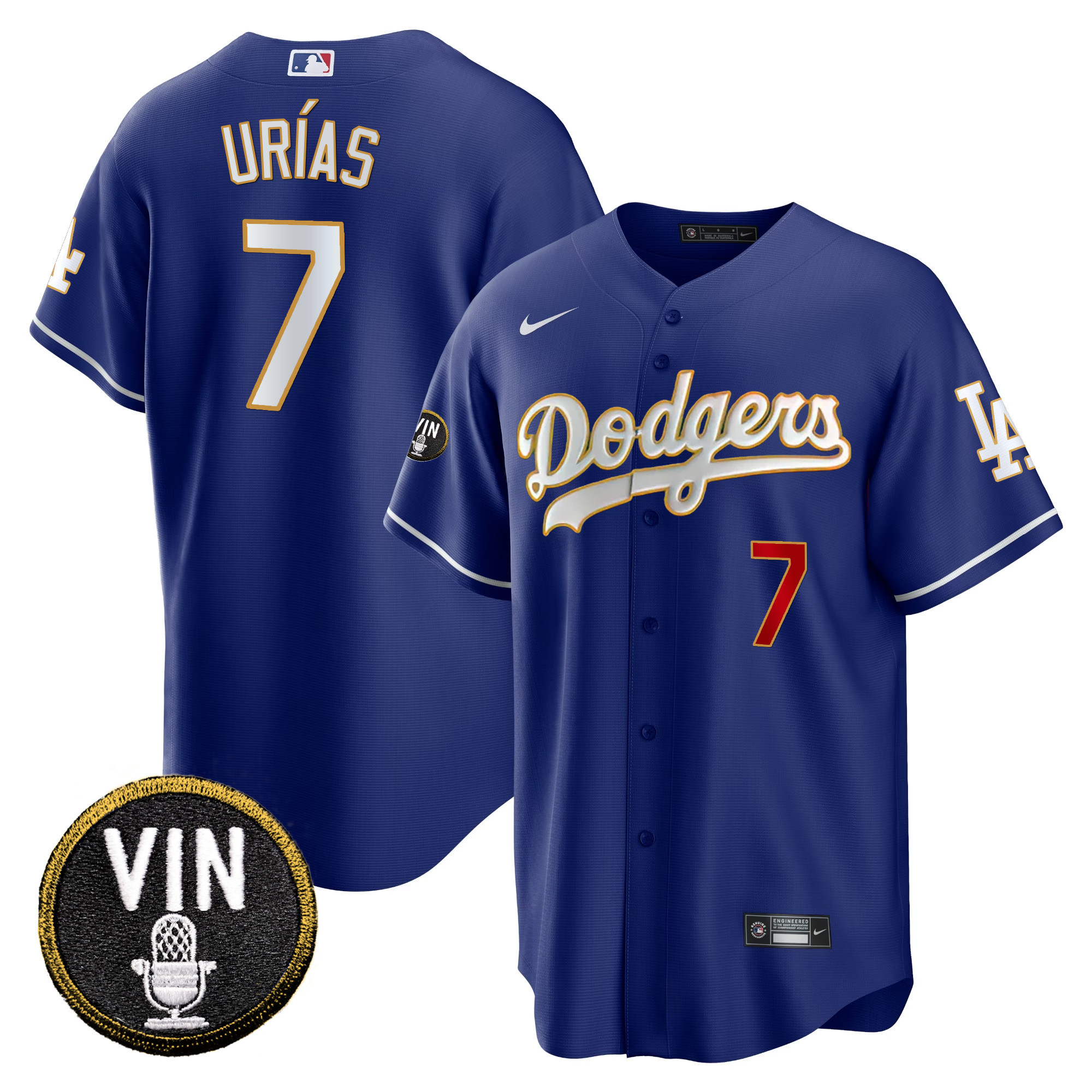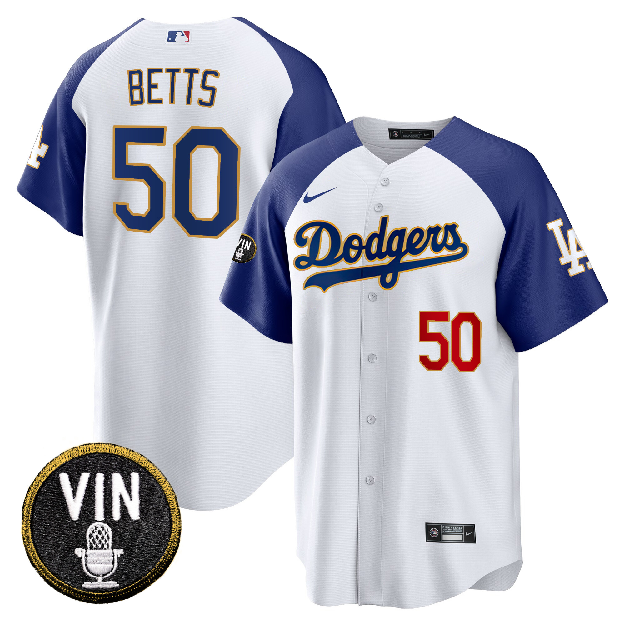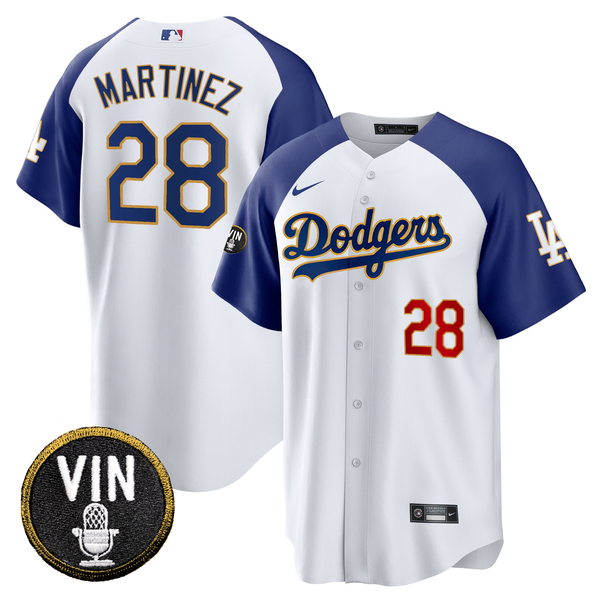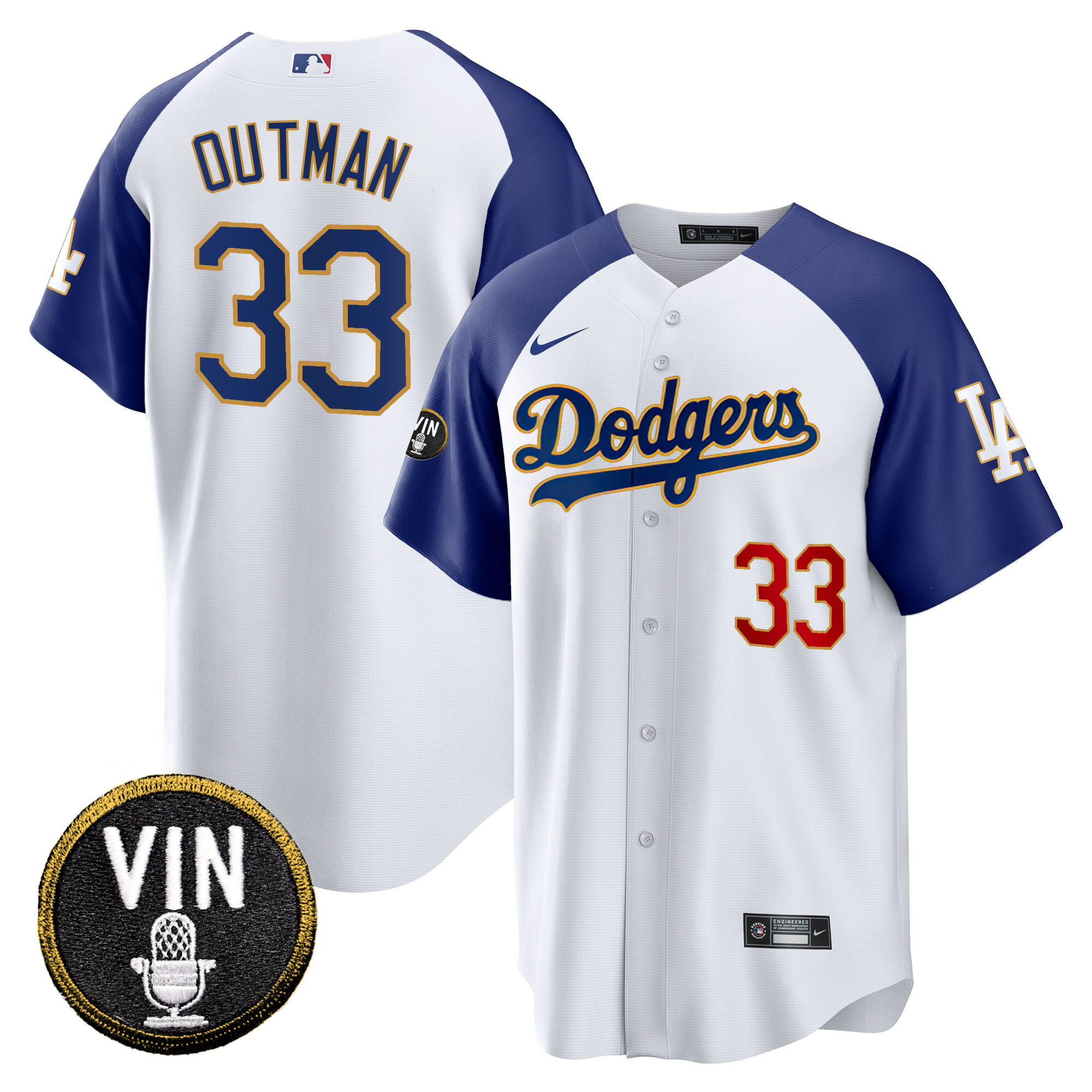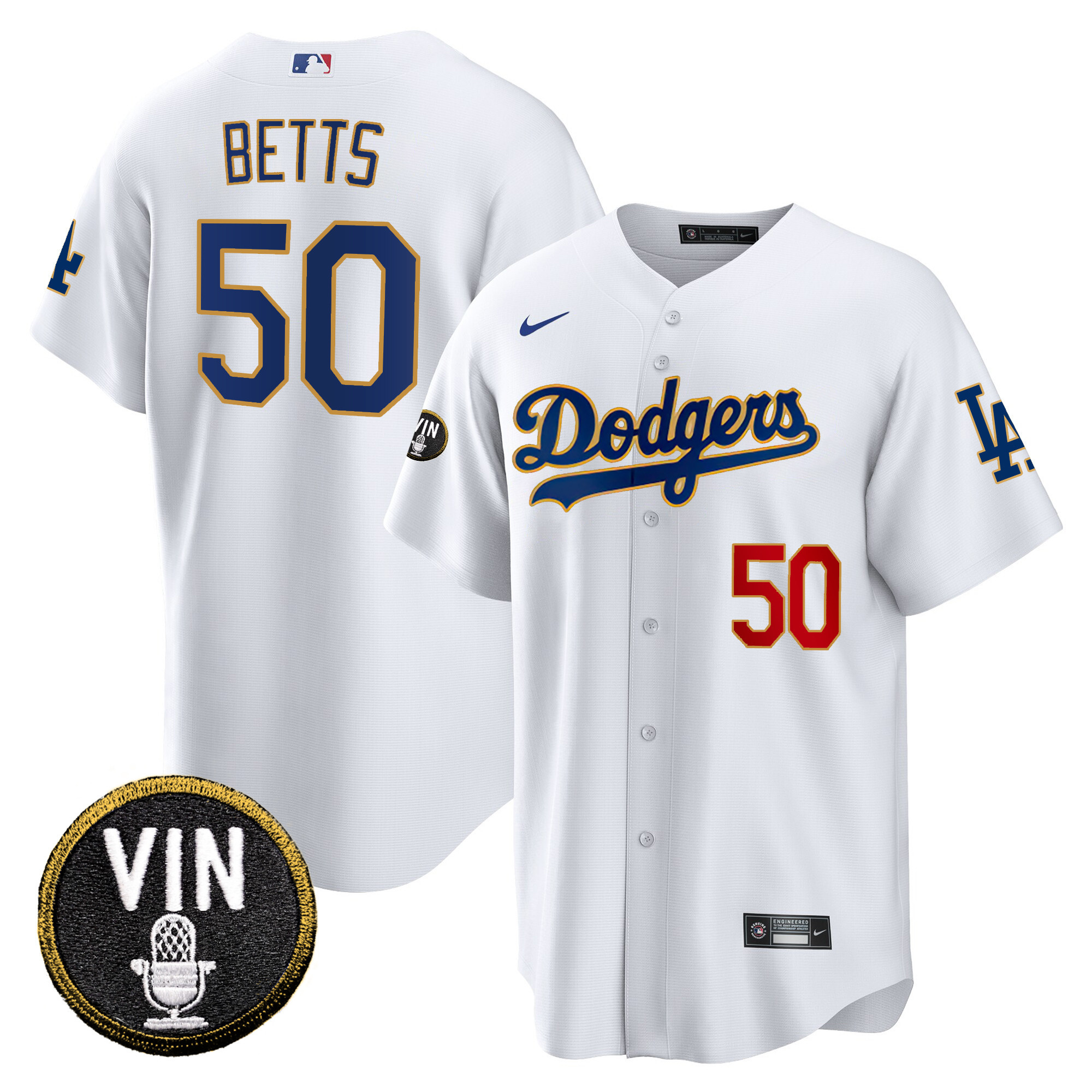 Men’s Dodgers Vin Scully Patch Cool Base Gold Trim Jersey V2 – All Stitched