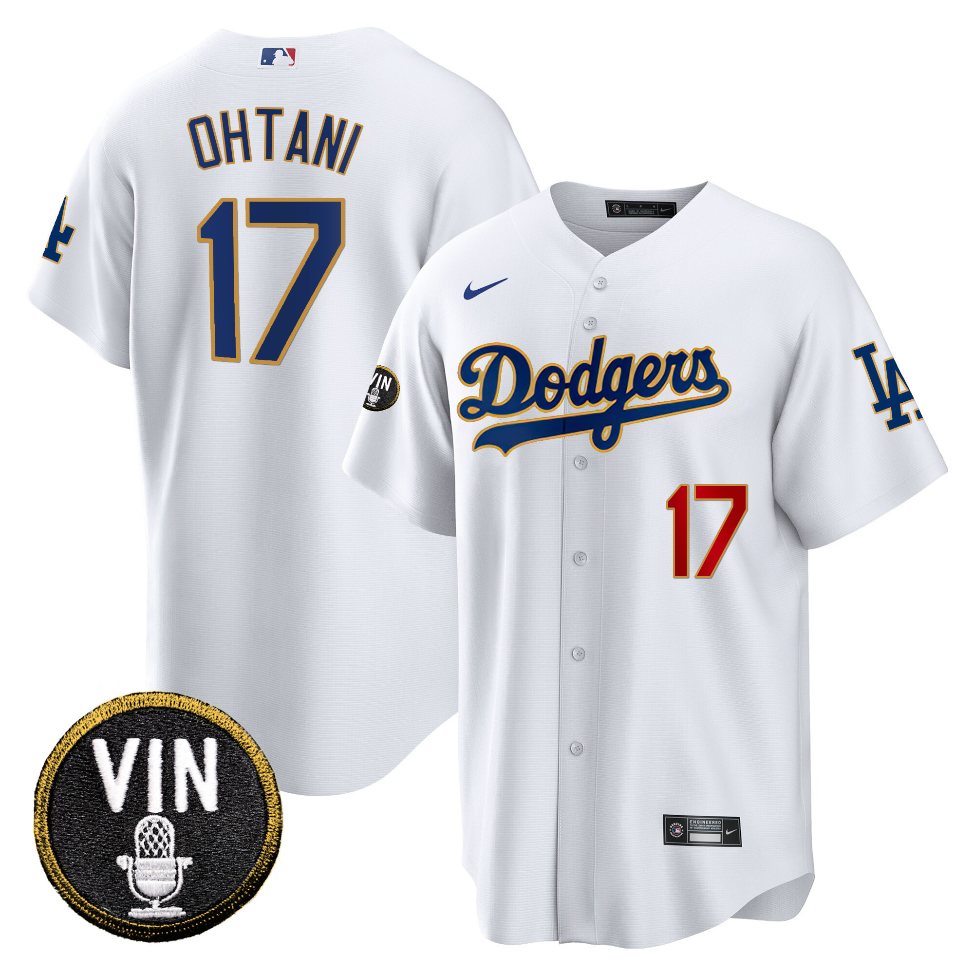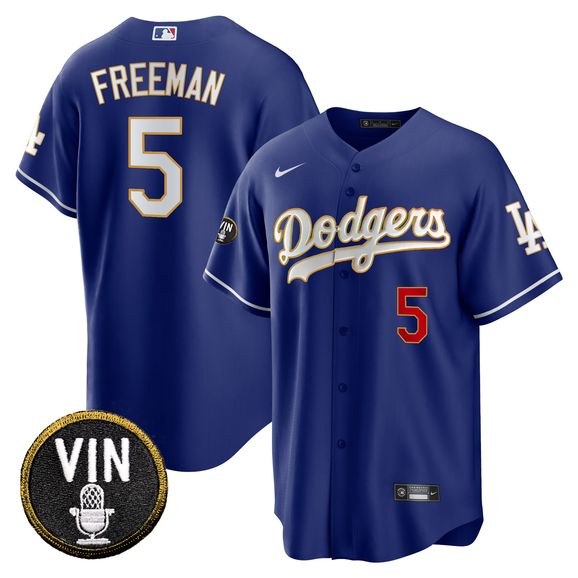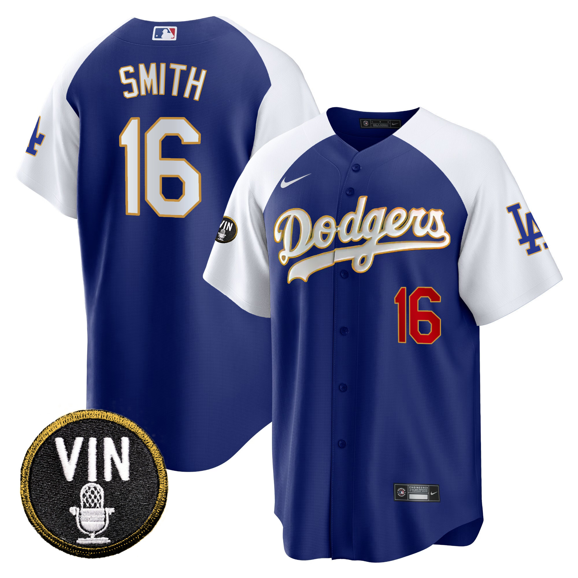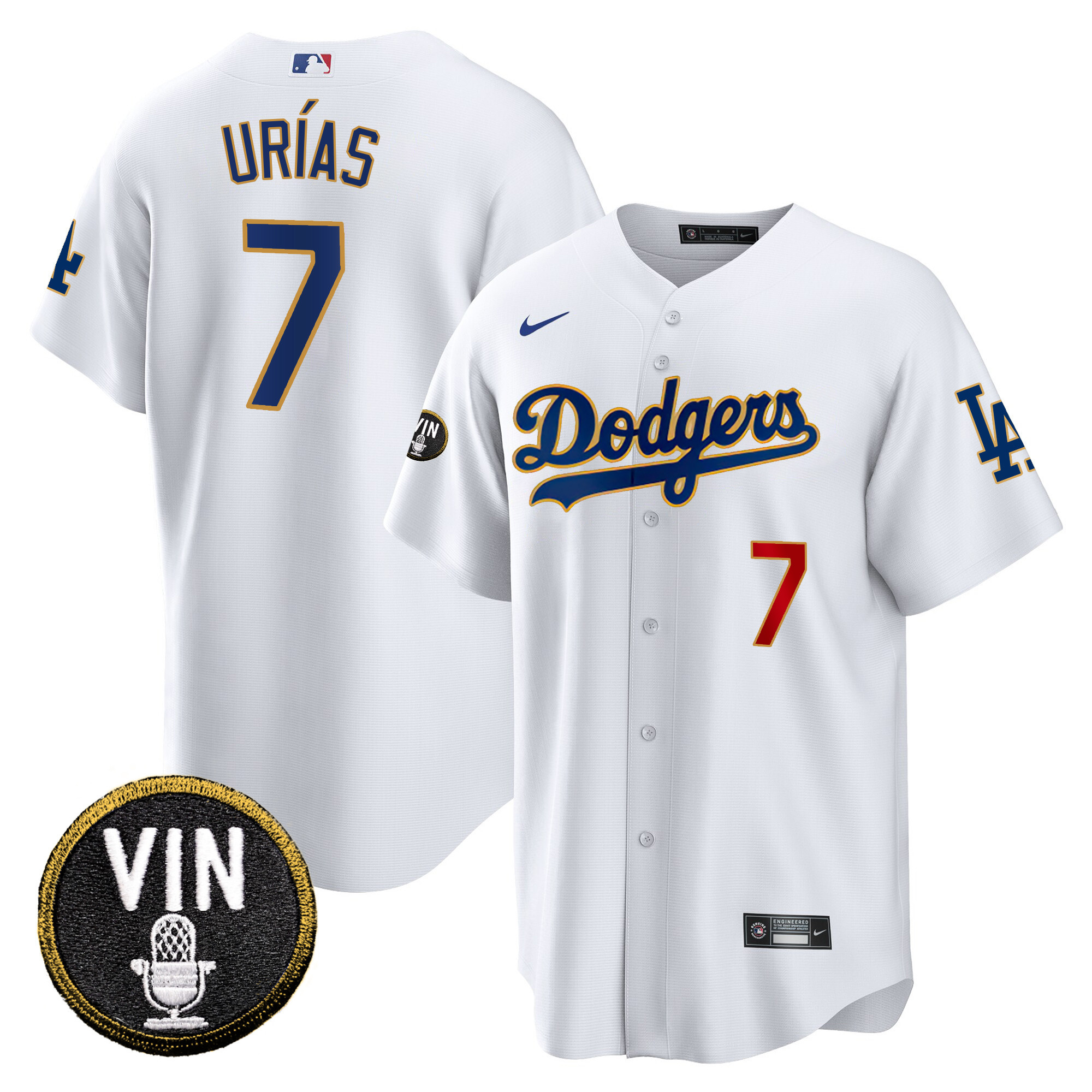 Men’s Dodgers Vin Scully Patch Cool Base Gold Trim Jersey V2 – All Stitched