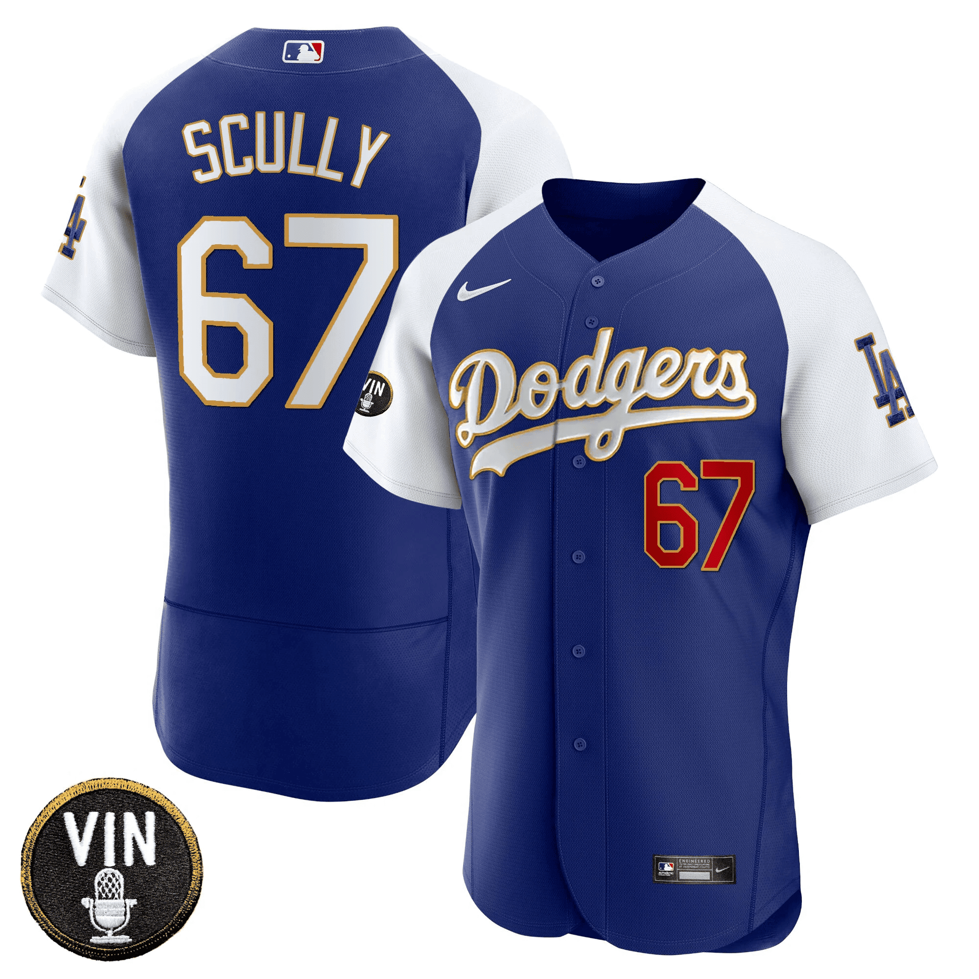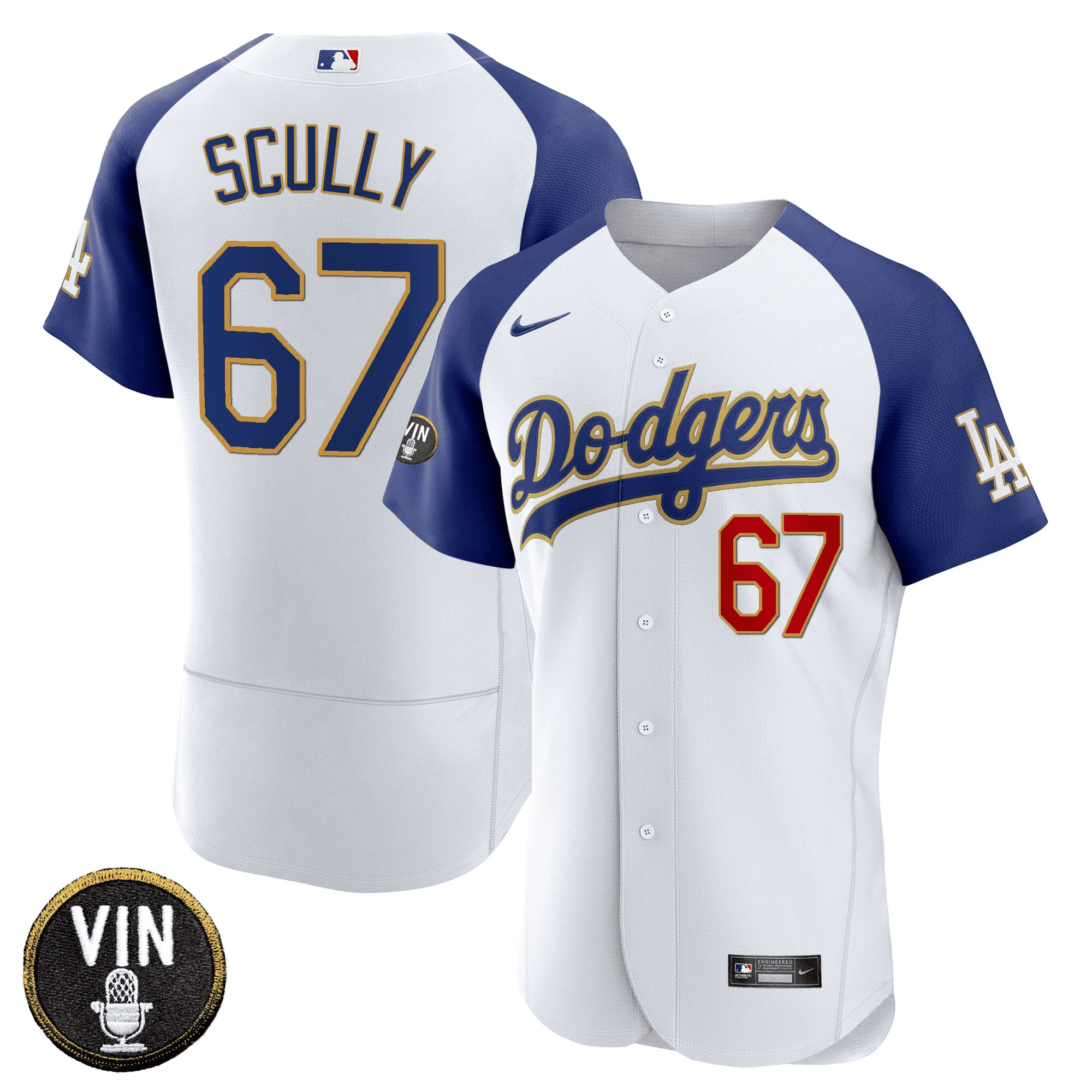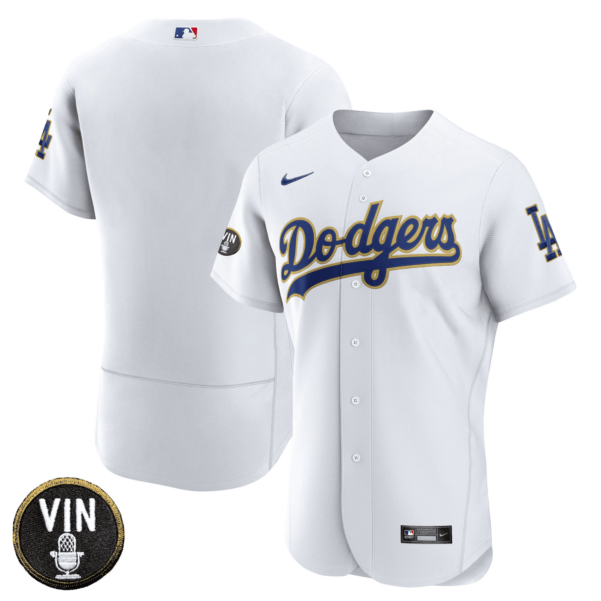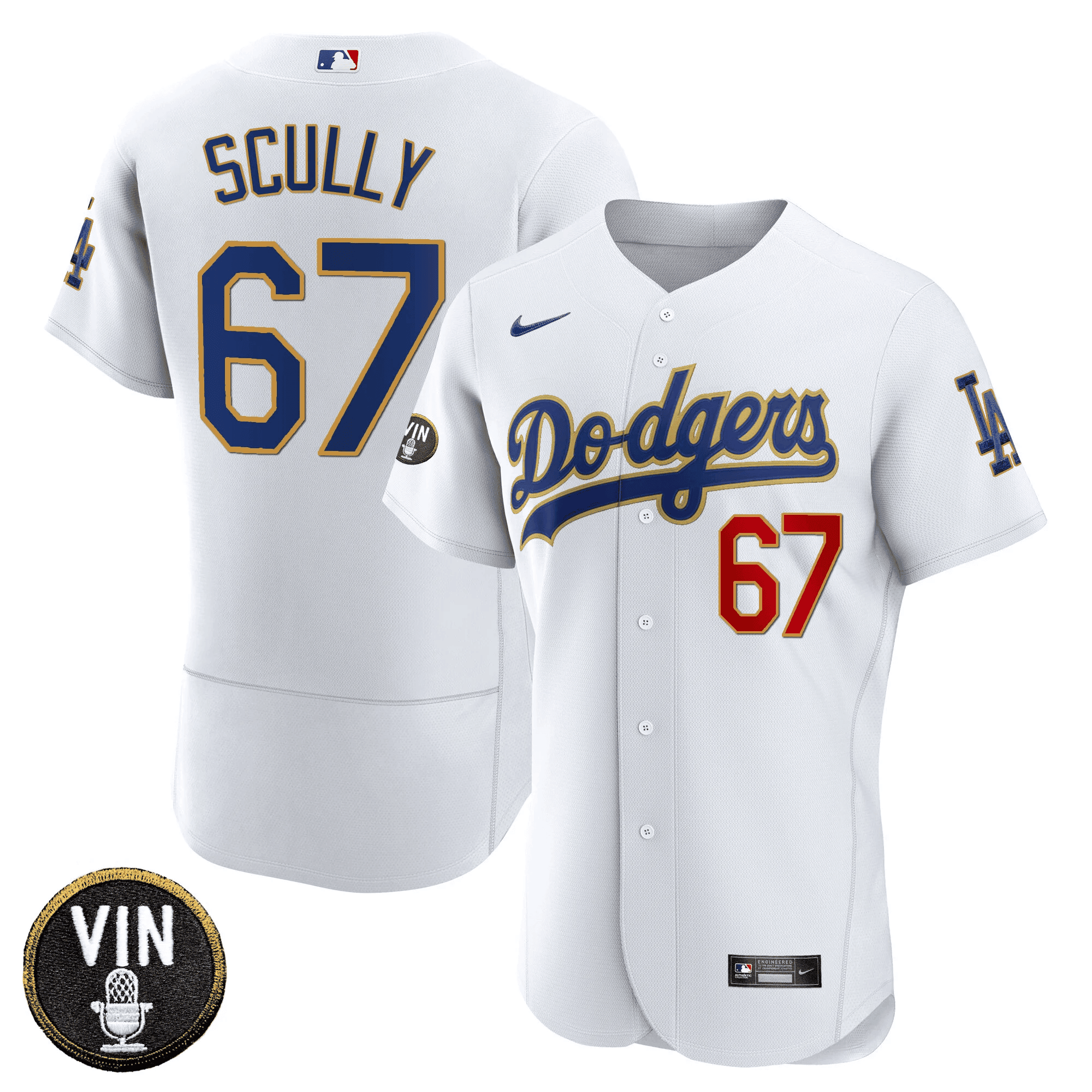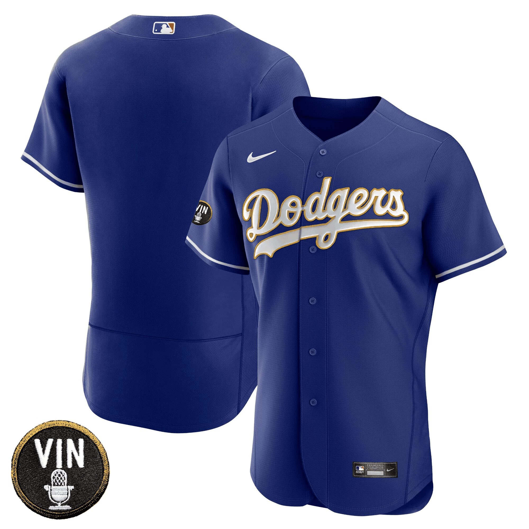 Men’s Dodgers Vin Scully Patch Flex Base Gold Trim Jersey – All Stitched