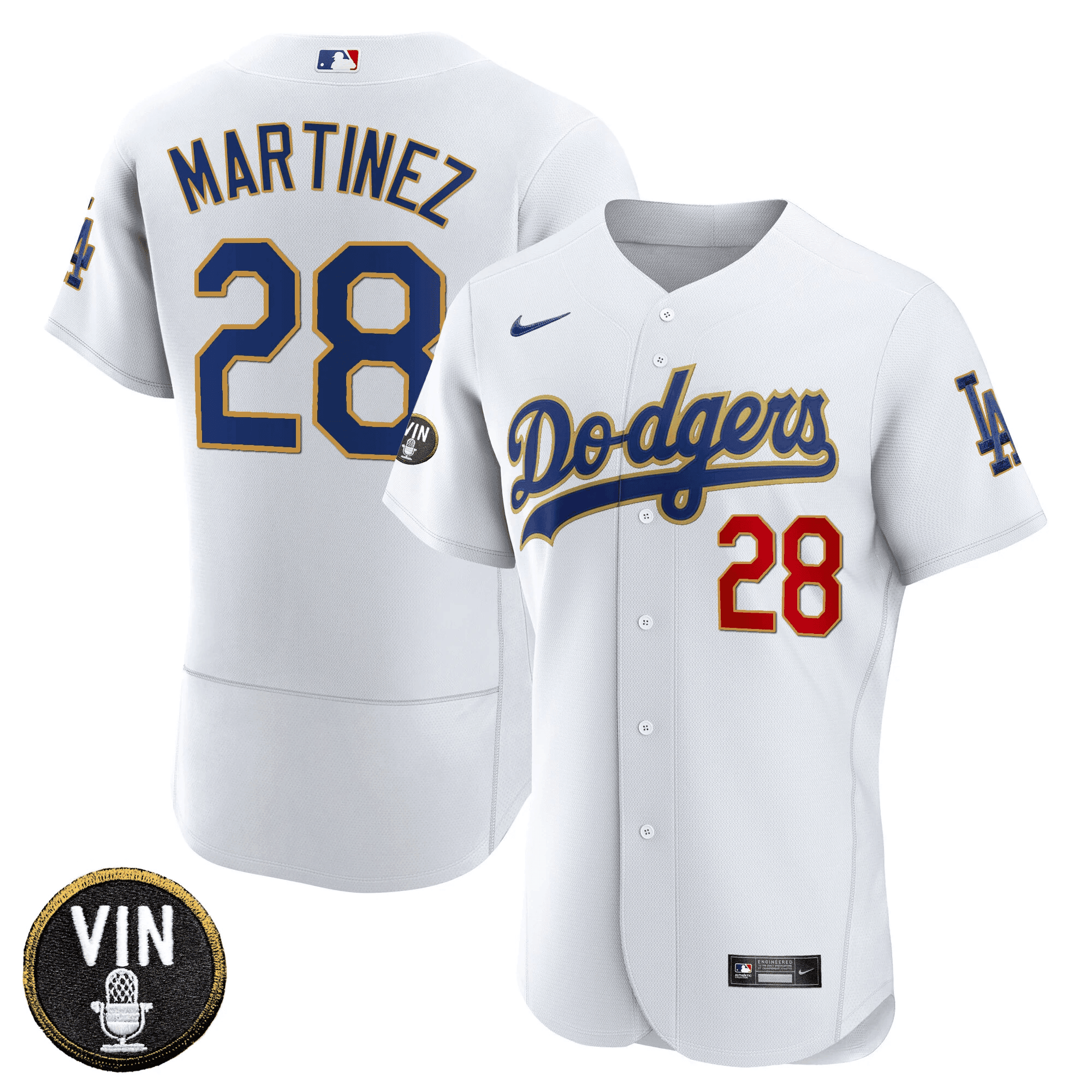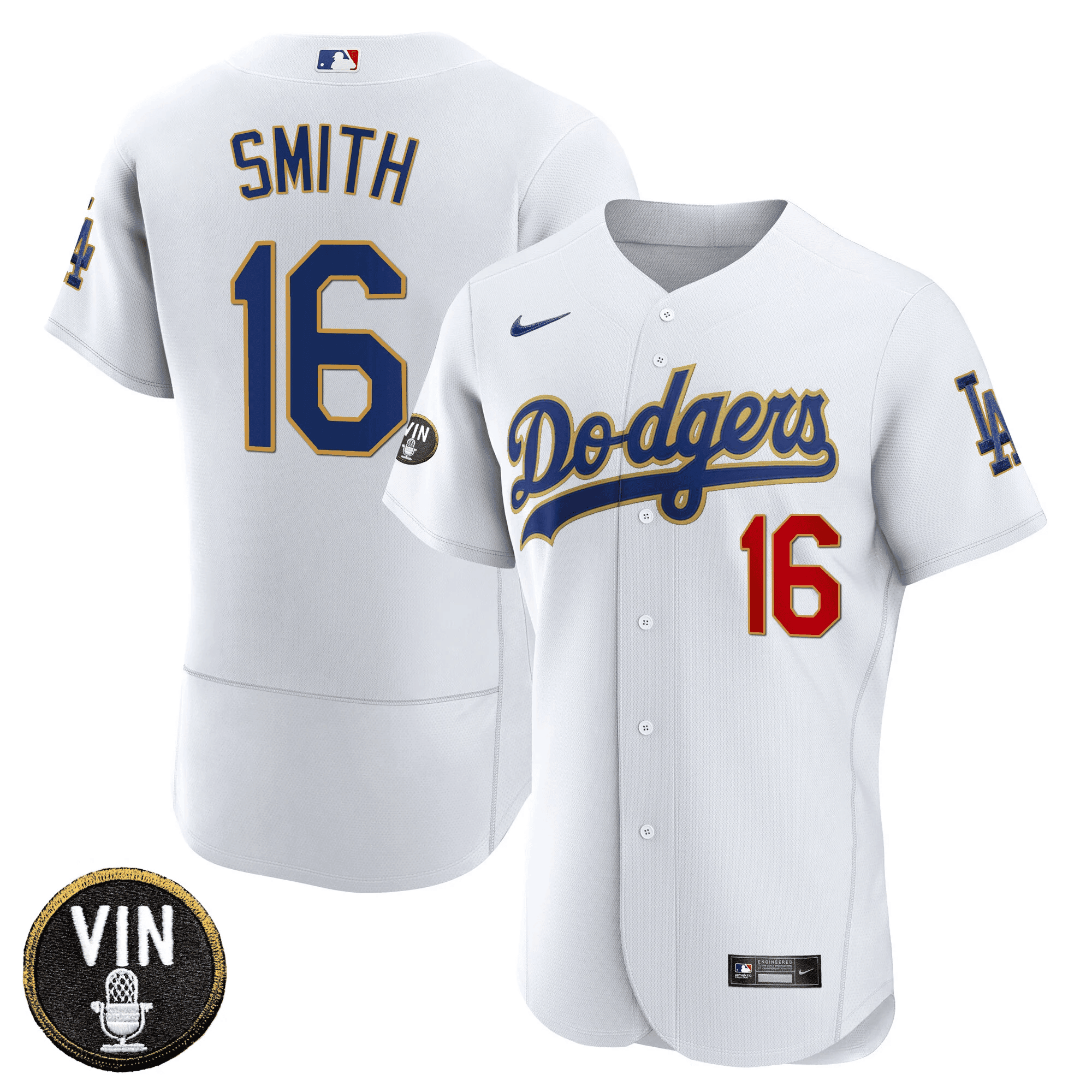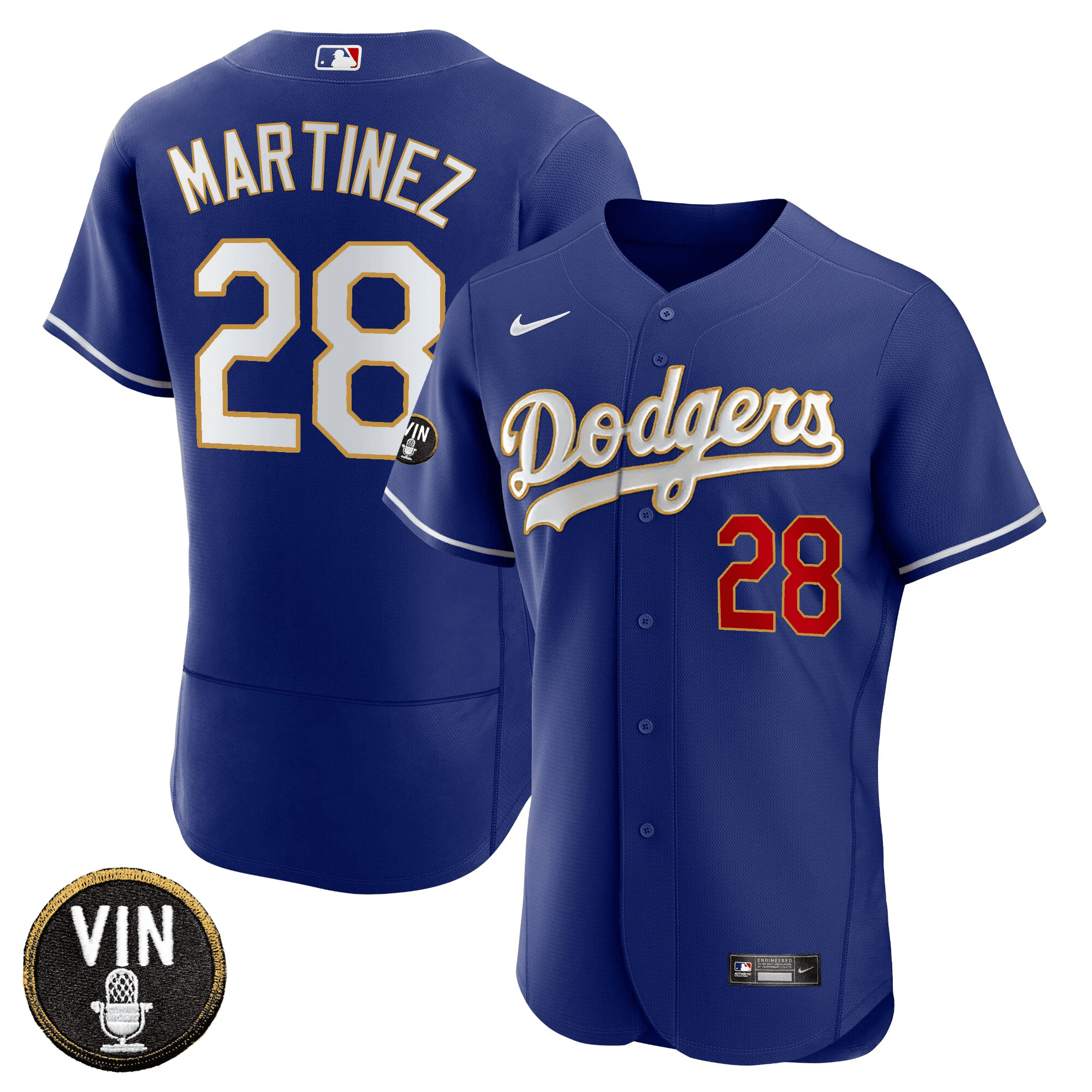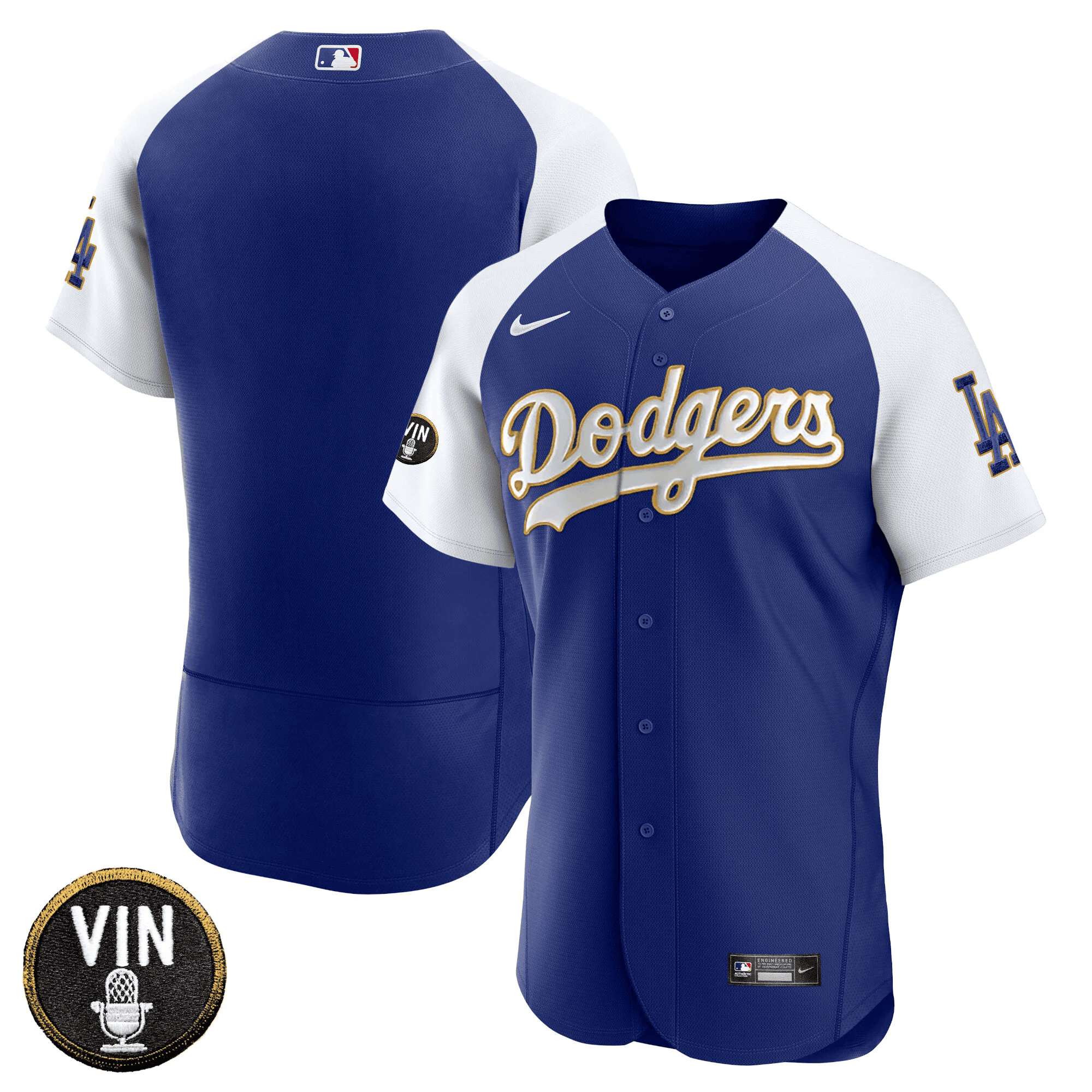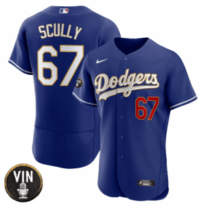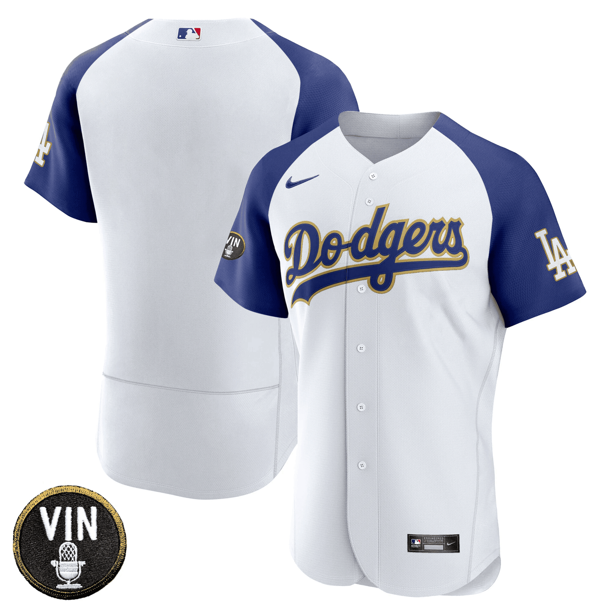 Men’s Dodgers Vin Scully Patch Flex Base Gold Trim Jersey – All Stitched