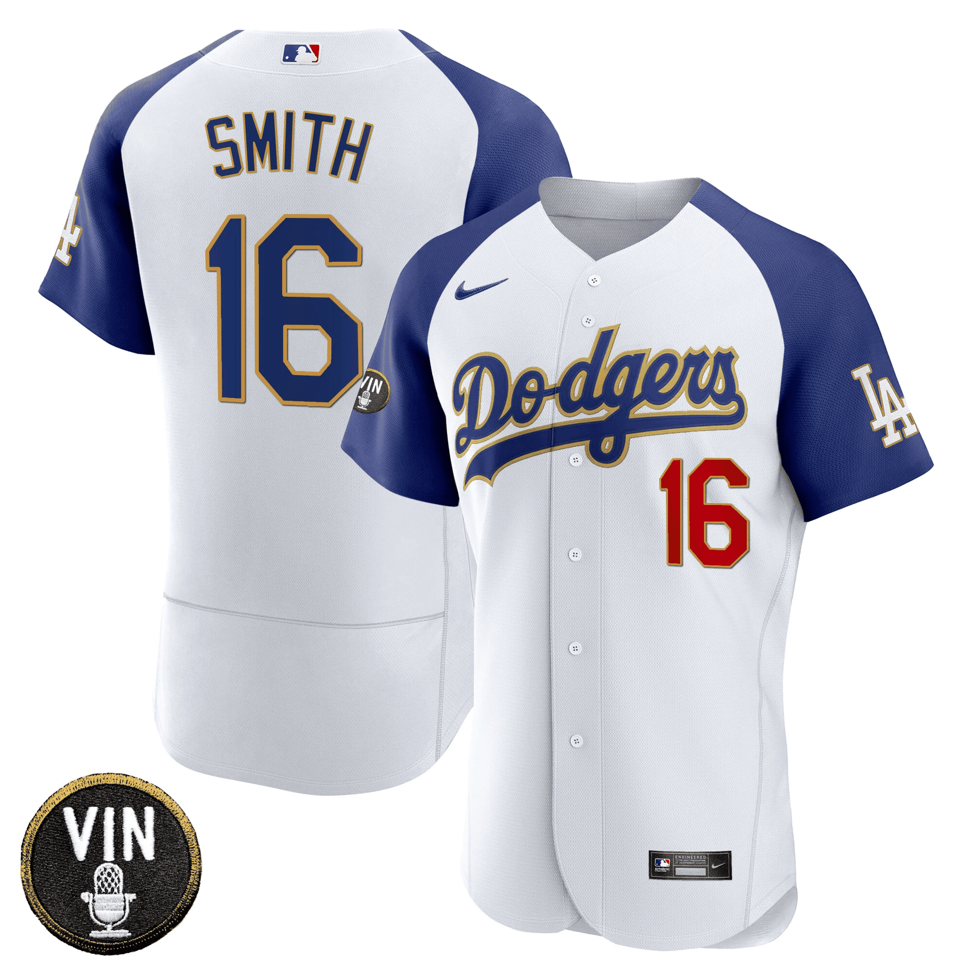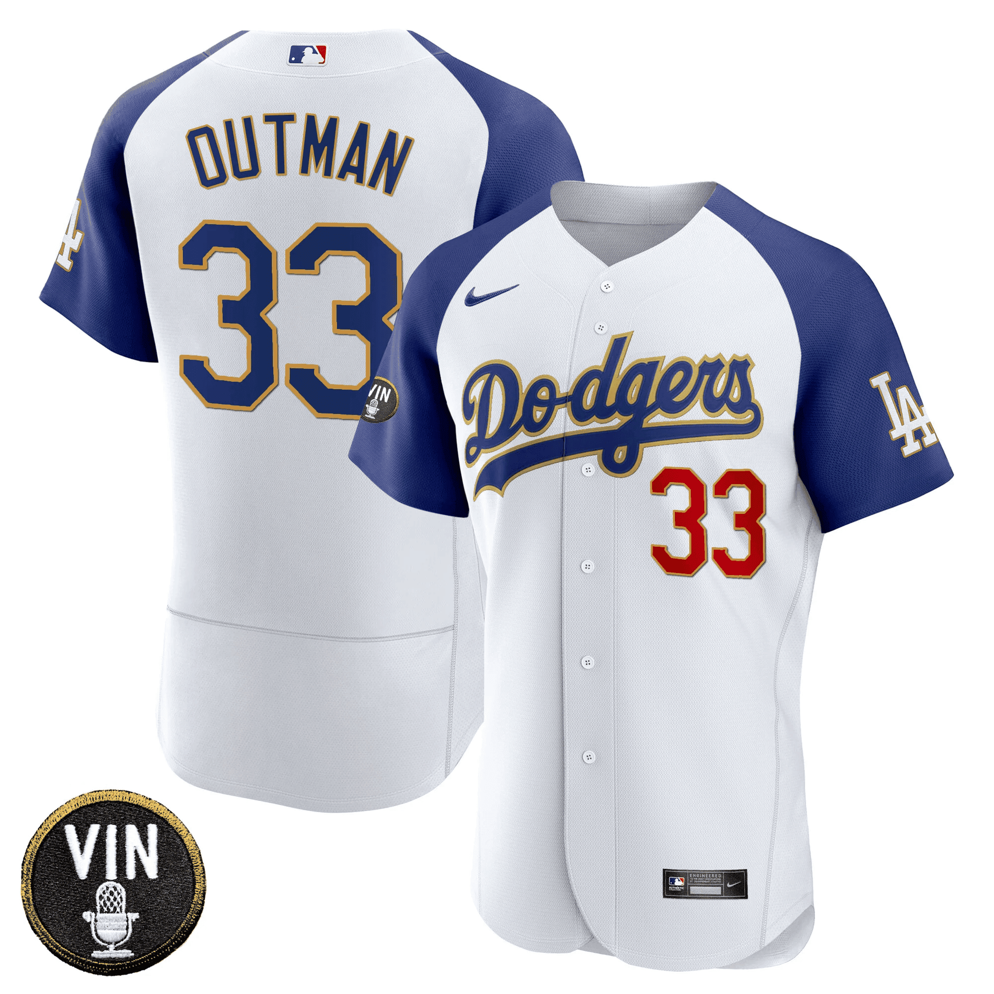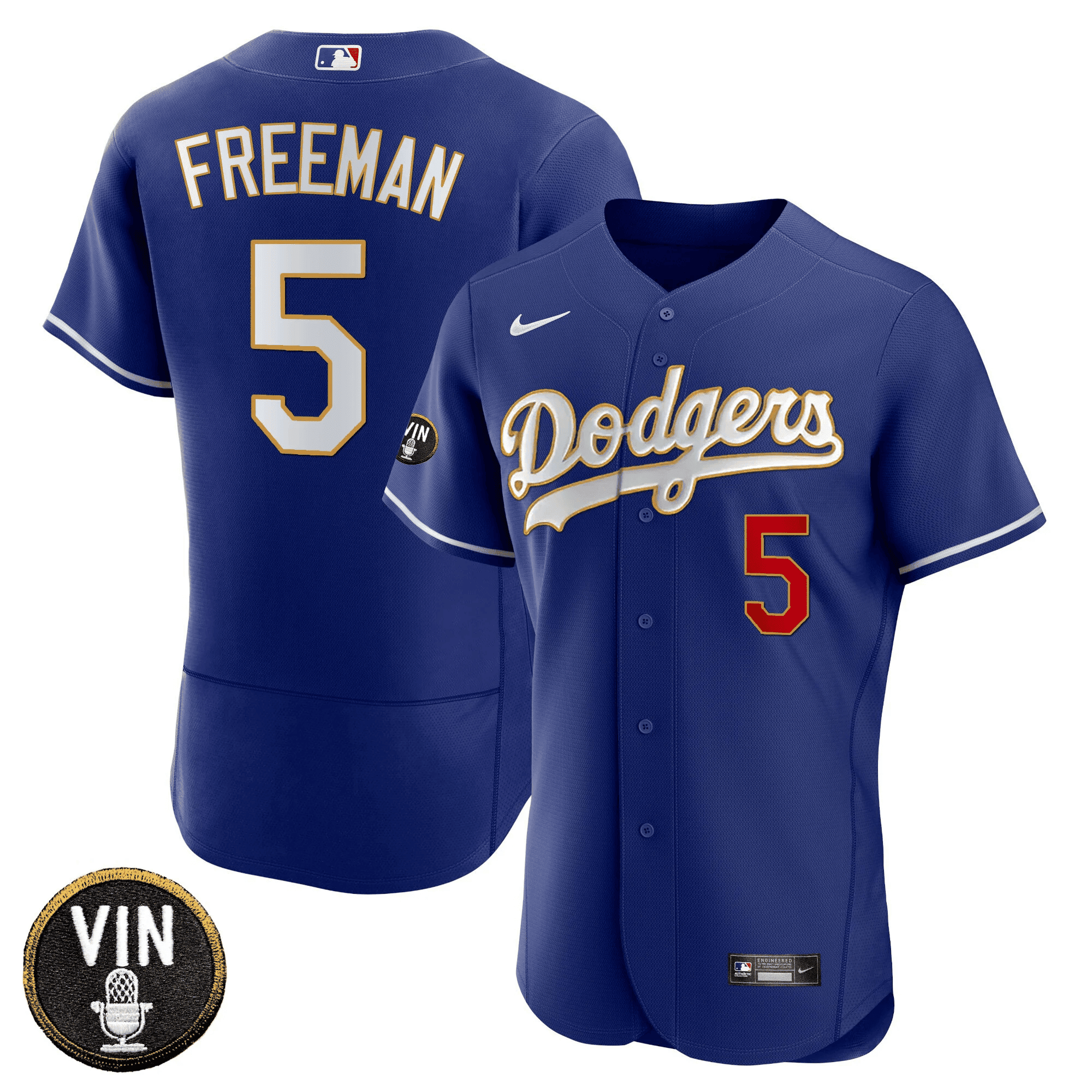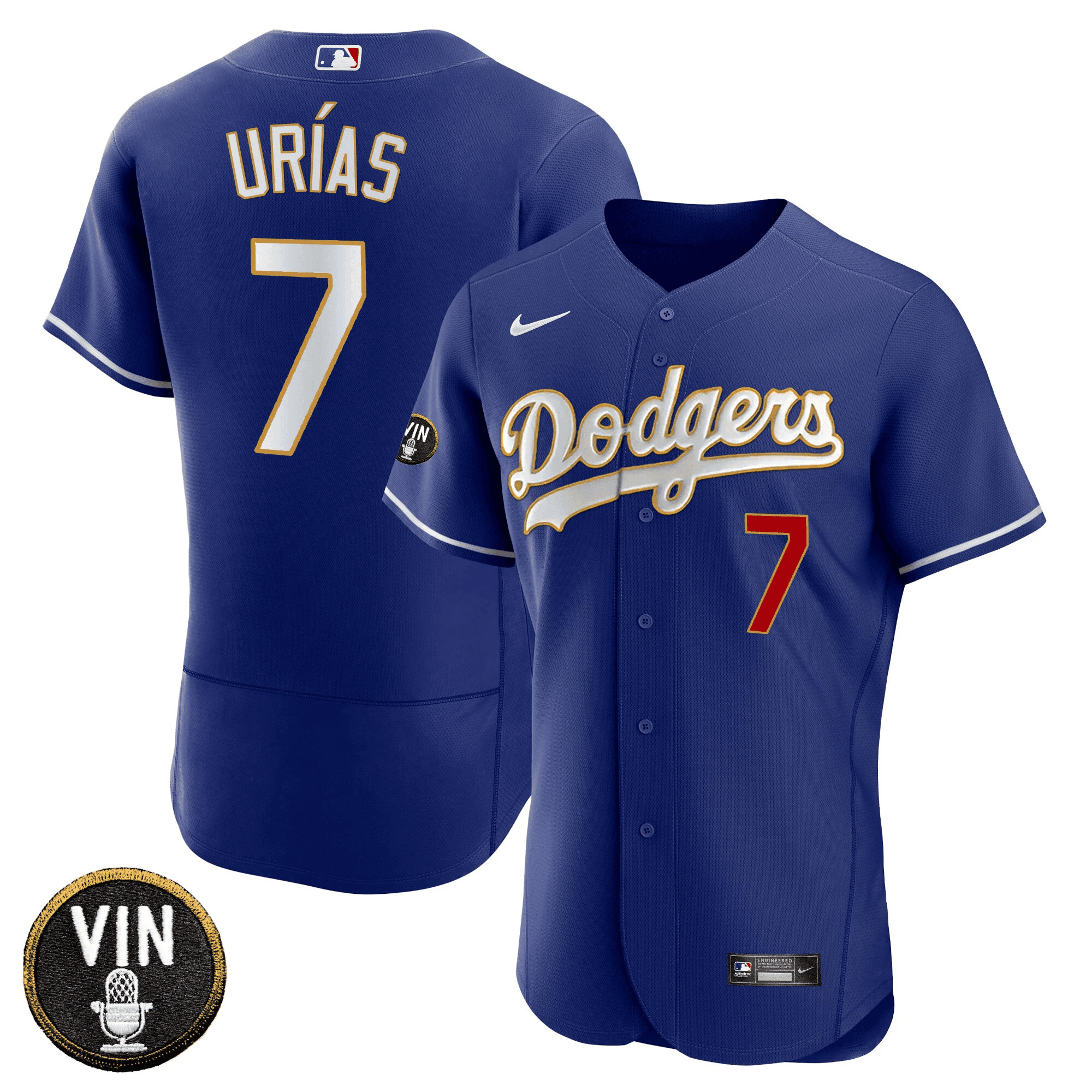 Men’s Dodgers Vin Scully Patch Flex Base Gold Trim Jersey – All Stitched