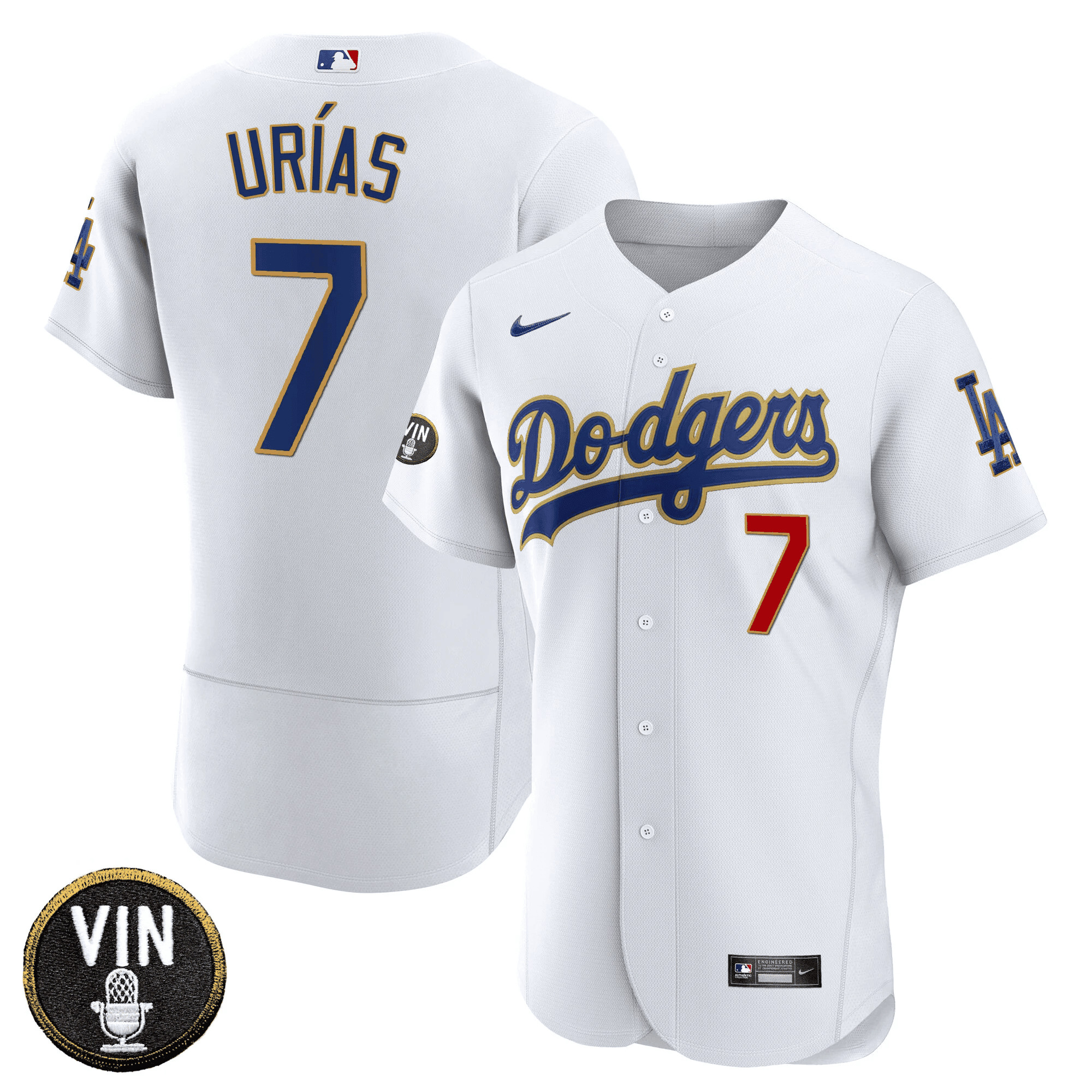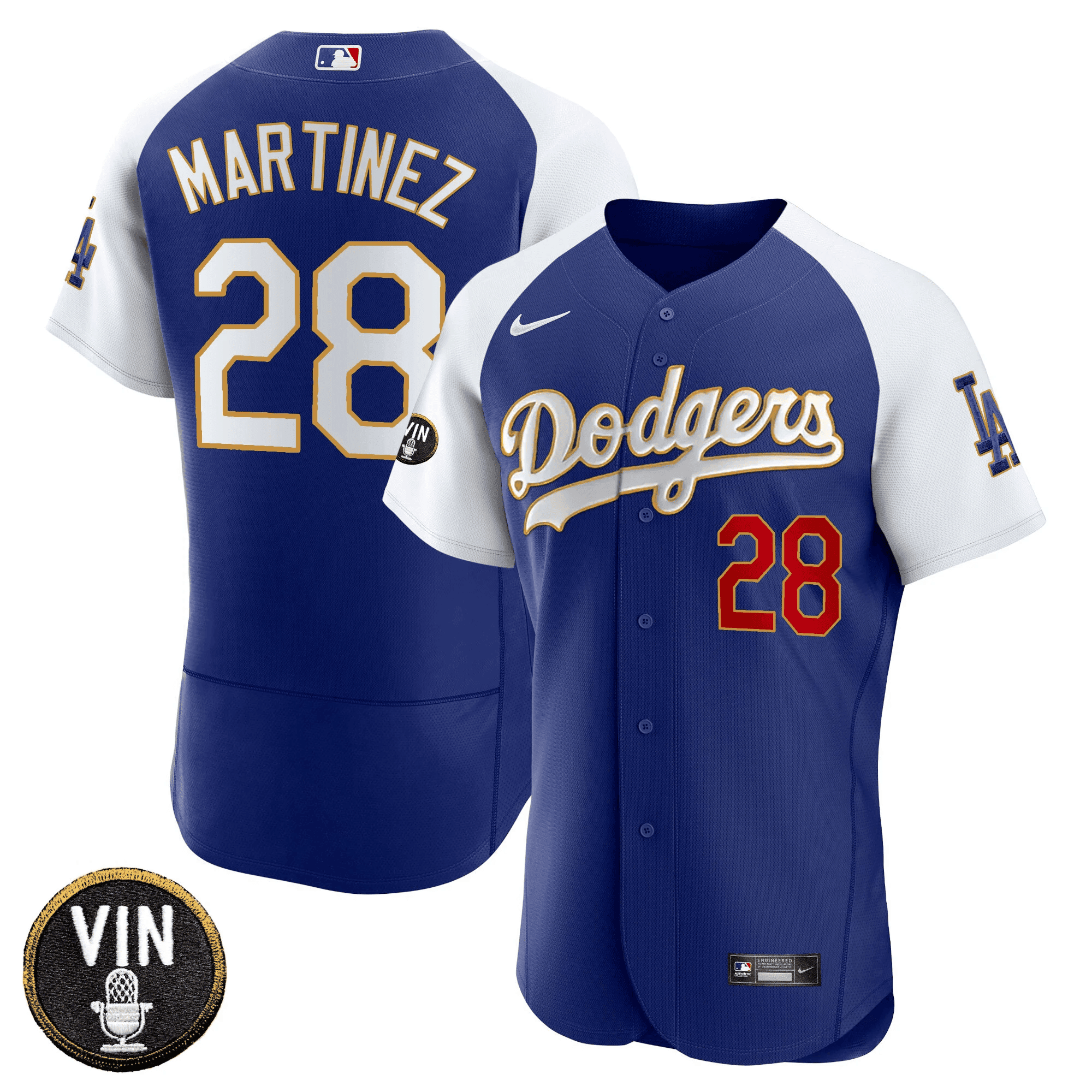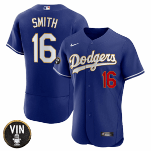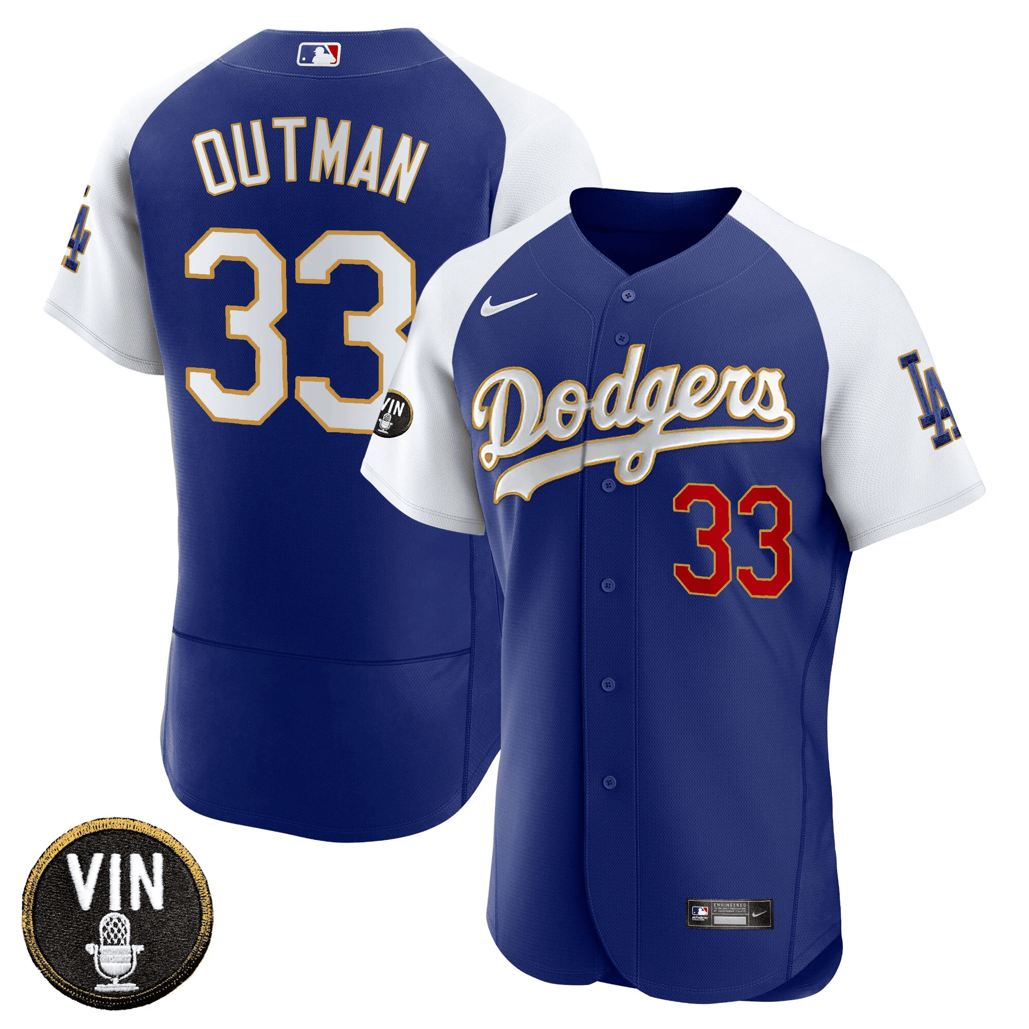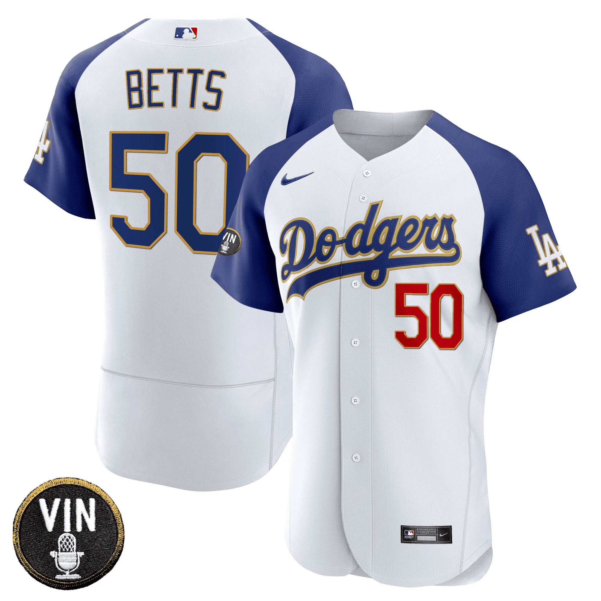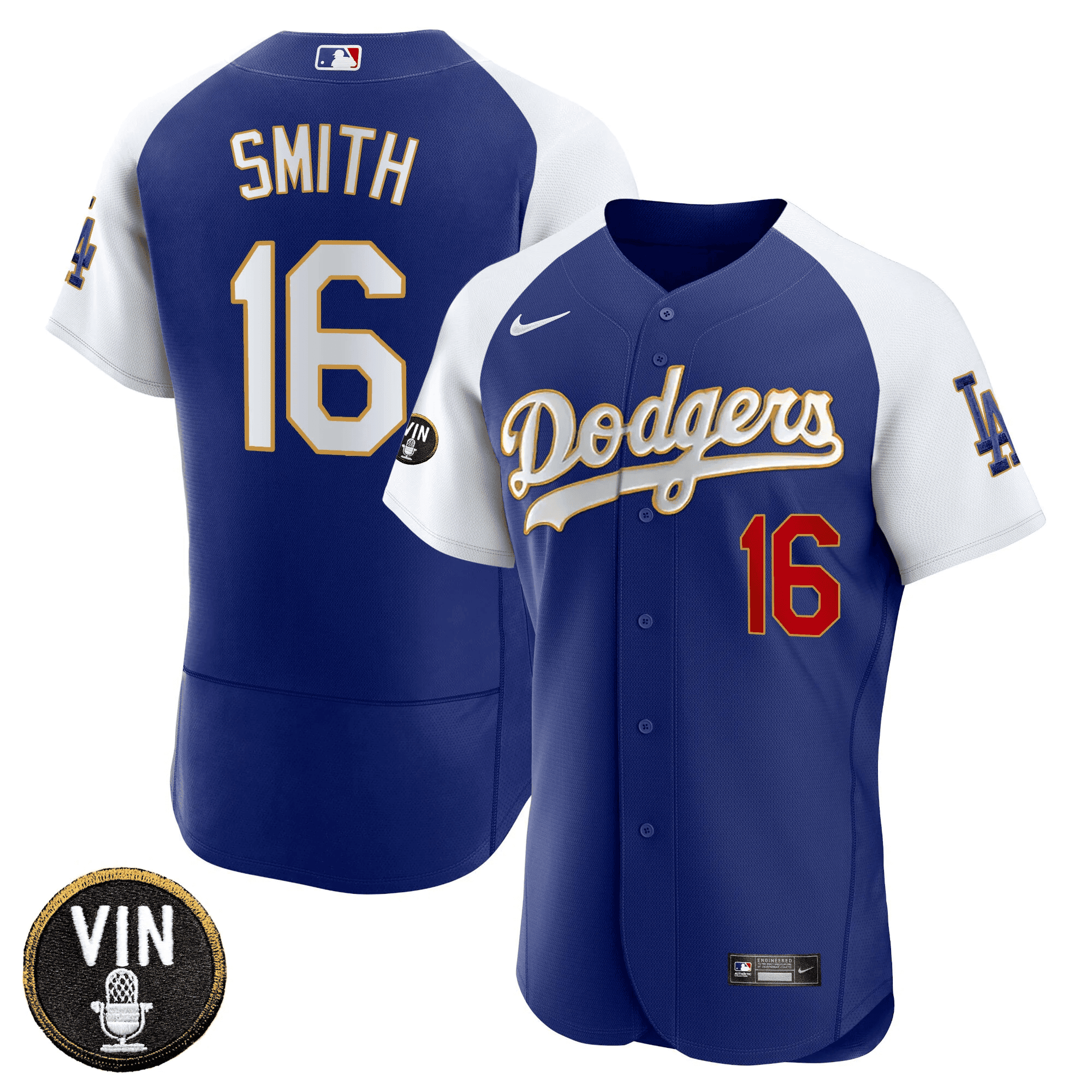 Men’s Dodgers Vin Scully Patch Flex Base Gold Trim Jersey – All Stitched