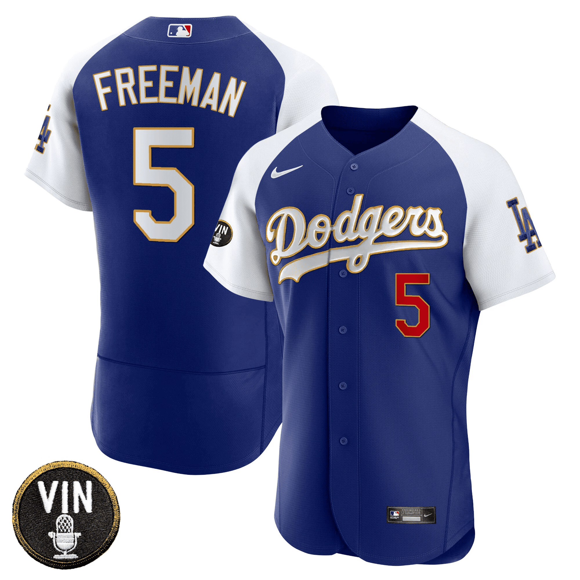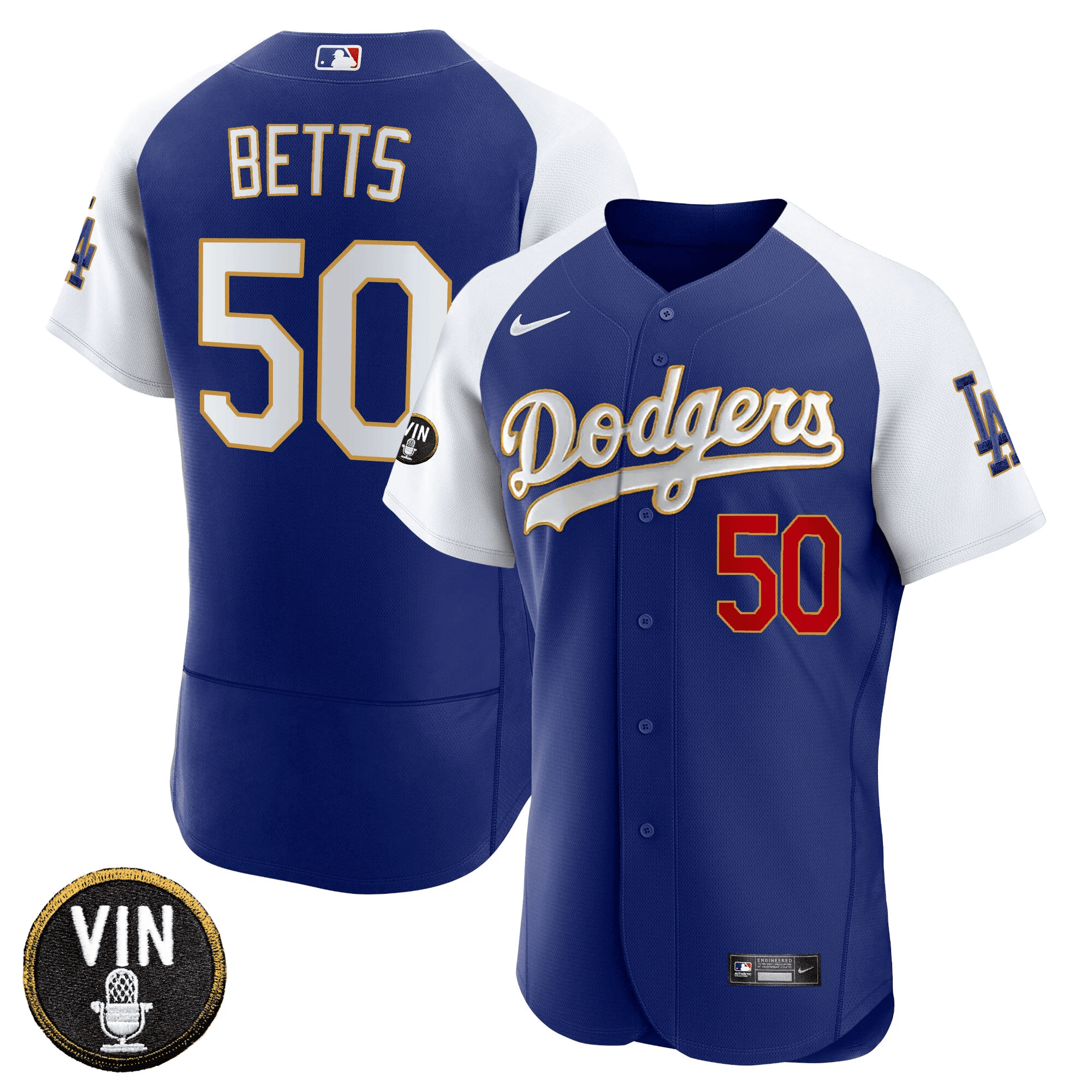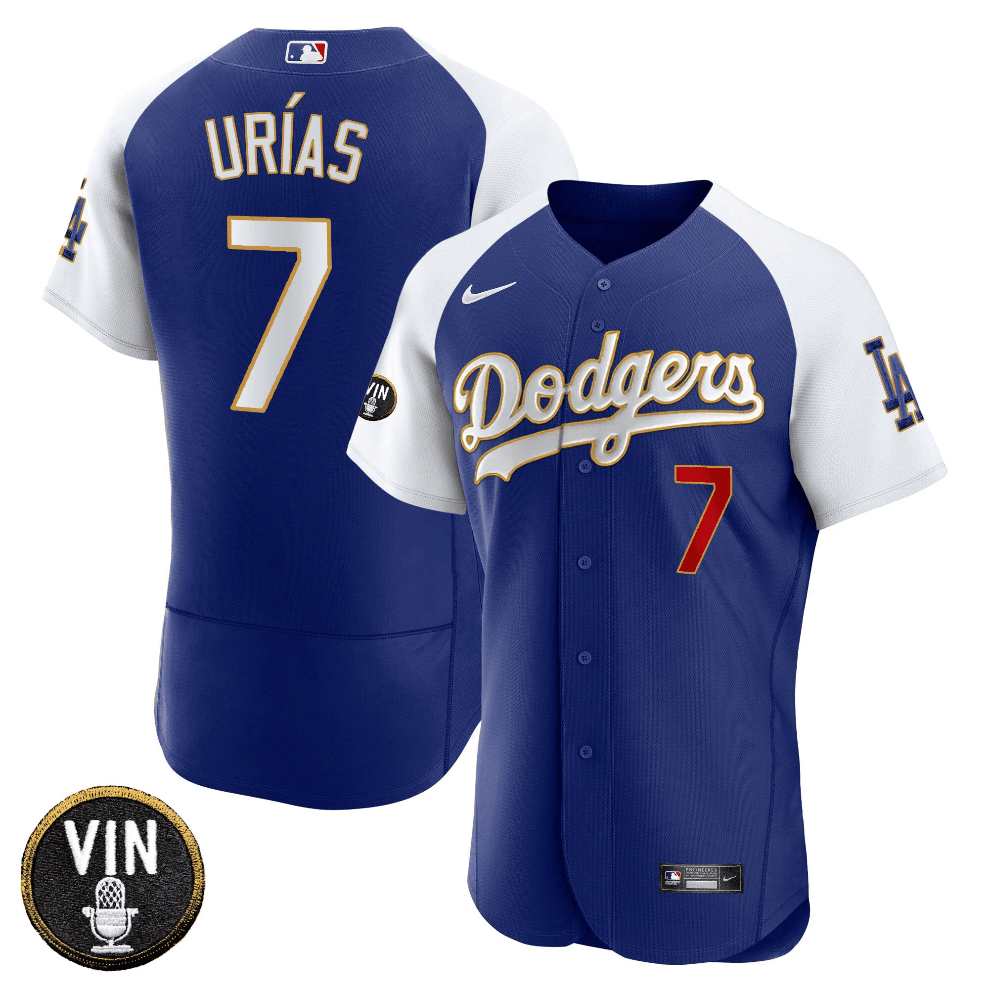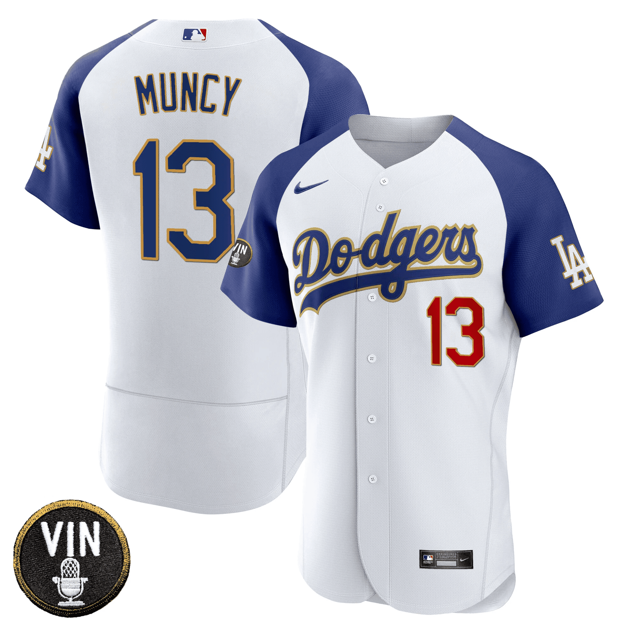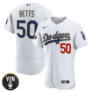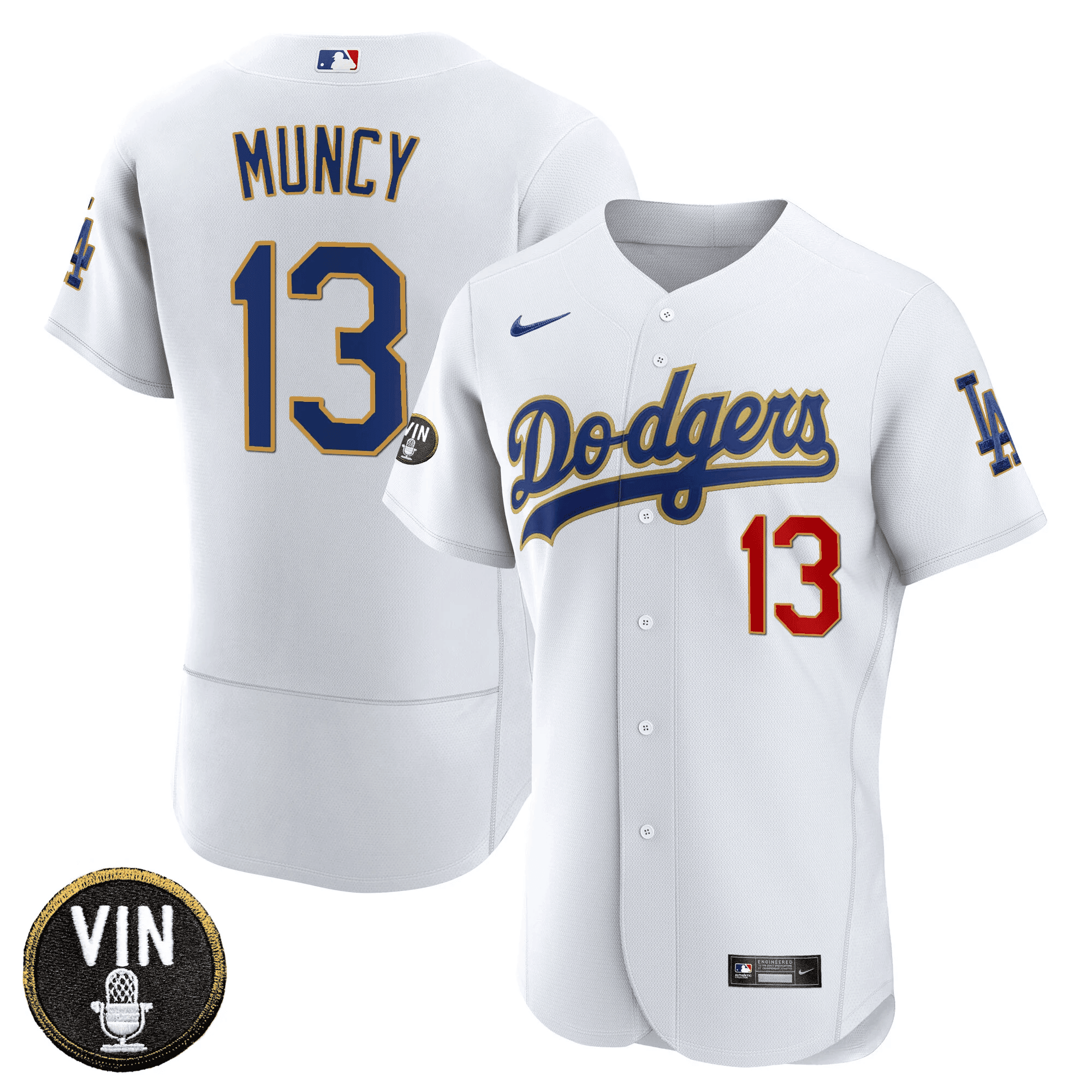 Men’s Dodgers Vin Scully Patch Flex Base Gold Trim Jersey – All Stitched