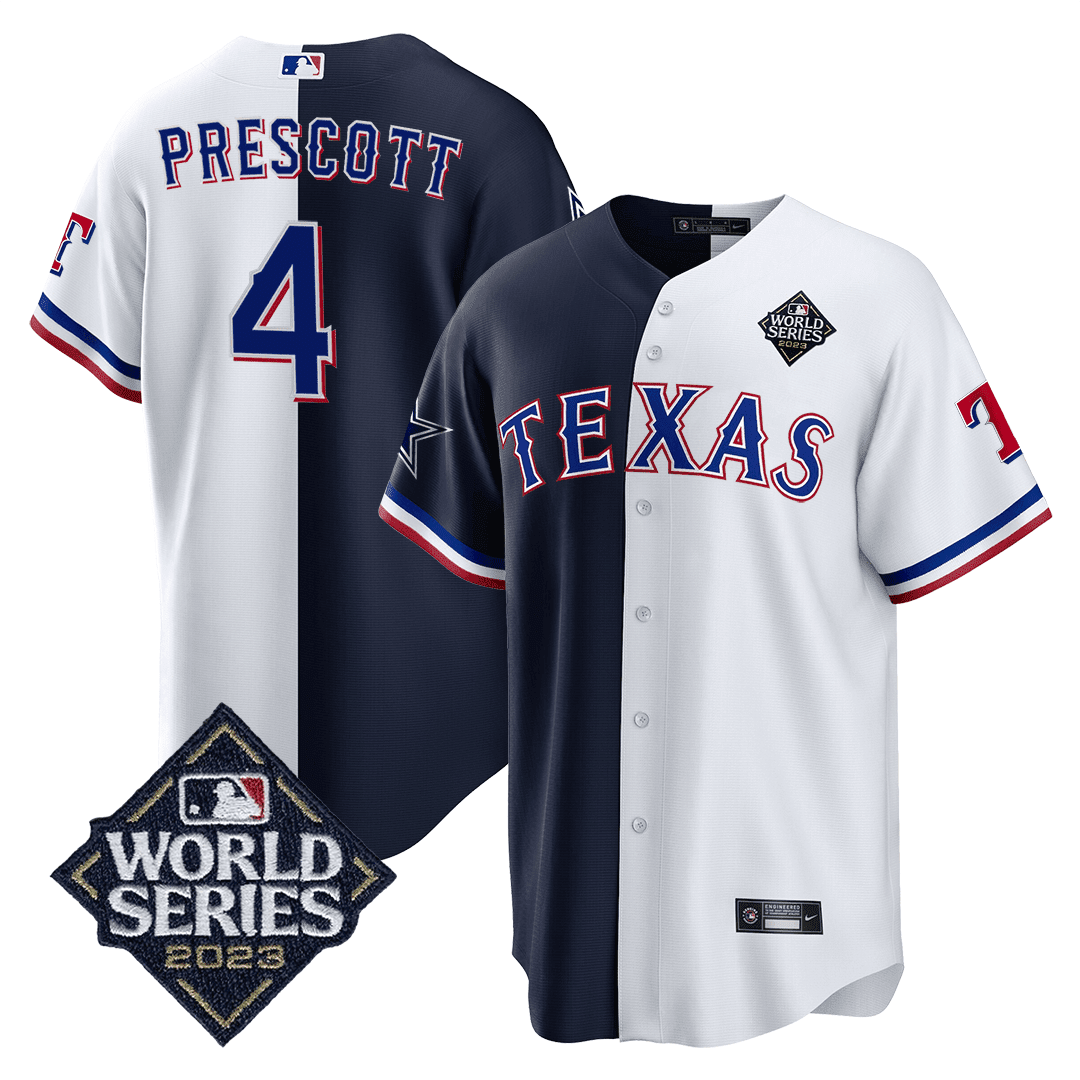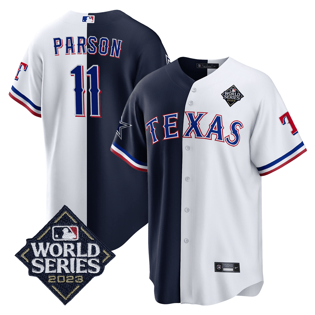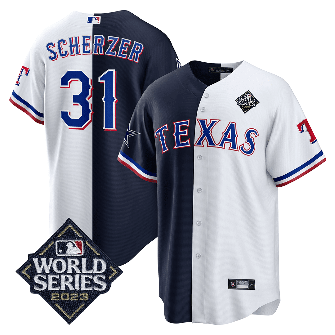 Men’s Split Rangers – Cowboys 2023 World Series Patch Cool Base Jersey – All Stitched