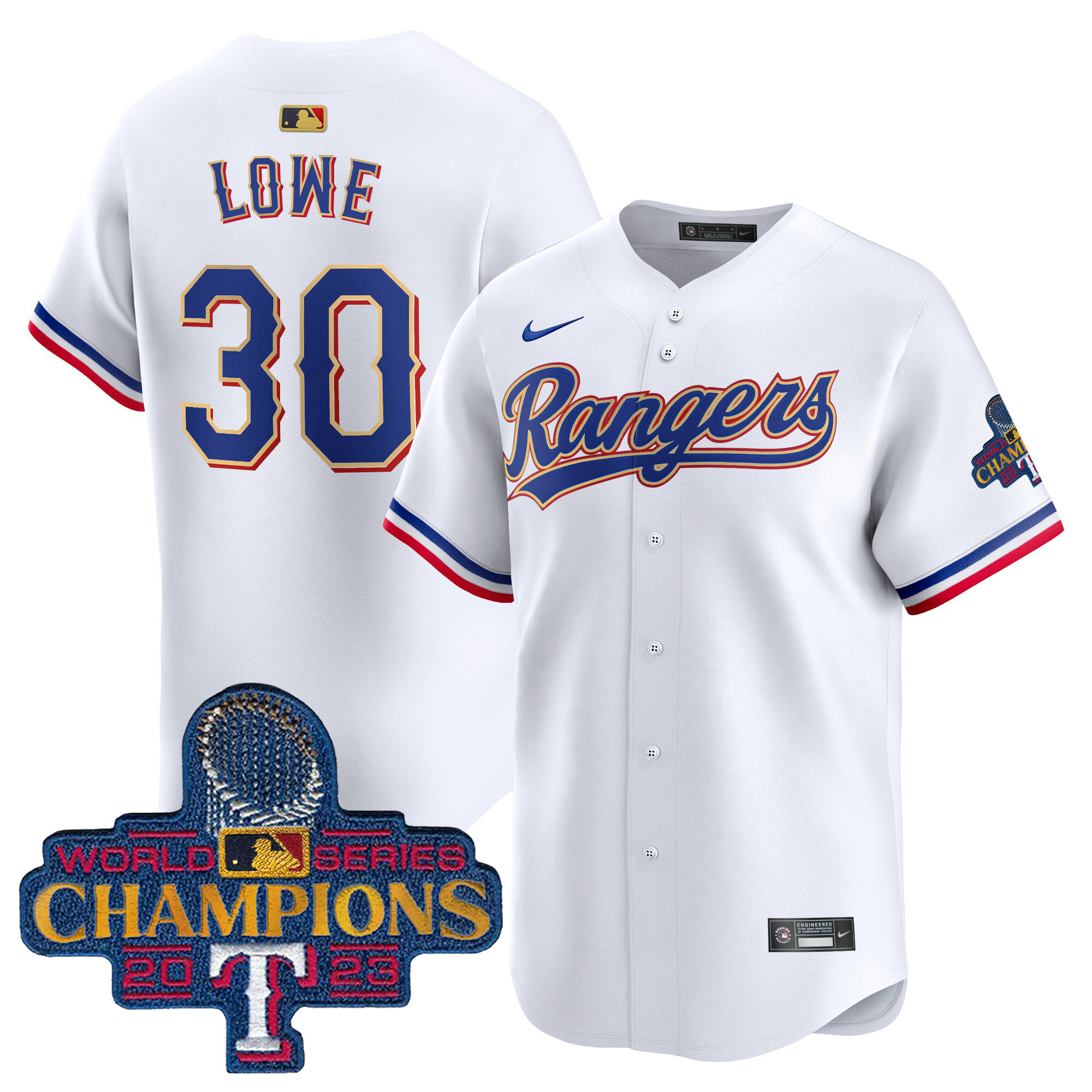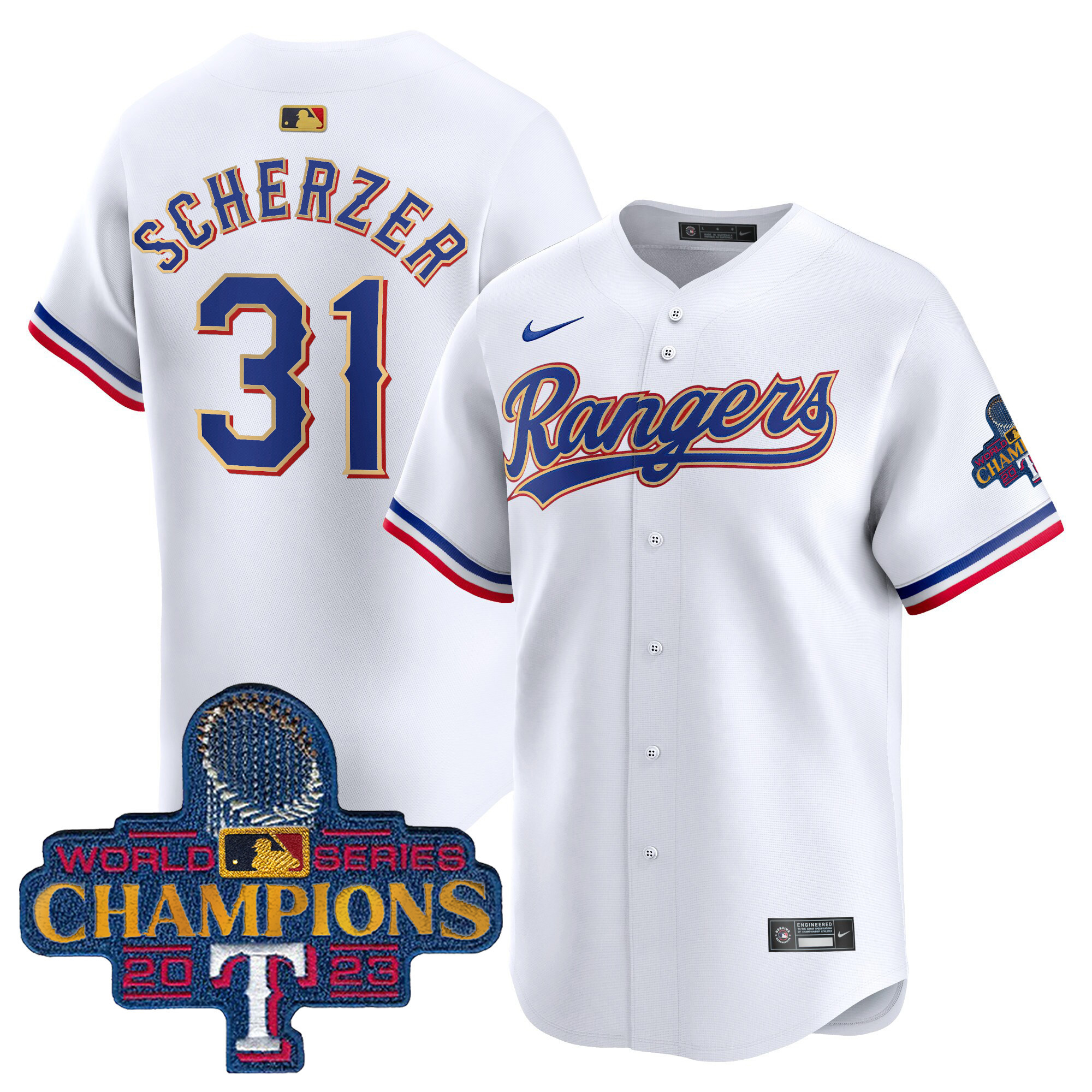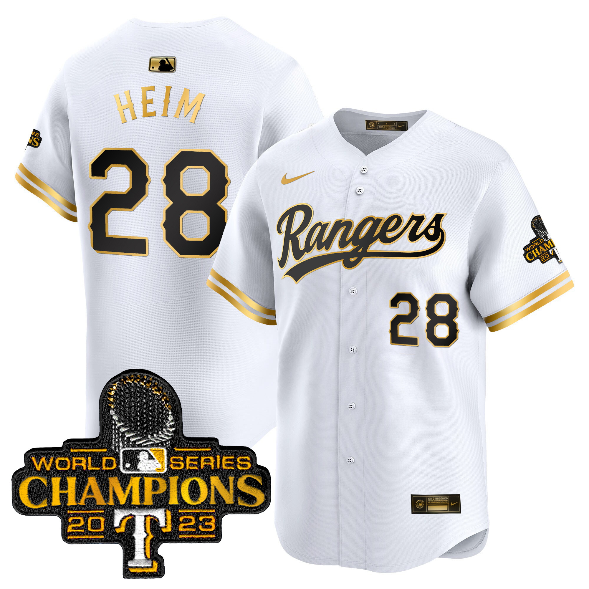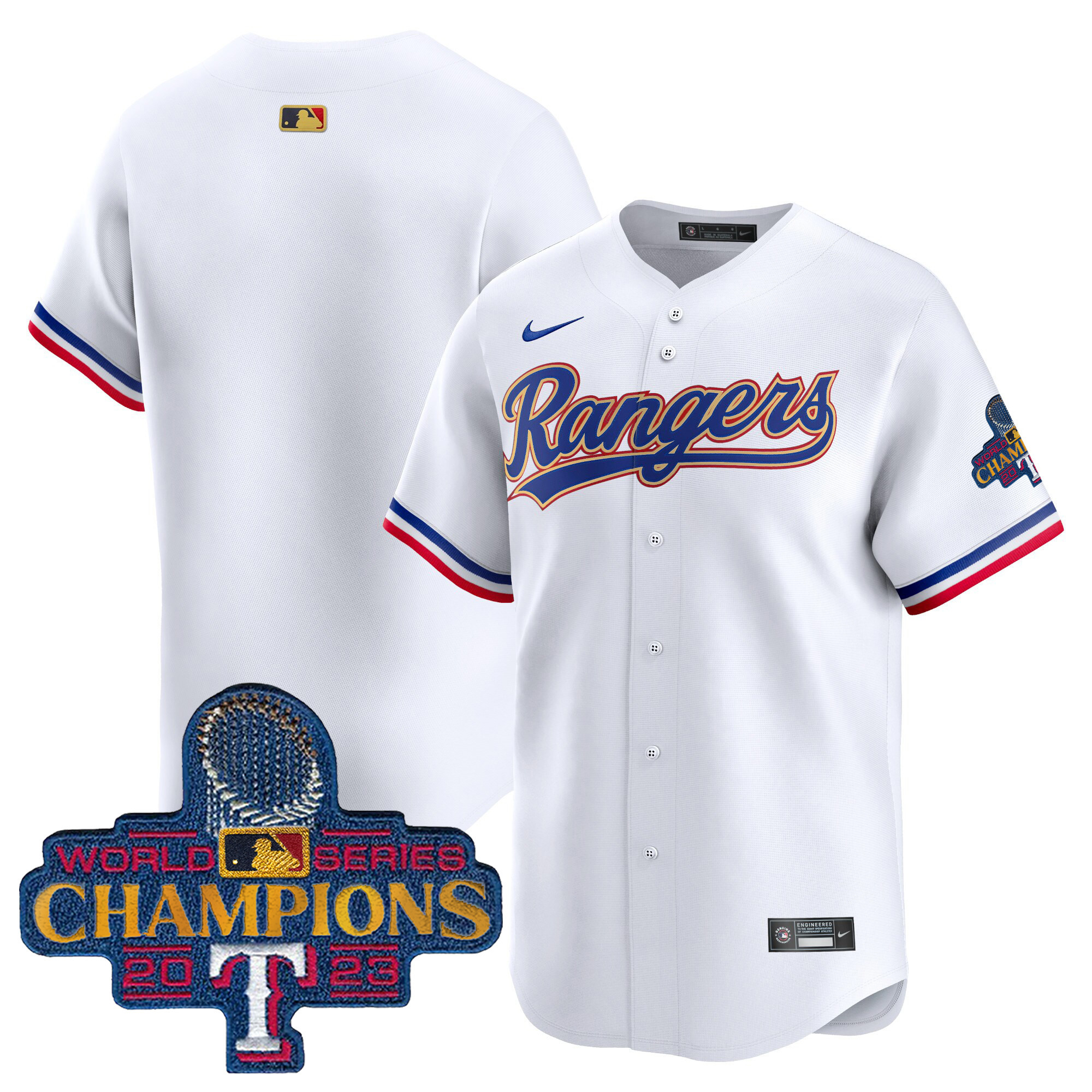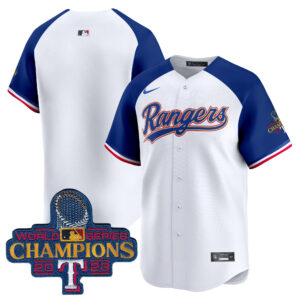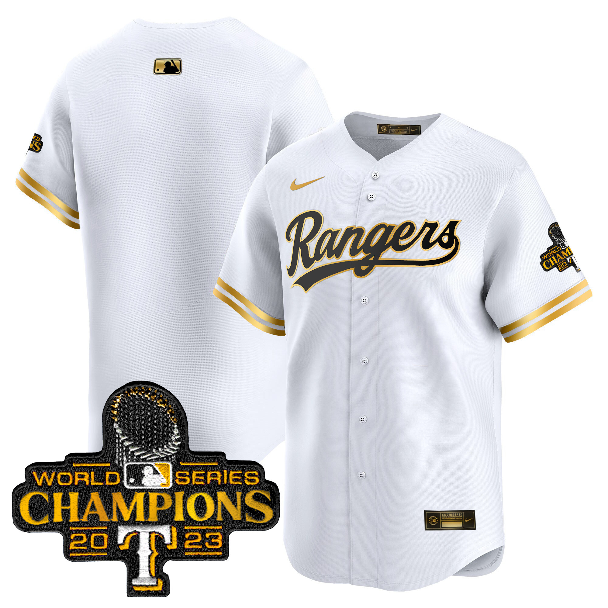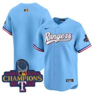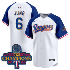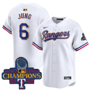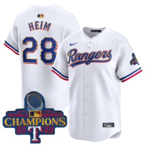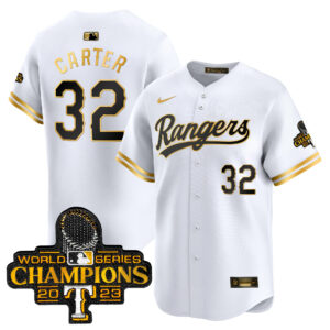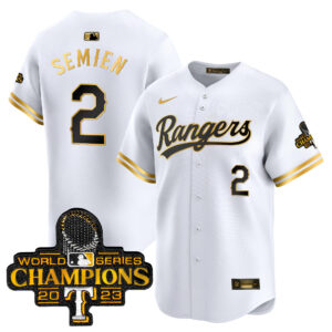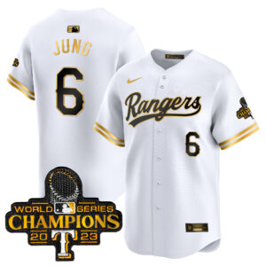 Men’s Texas Rangers 2023 World Series Champions Gold Trim Vapor Premier Limited Jersey – All Stitched