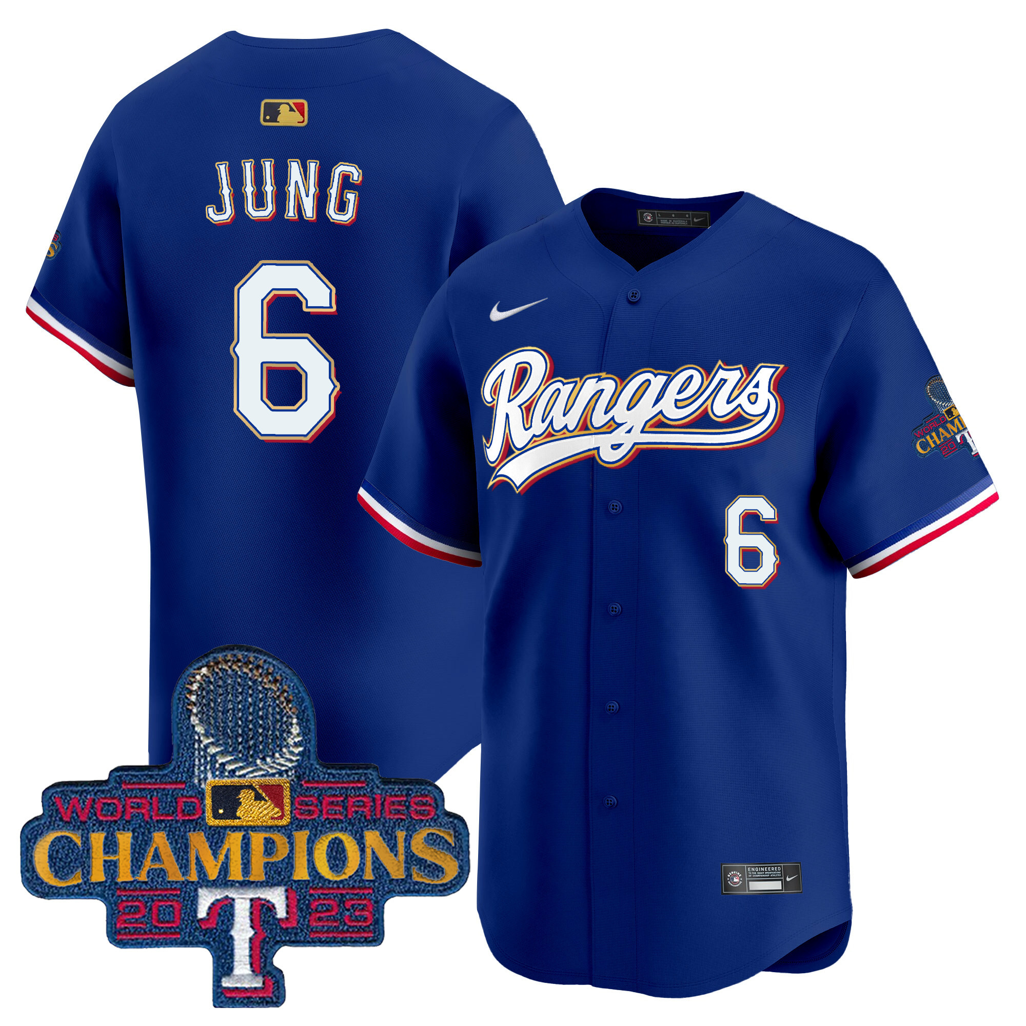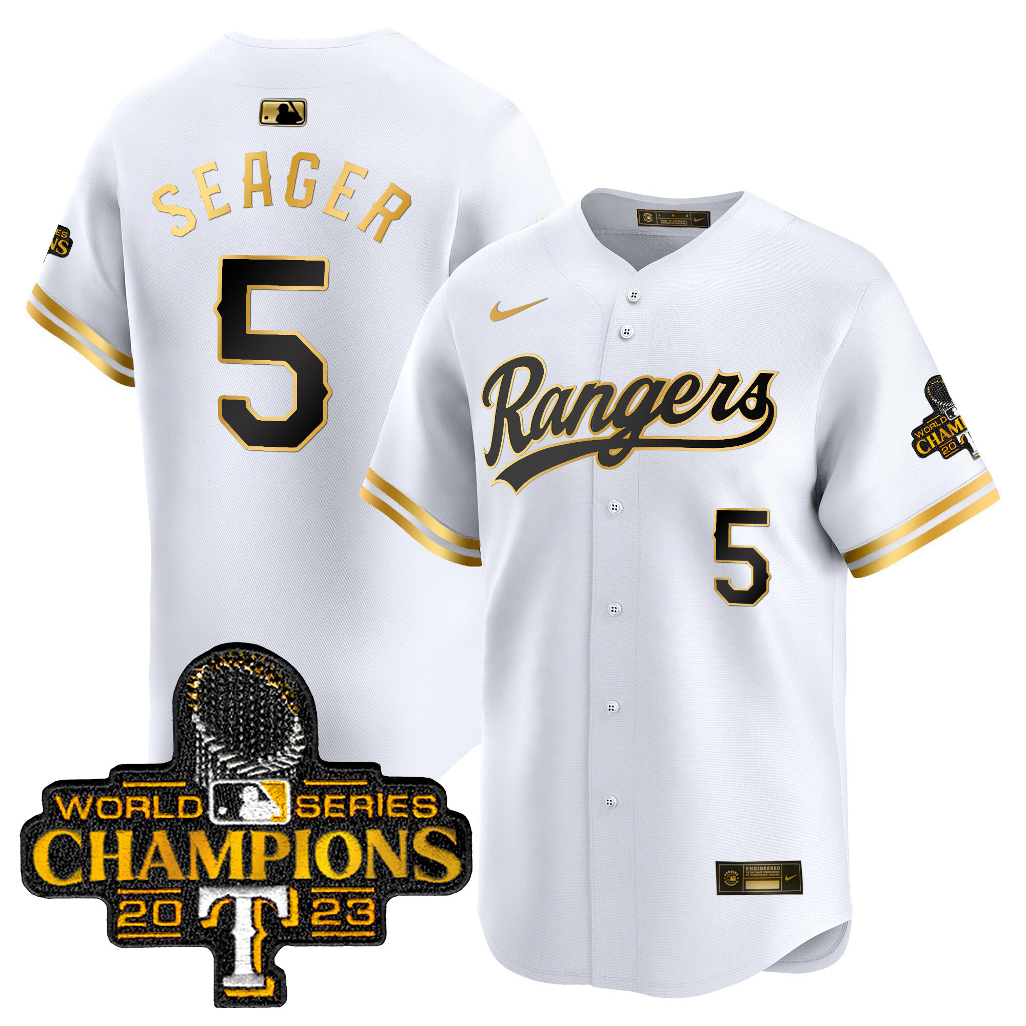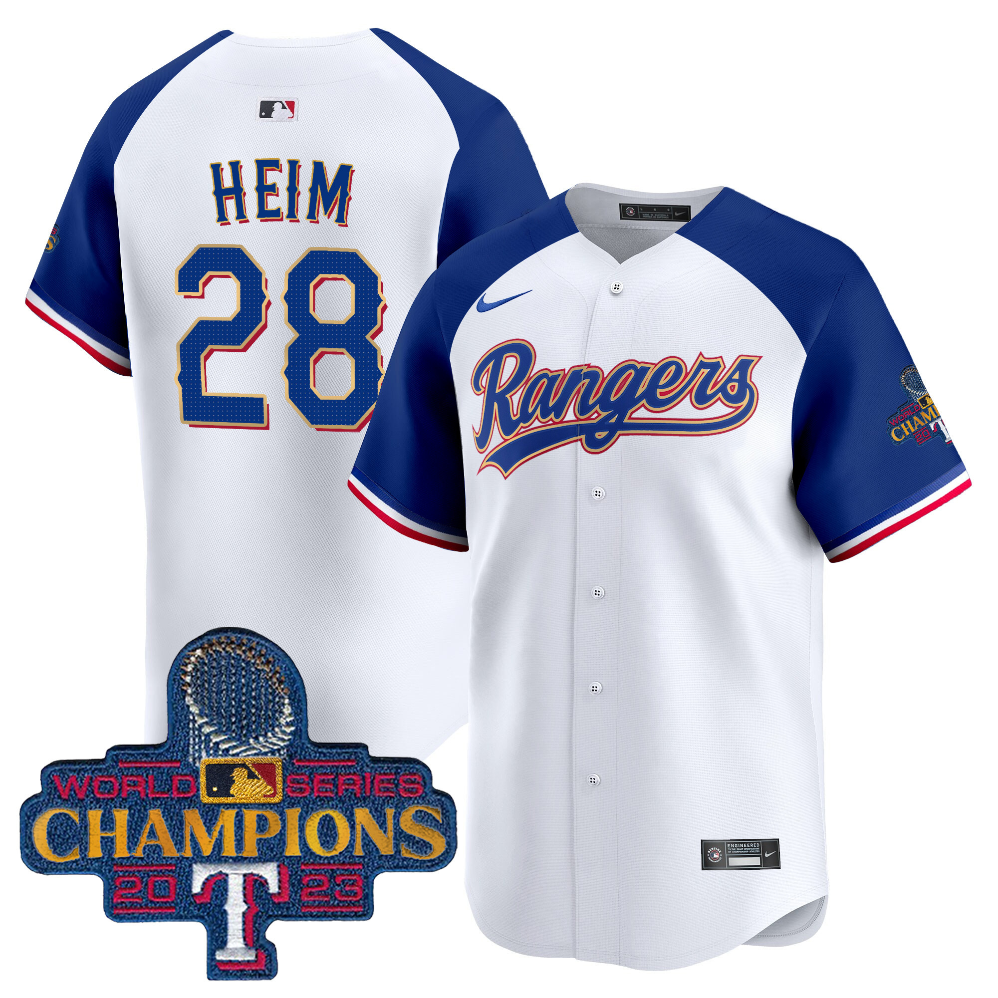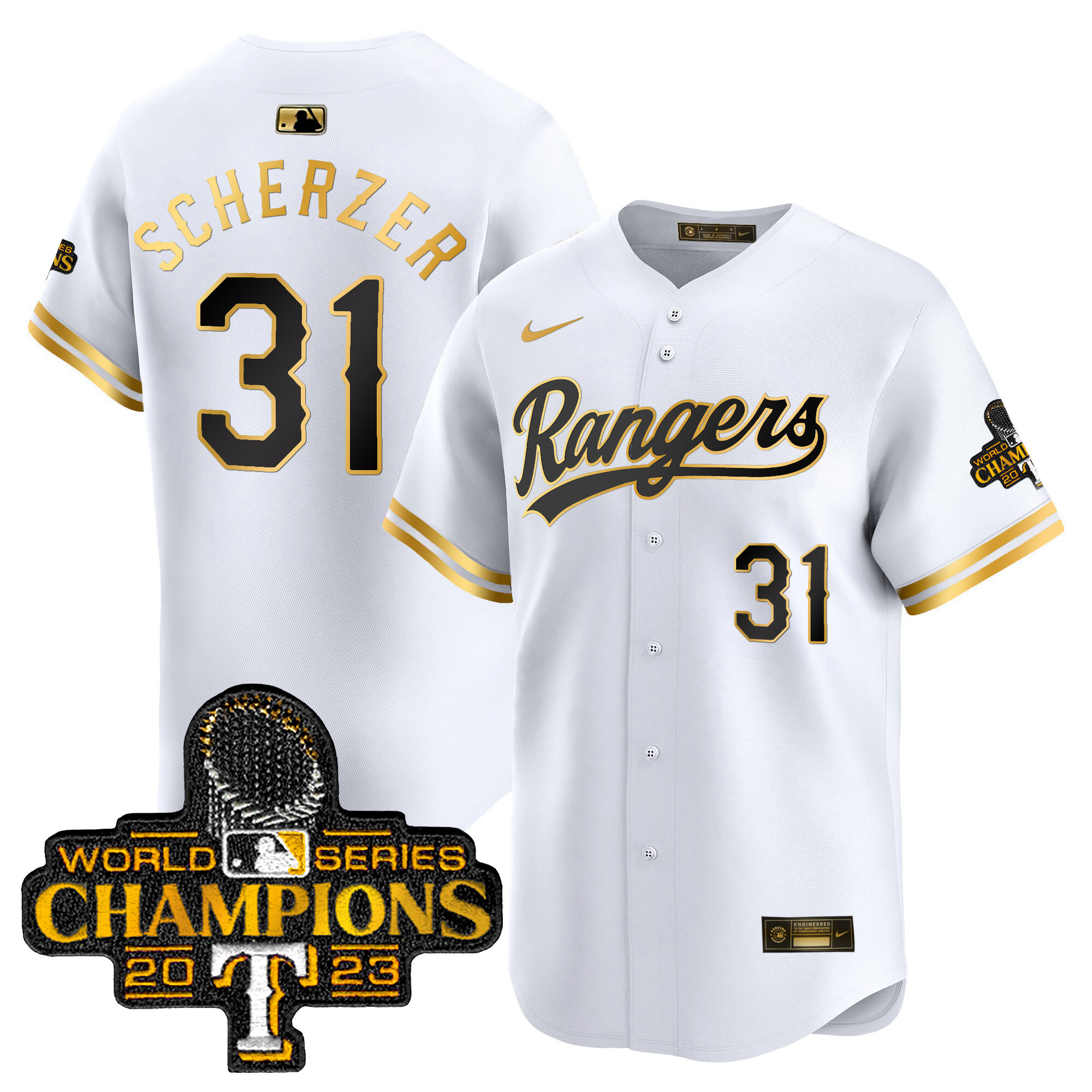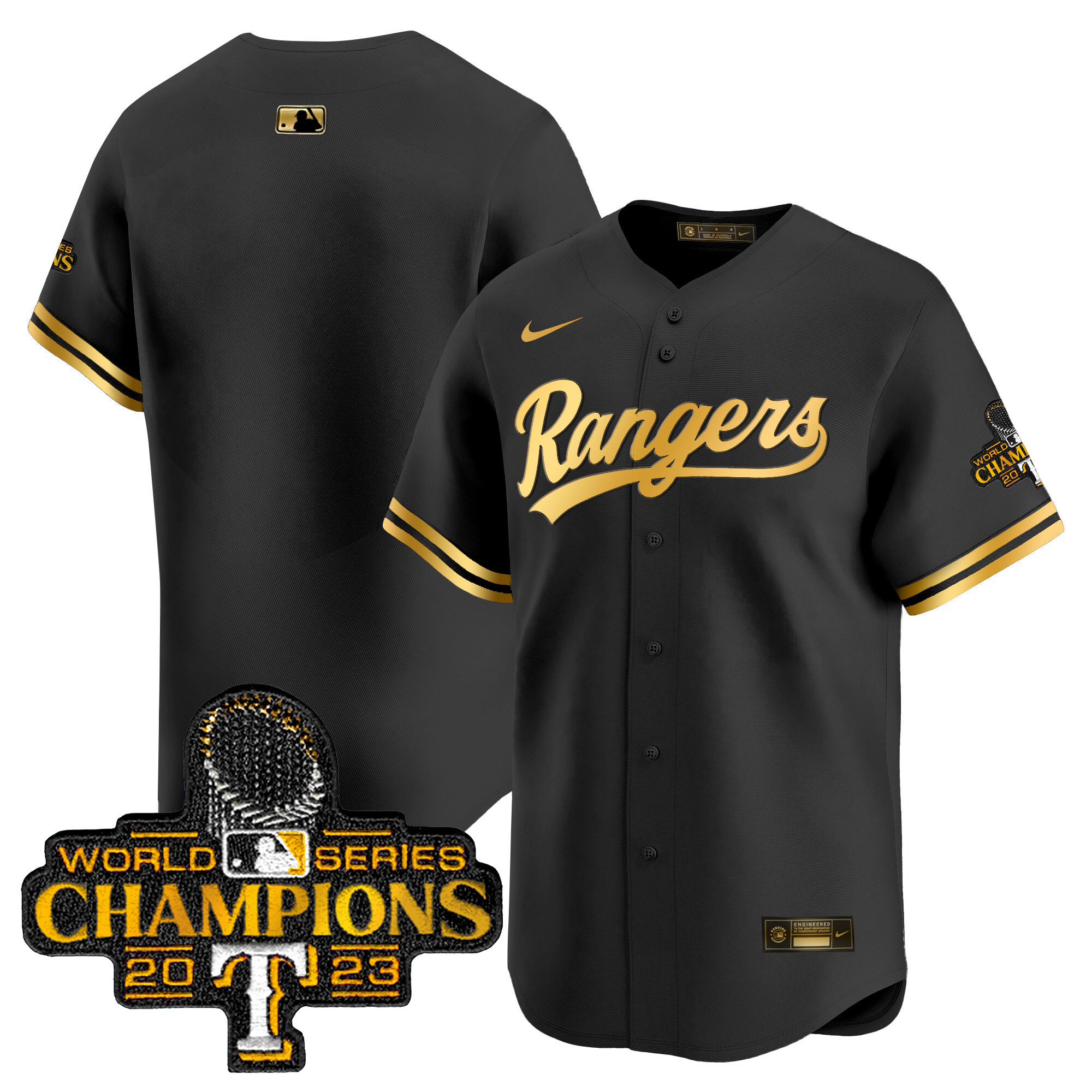 Men’s Texas Rangers 2023 World Series Champions Gold Trim Vapor Premier Limited Jersey – All Stitched