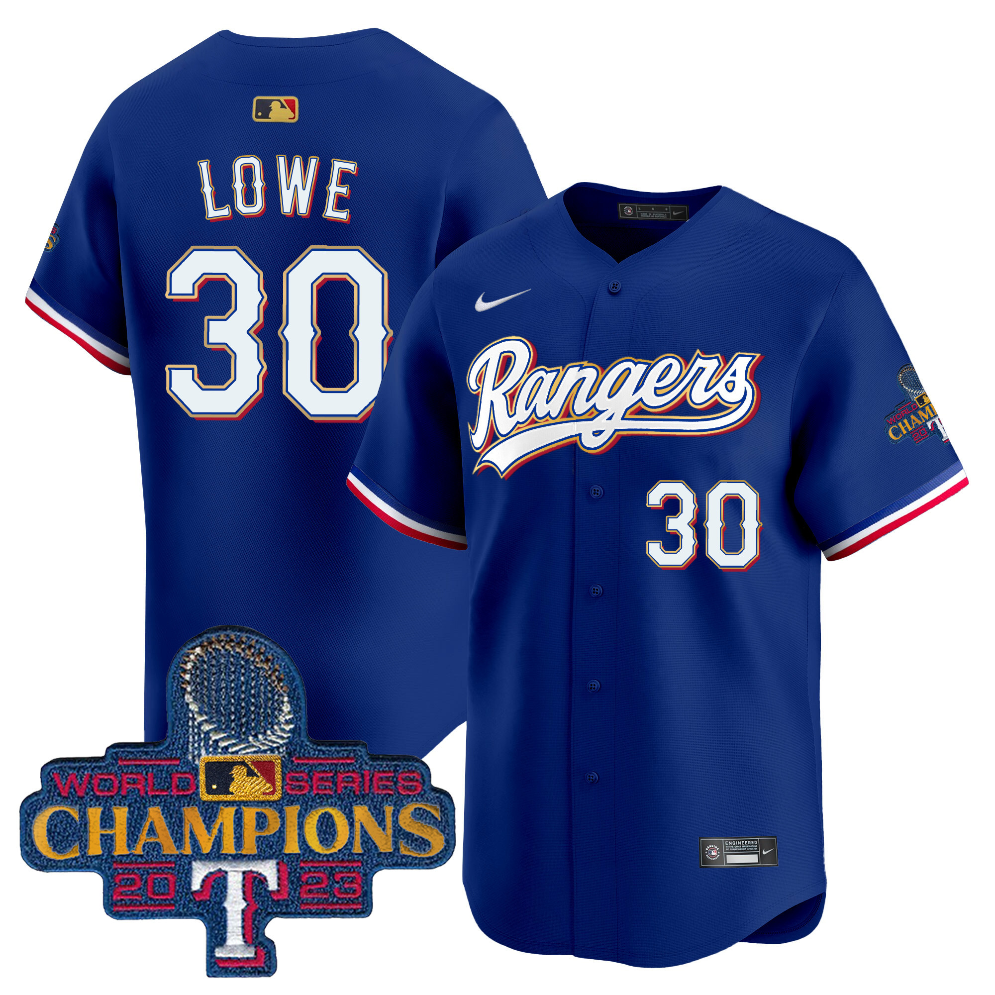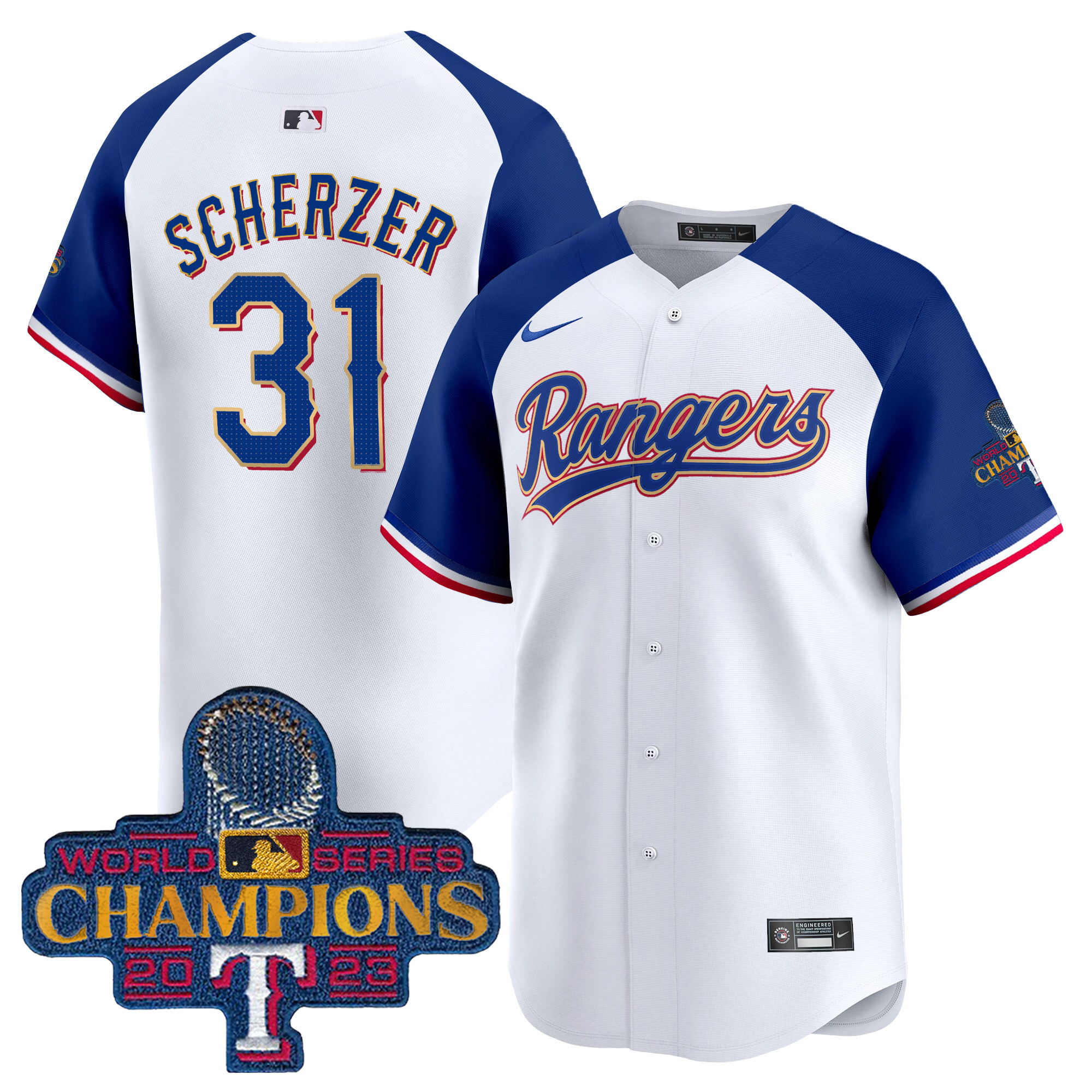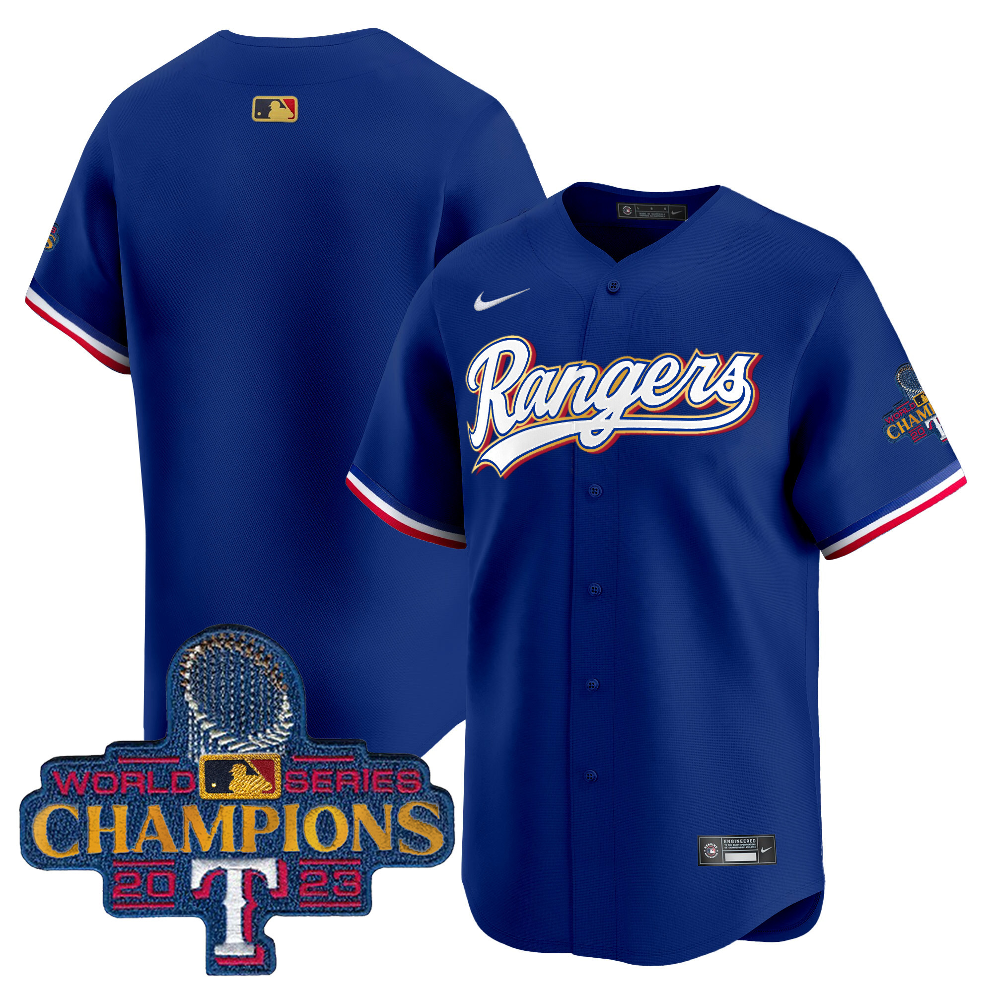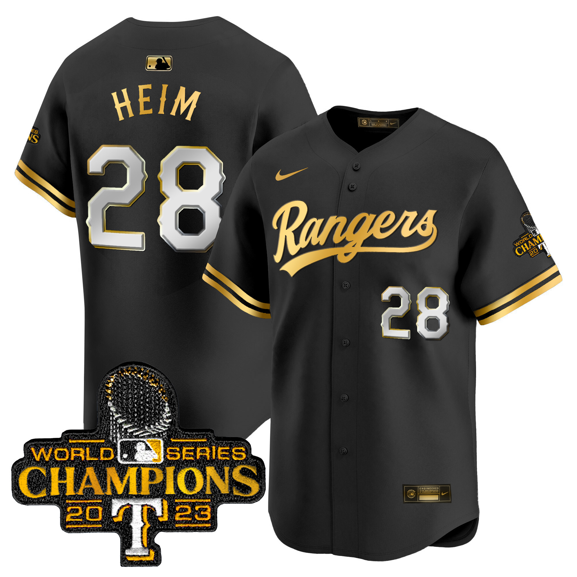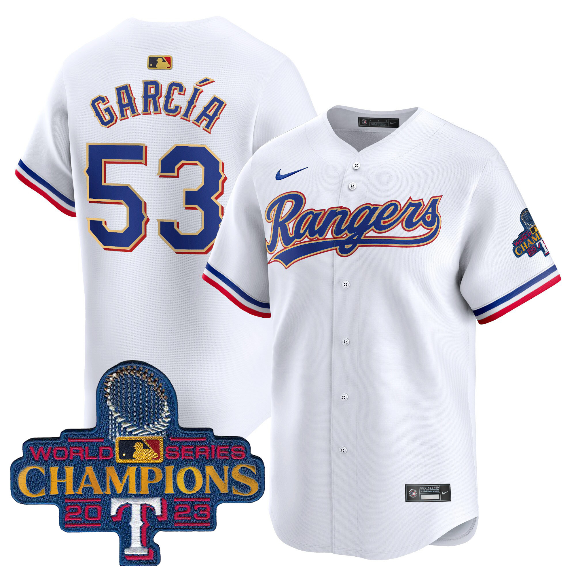 Men’s Texas Rangers 2023 World Series Champions Gold Trim Vapor Premier Limited Jersey – All Stitched