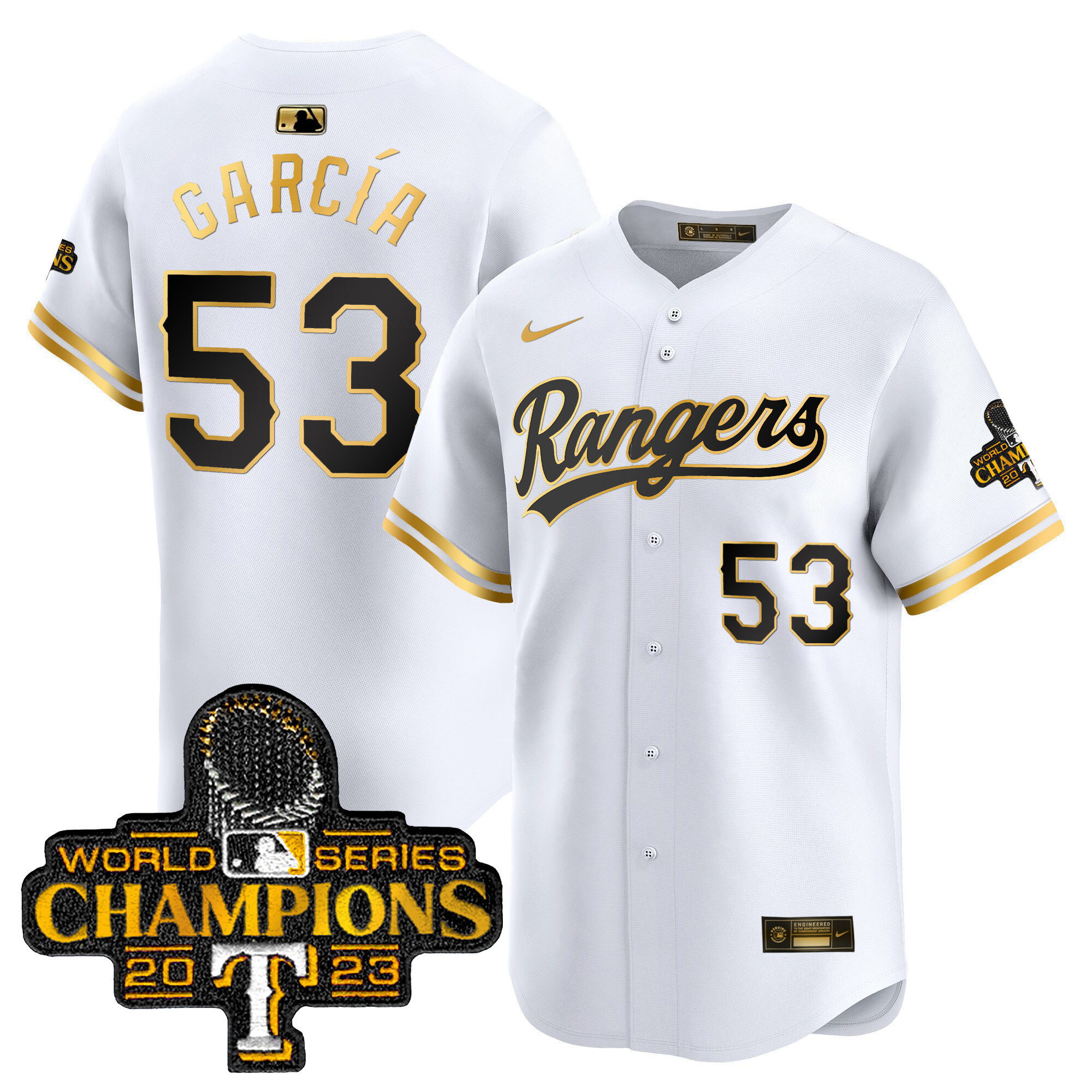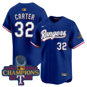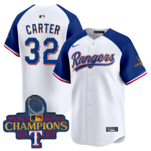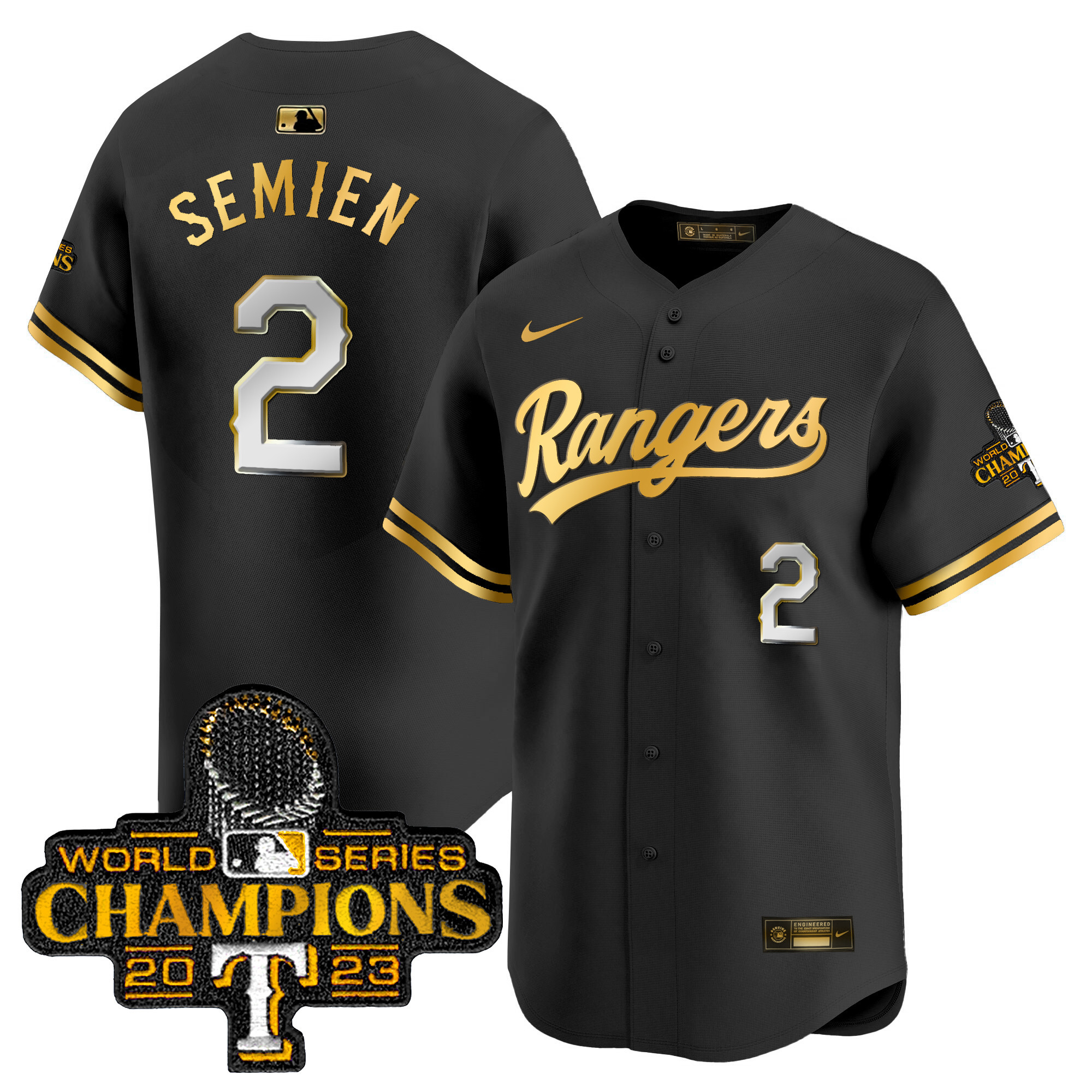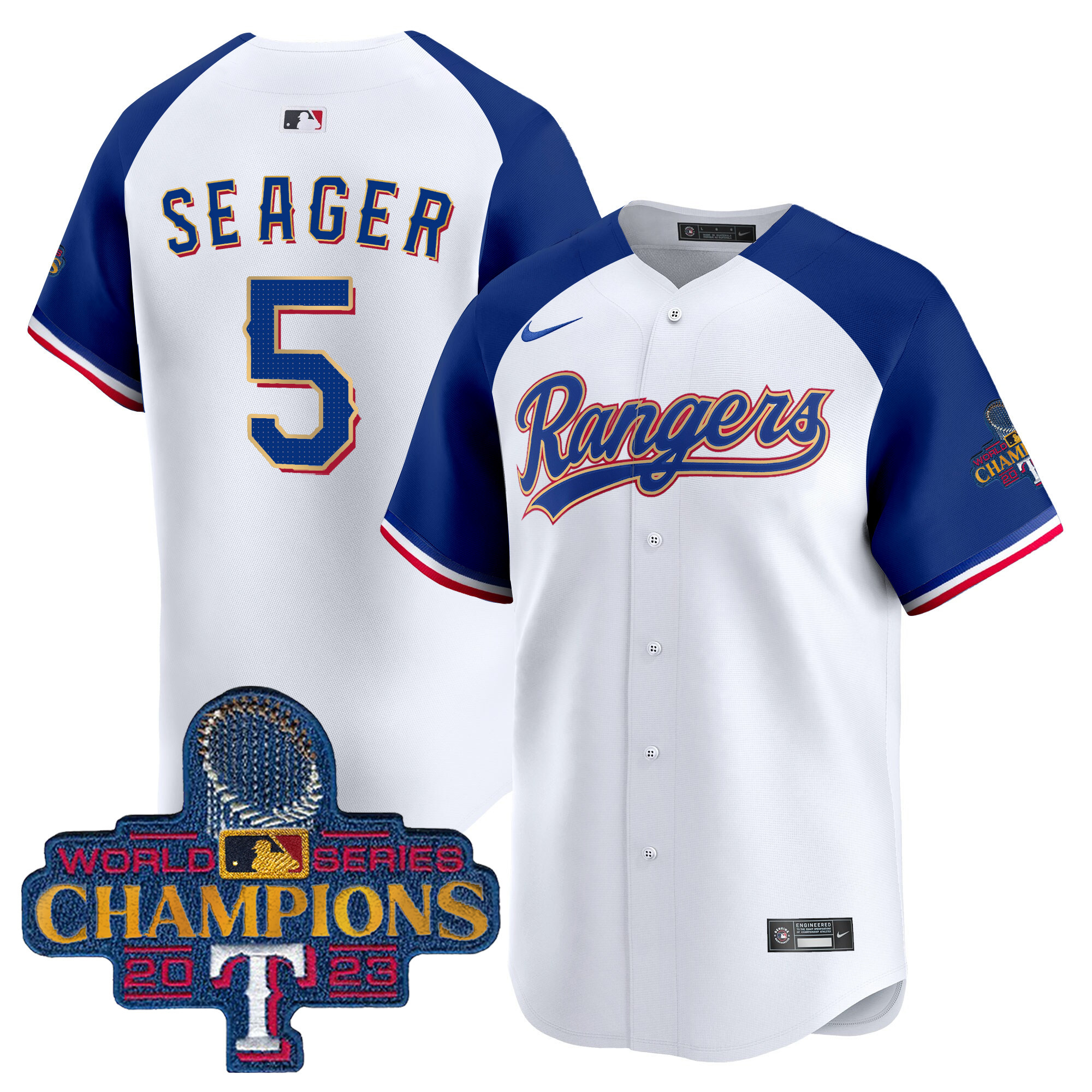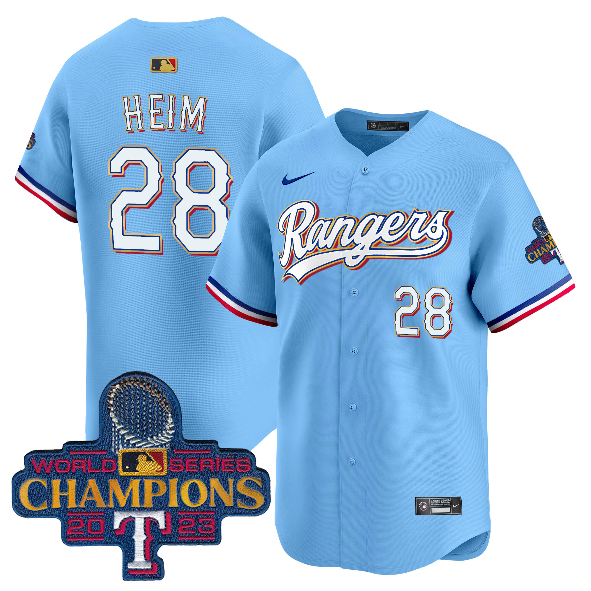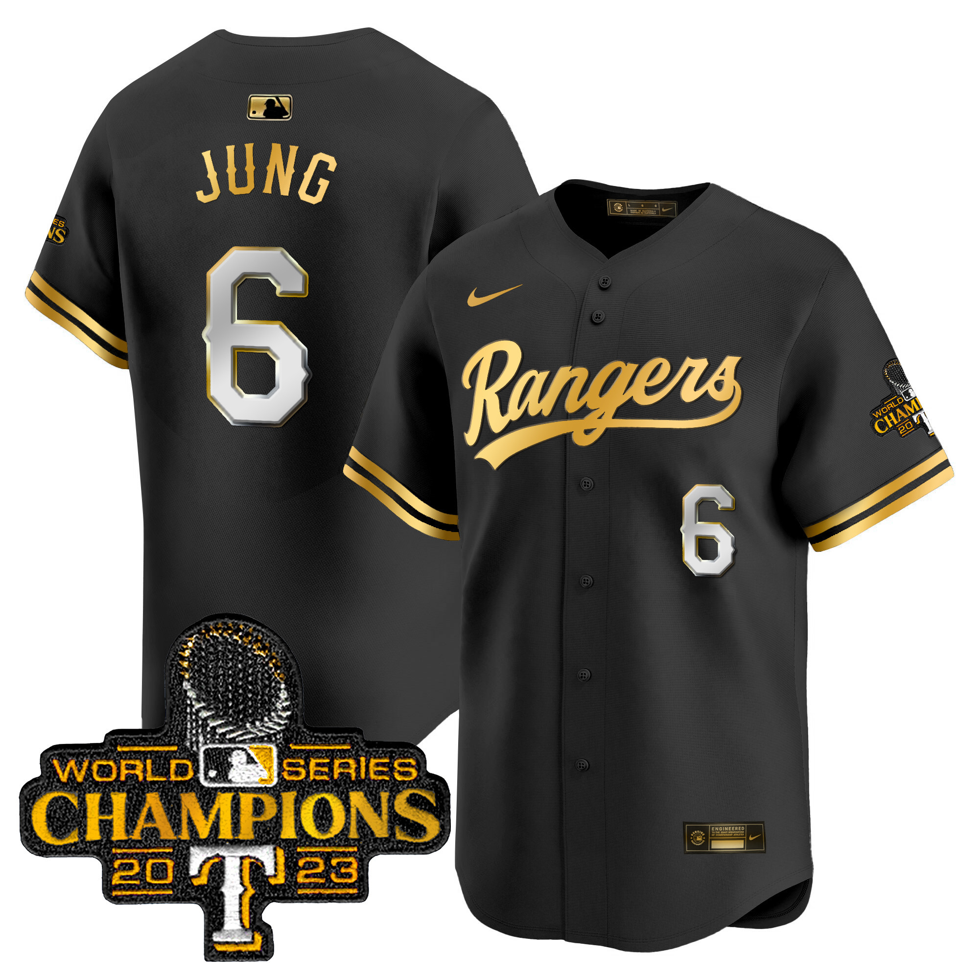 Men’s Texas Rangers 2023 World Series Champions Gold Trim Vapor Premier Limited Jersey – All Stitched