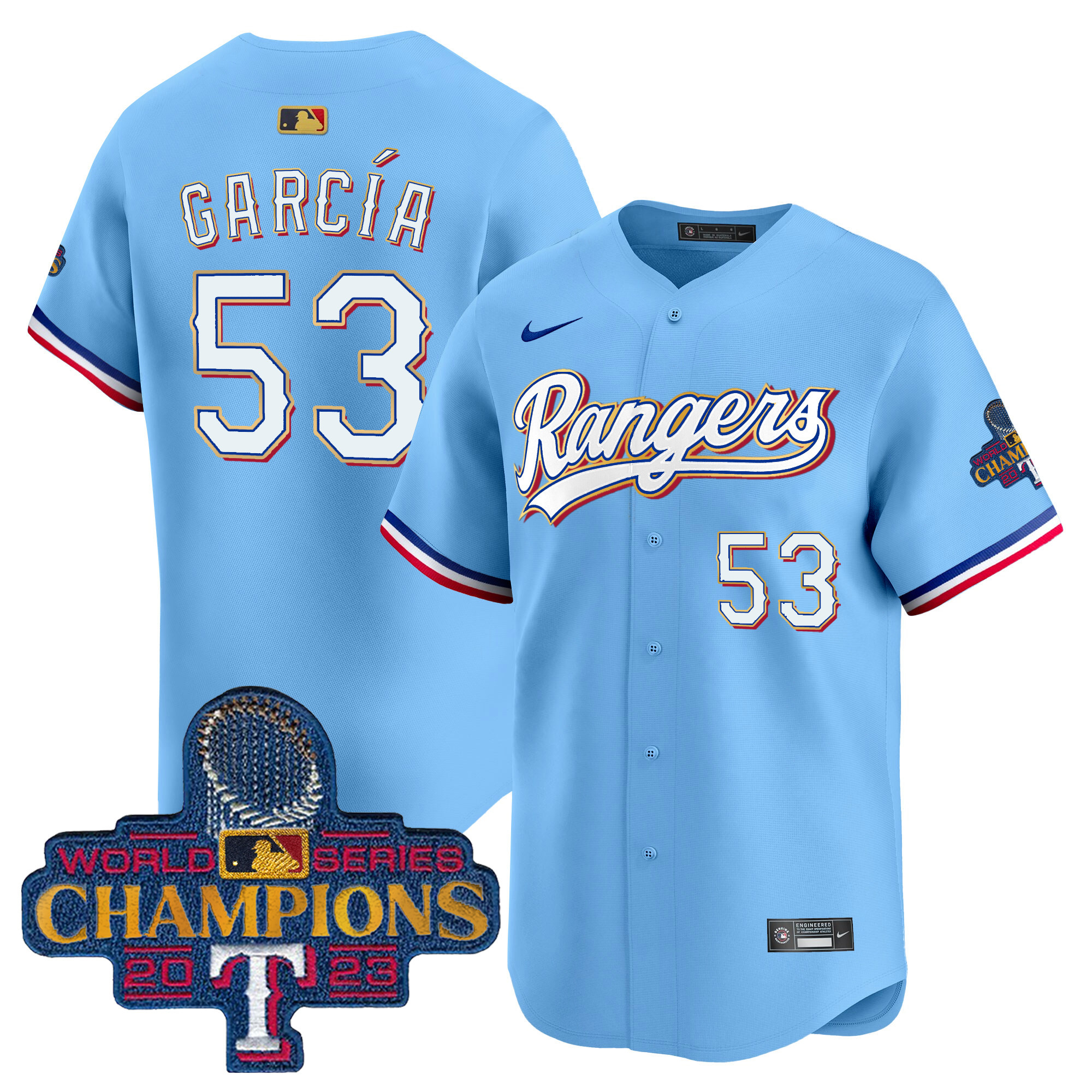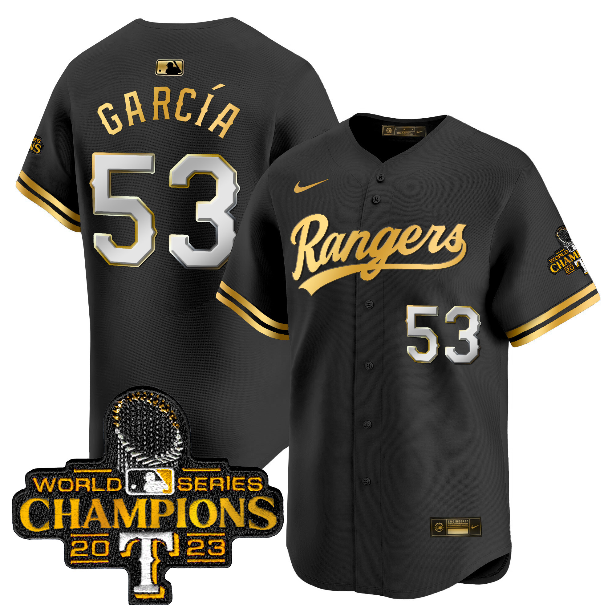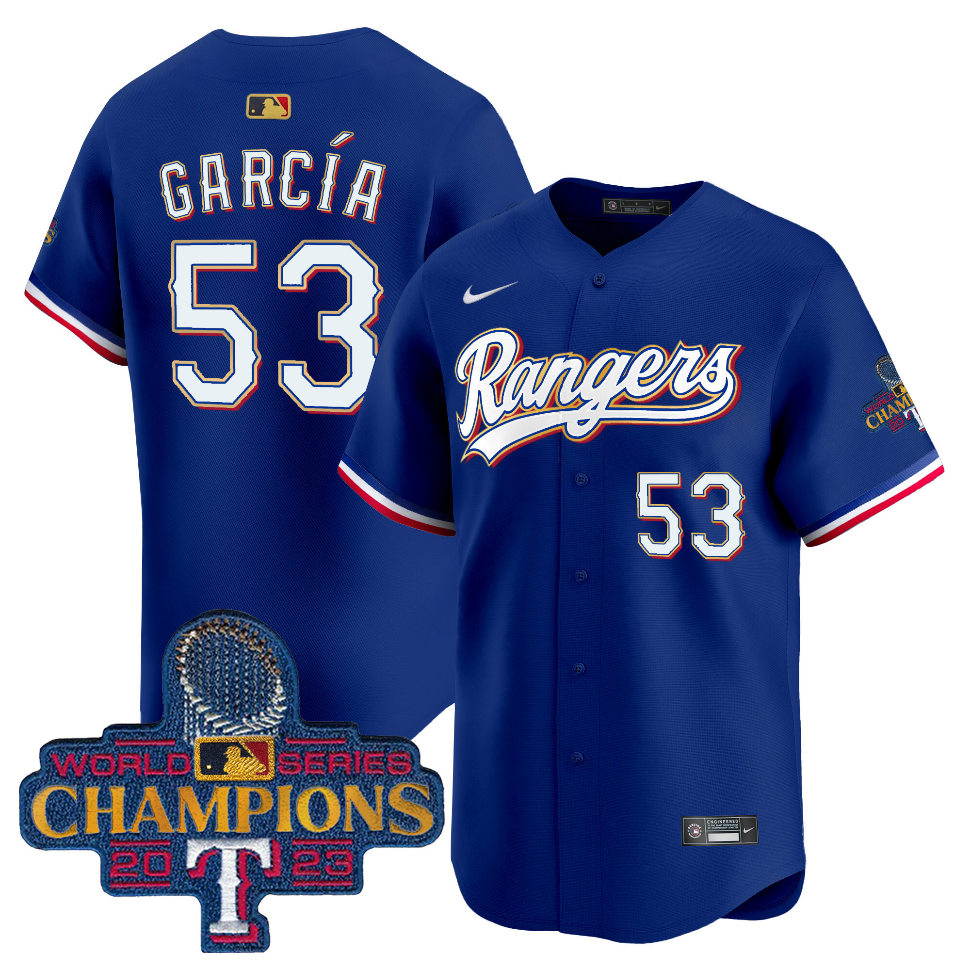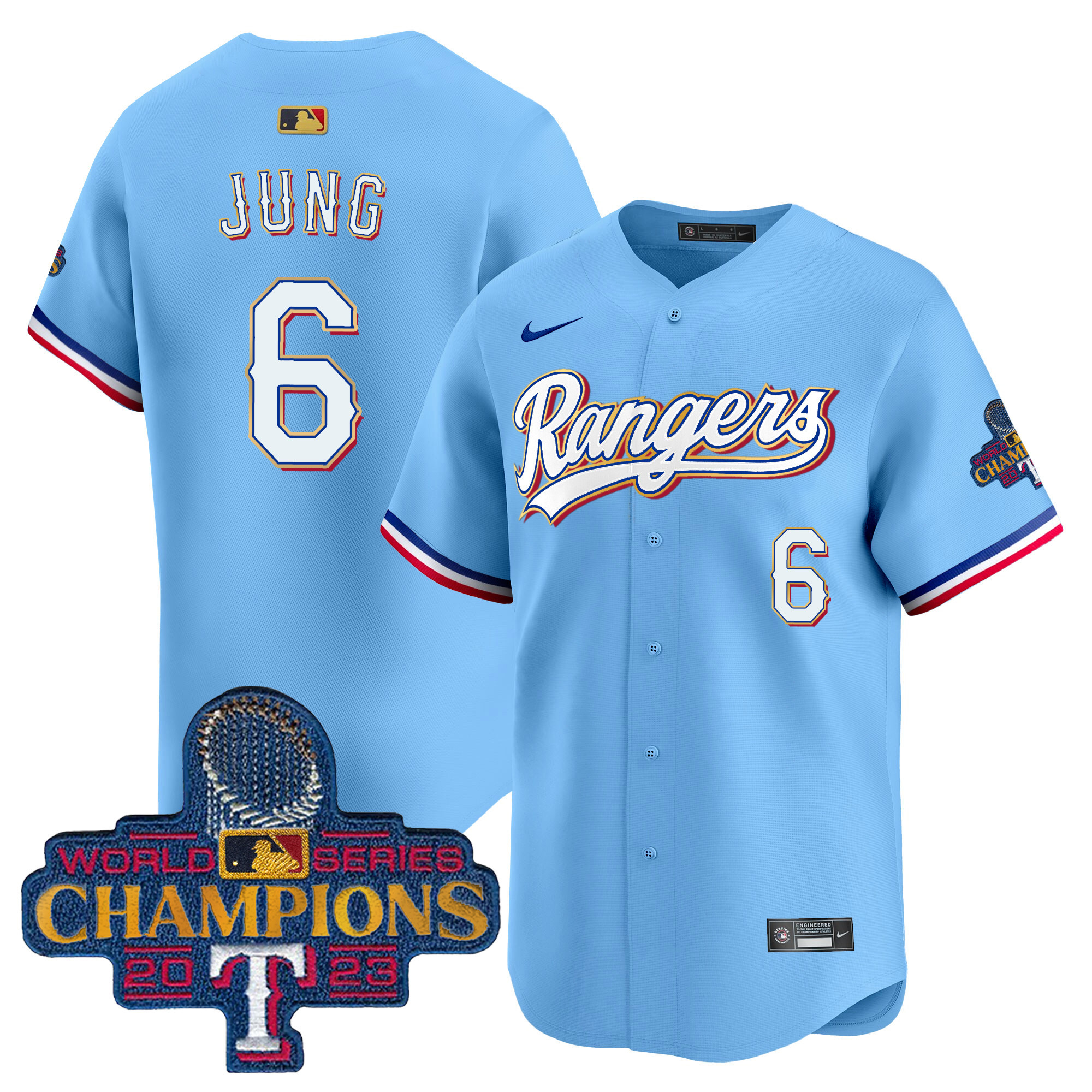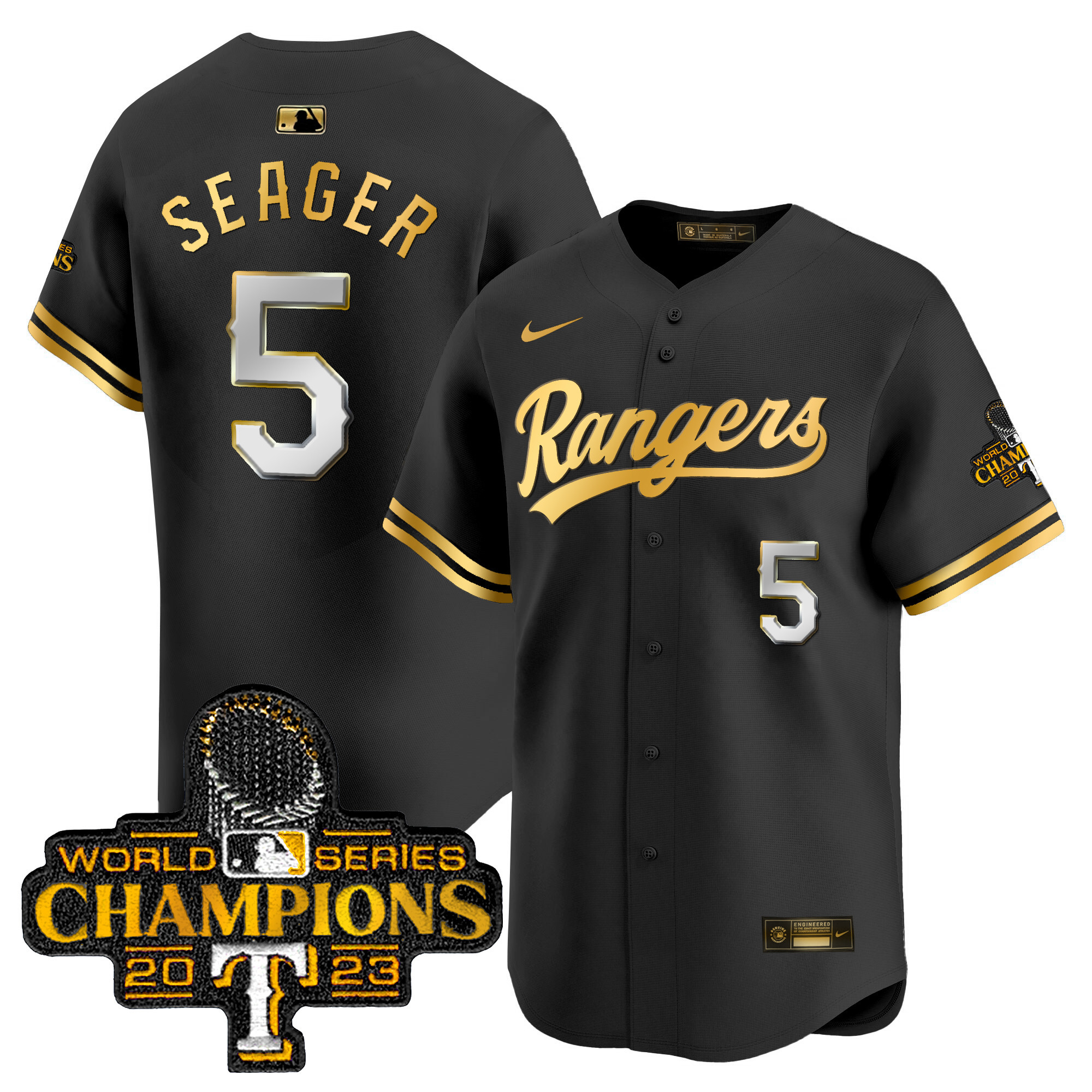 Men’s Texas Rangers 2023 World Series Champions Gold Trim Vapor Premier Limited Jersey – All Stitched