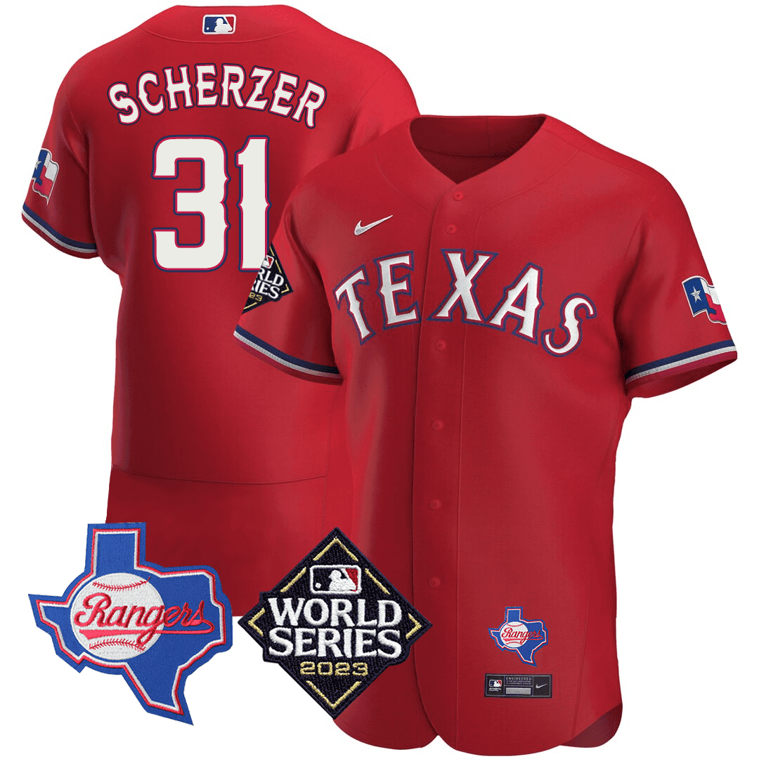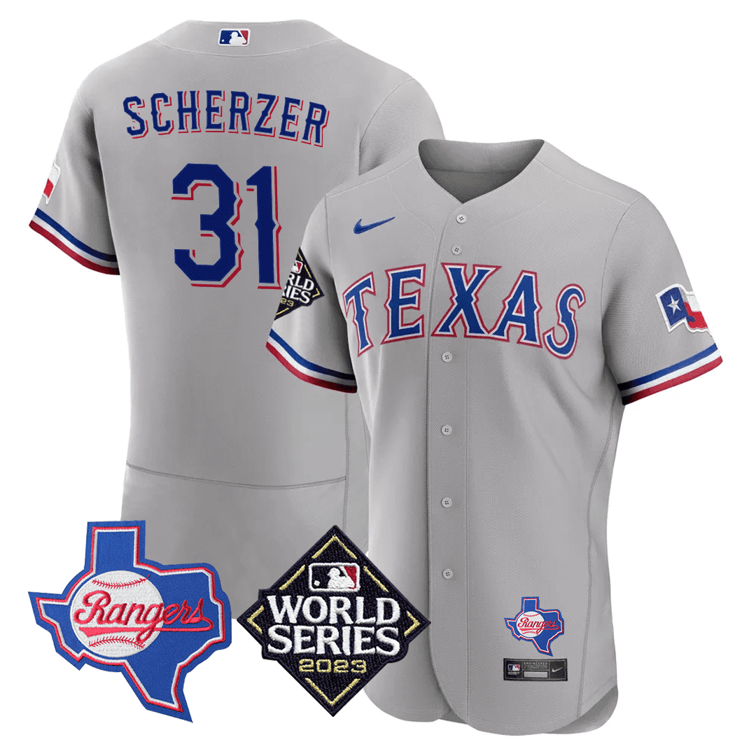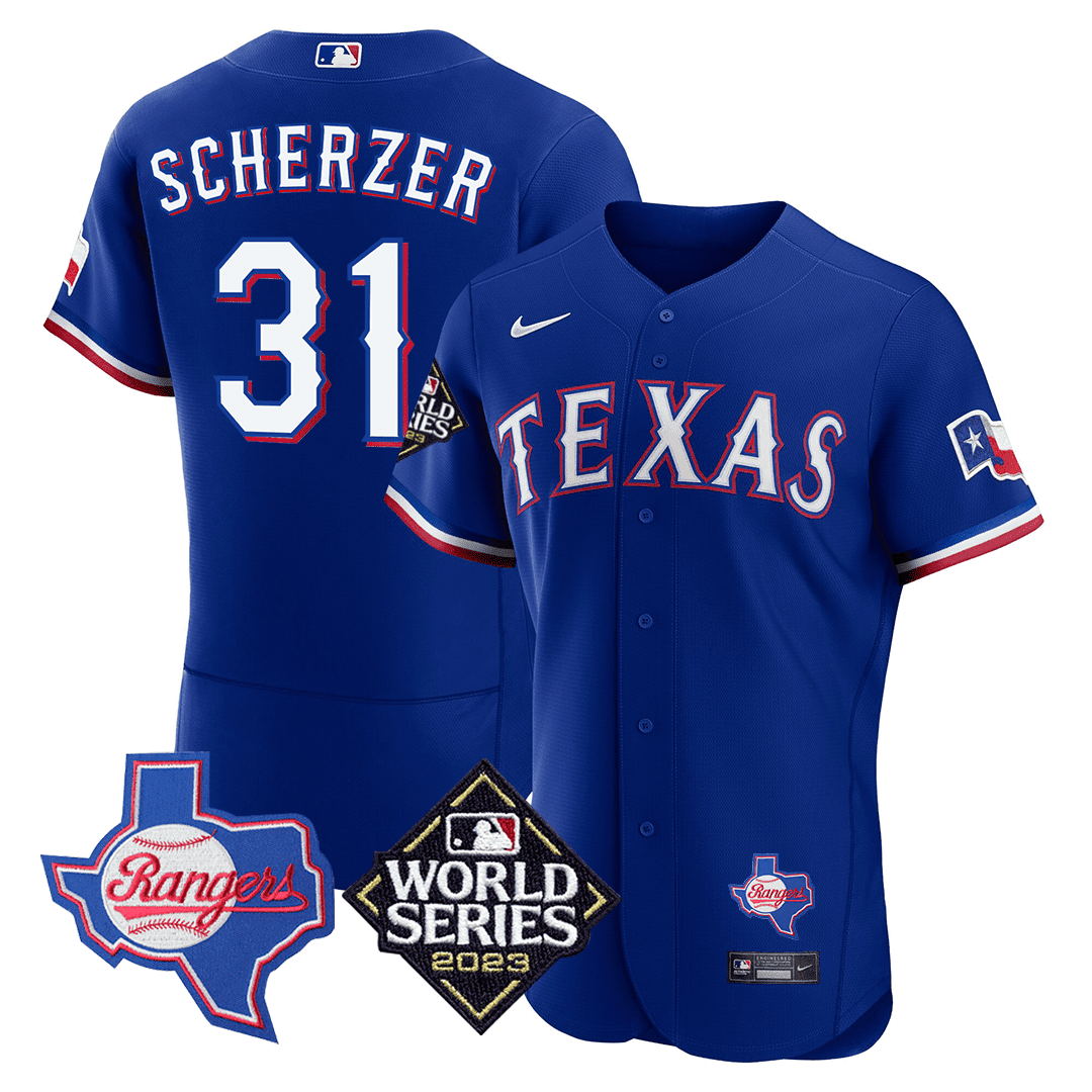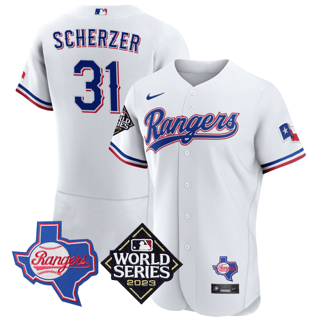 Men’s Texas Rangers Texas State & 2023 World Series Patch Jersey – All Stitched