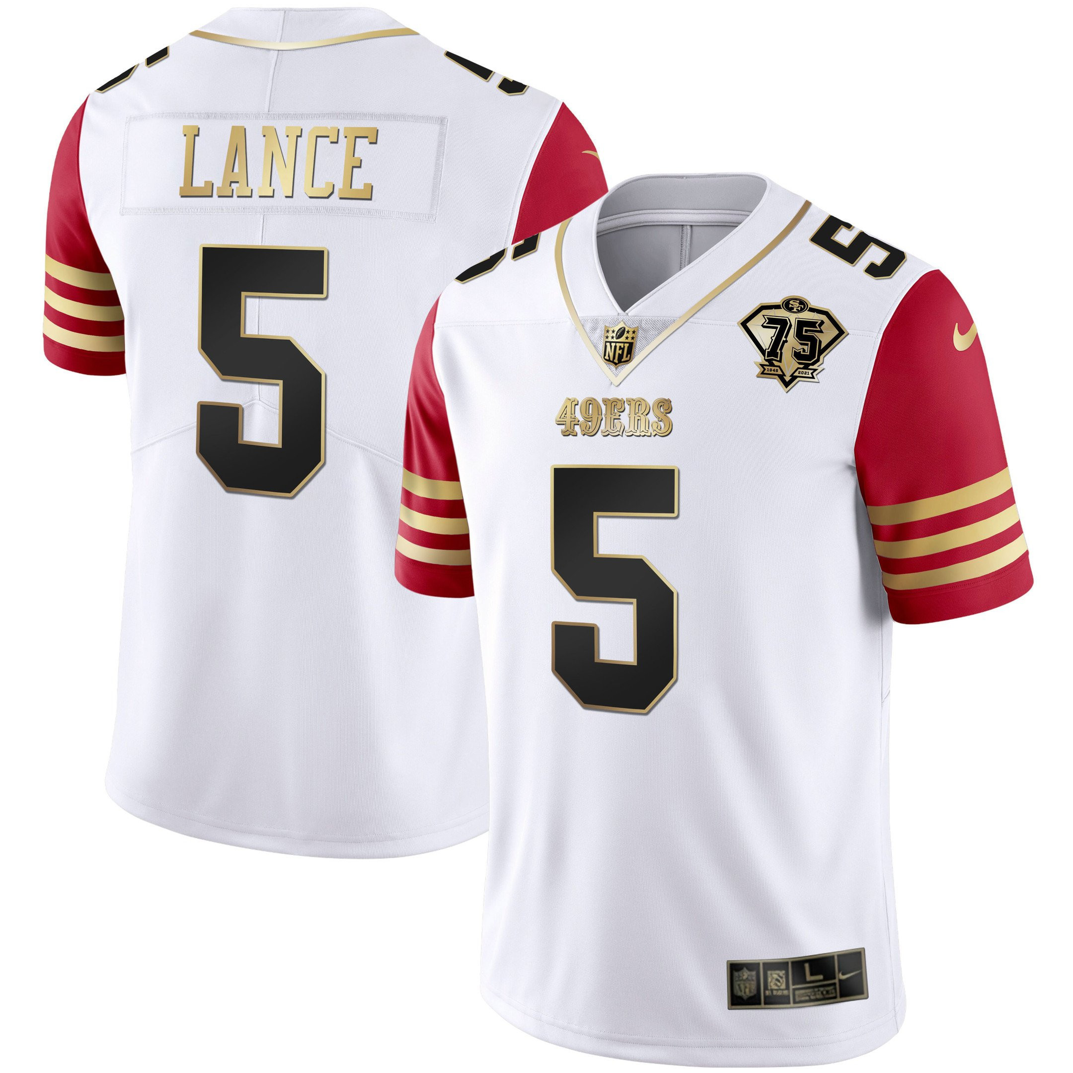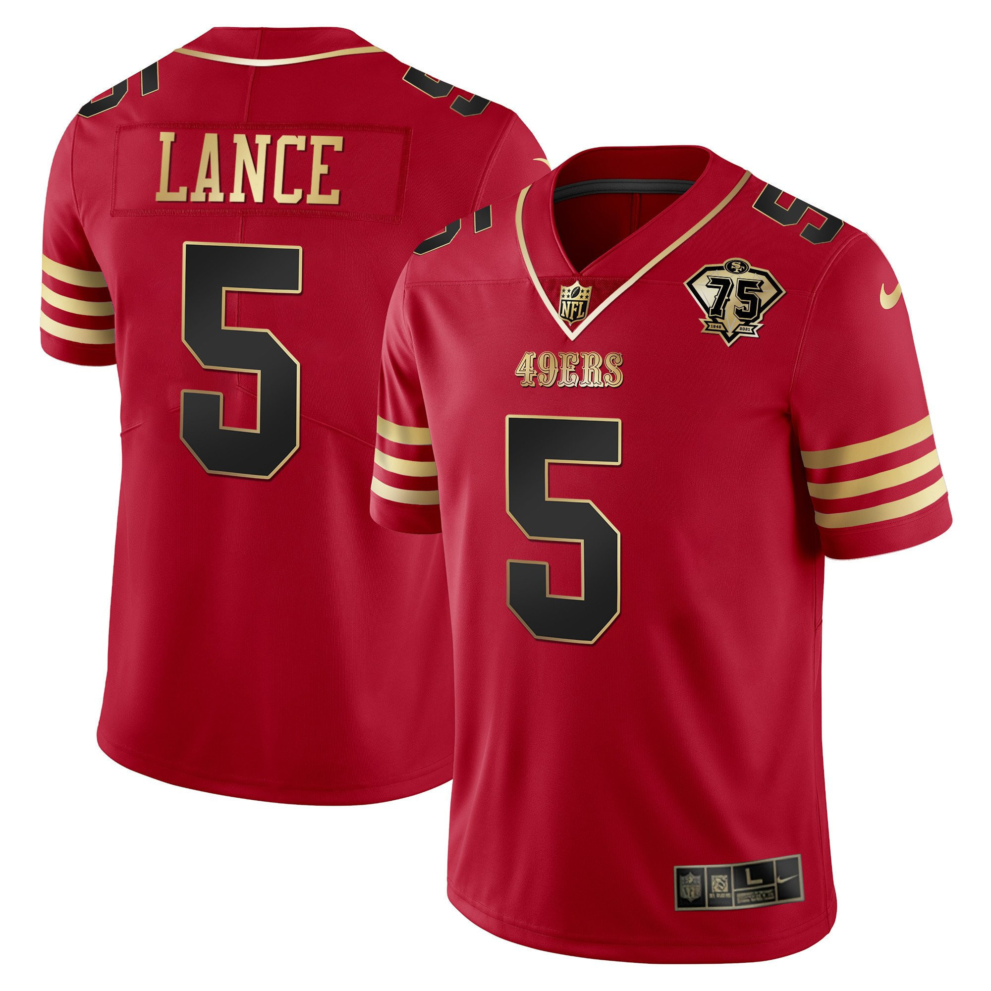 Men’s Trey Lance 49ers 75th Anniversary Patch Vapor Black Red Gold Limited – All Stitched