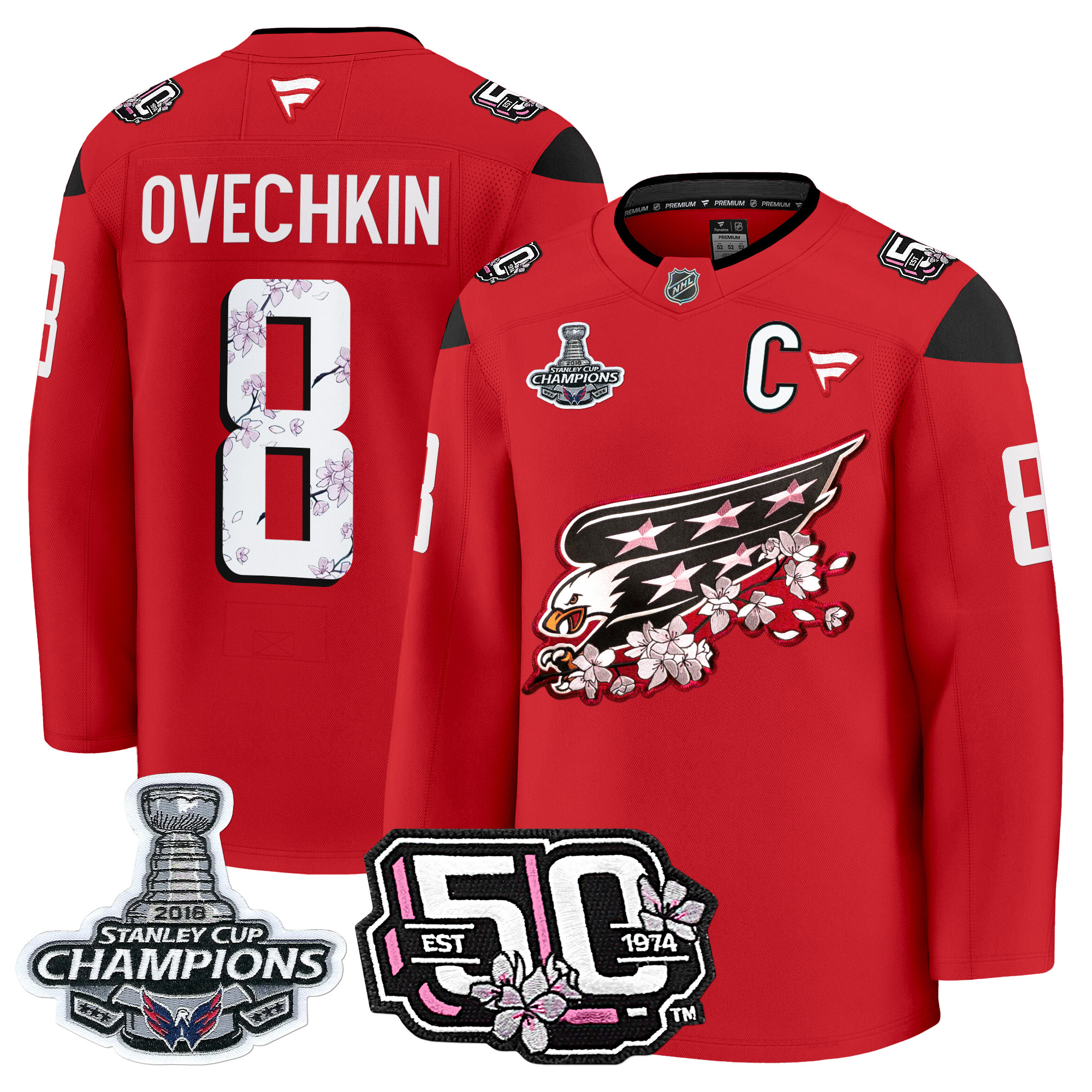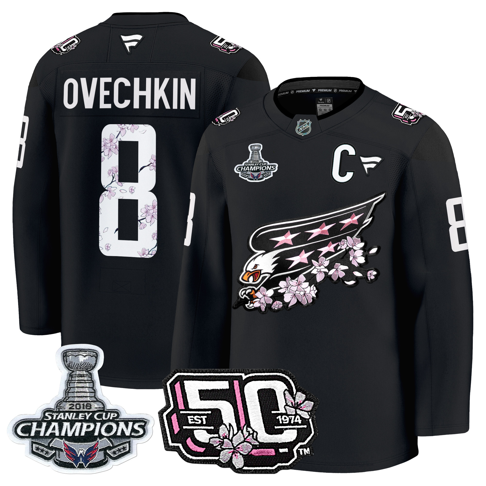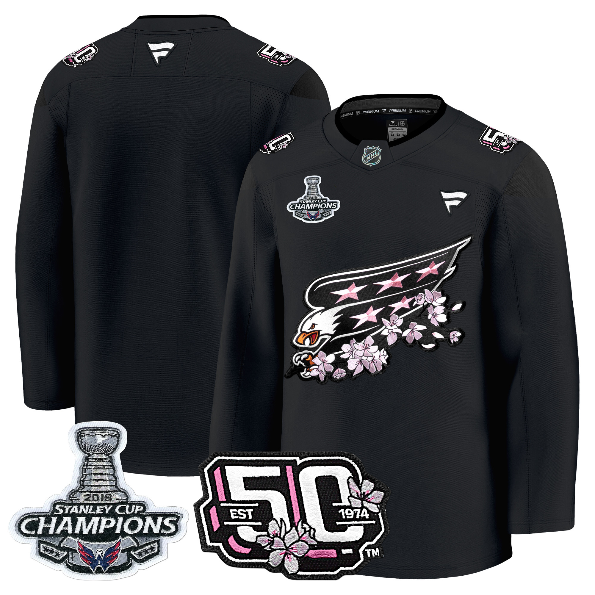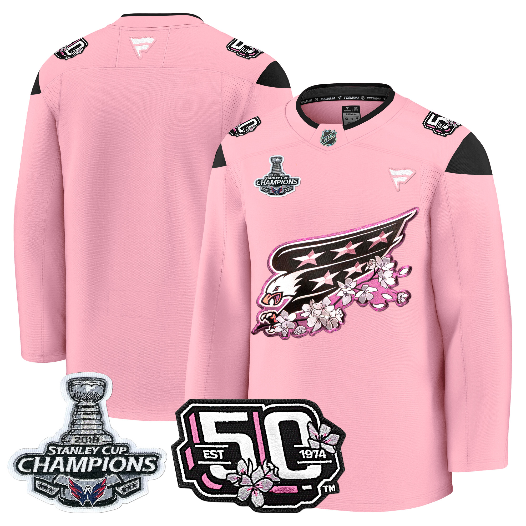 Men’s Washington Capitals 50th Anniversary & 2018 Stanley Cup Champions Patch Cherry Blossom Premium Jersey – All Stitched