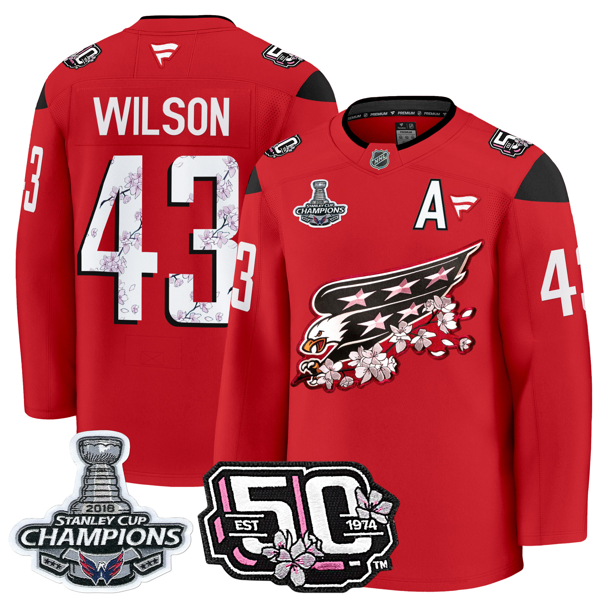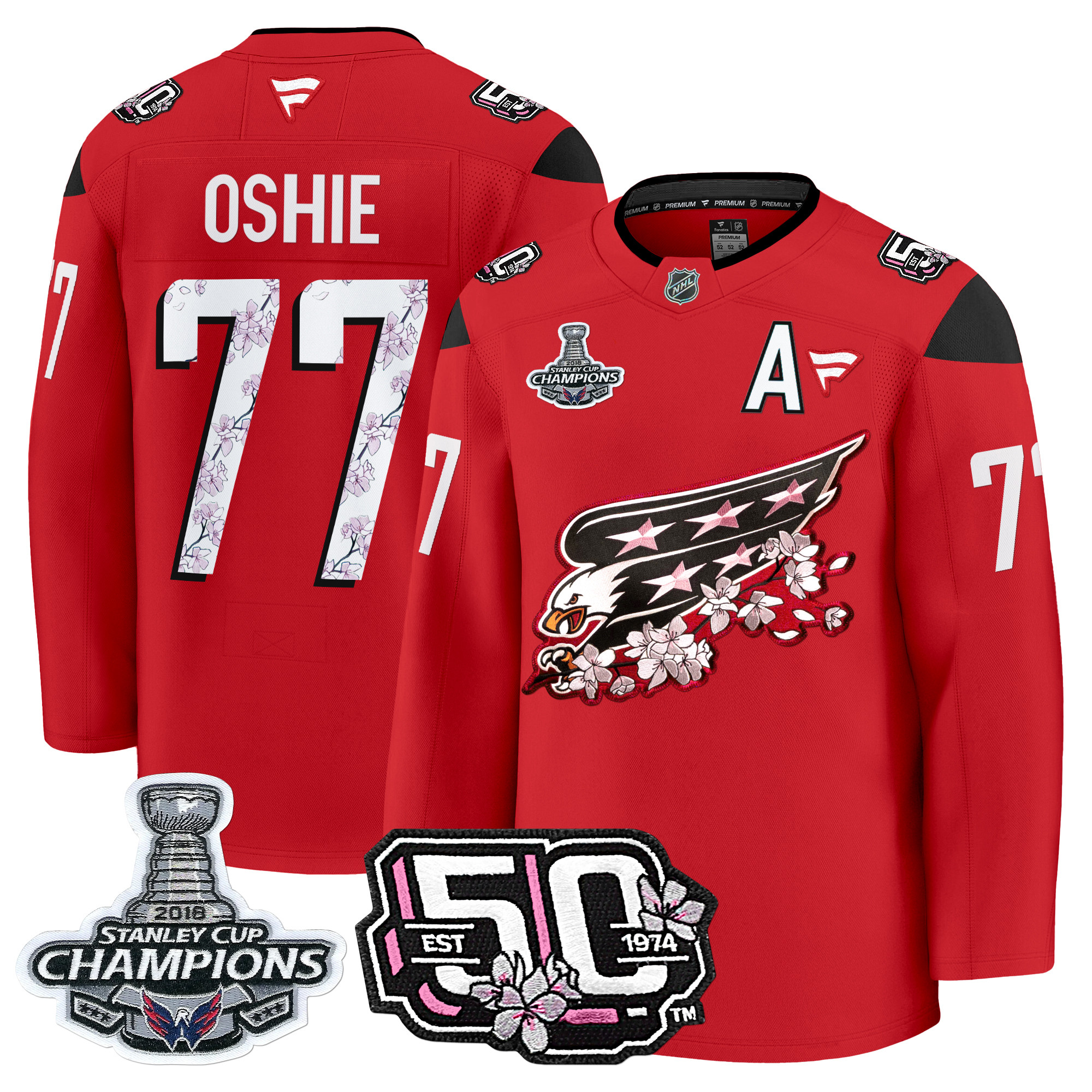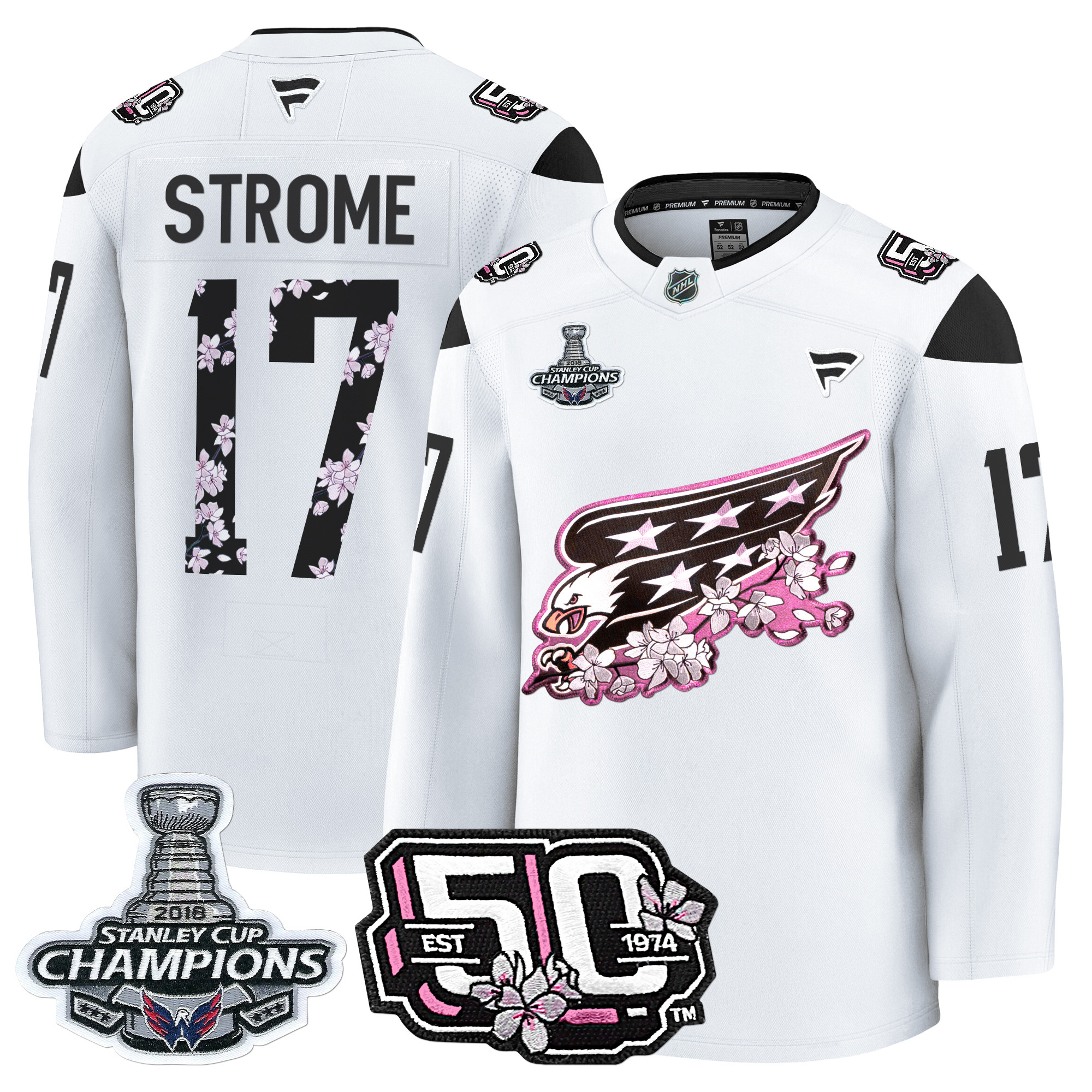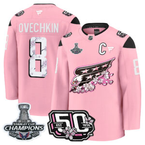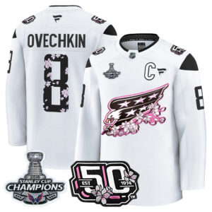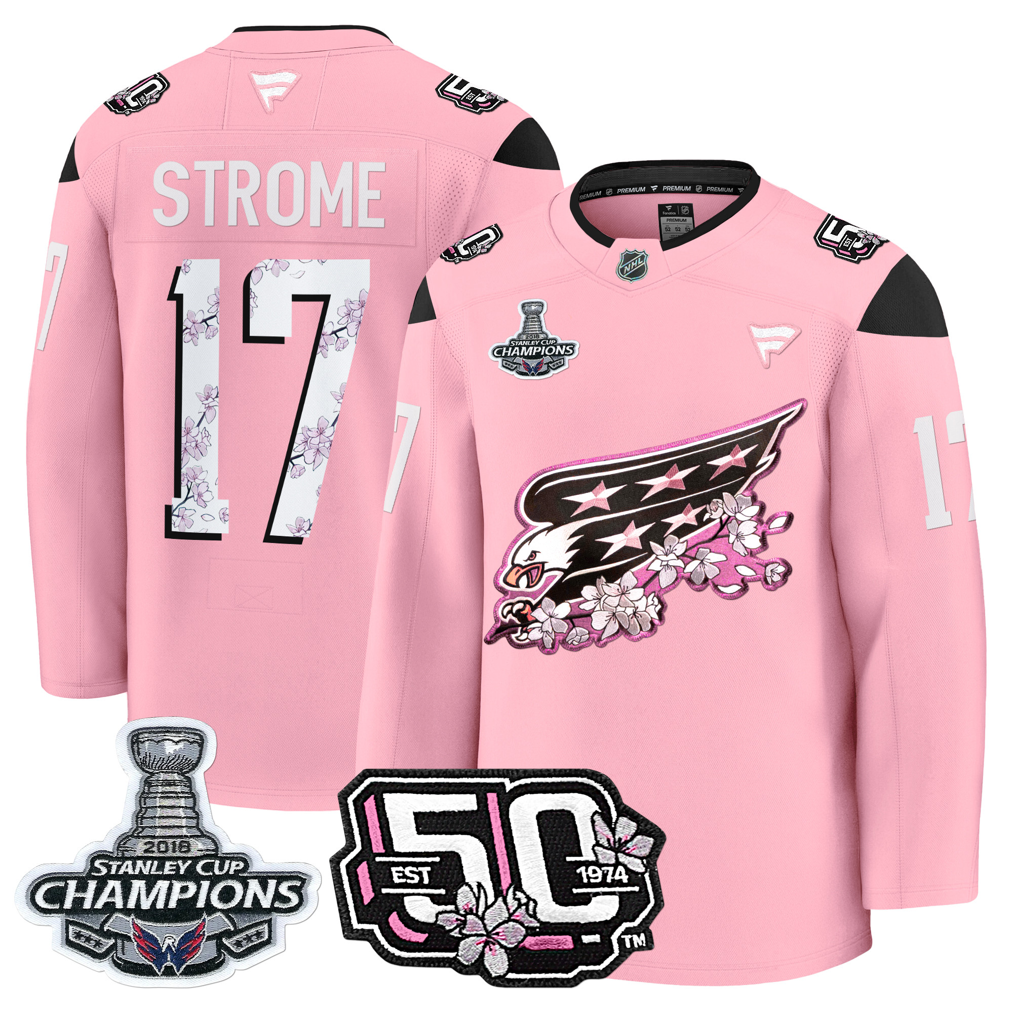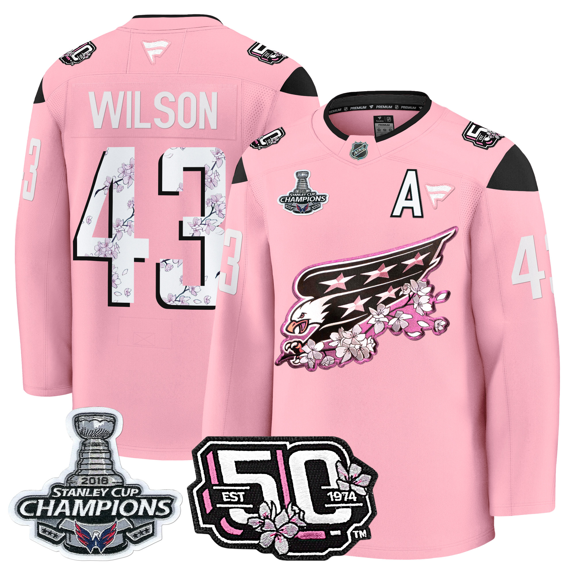 Men’s Washington Capitals 50th Anniversary & 2018 Stanley Cup Champions Patch Cherry Blossom Premium Jersey – All Stitched