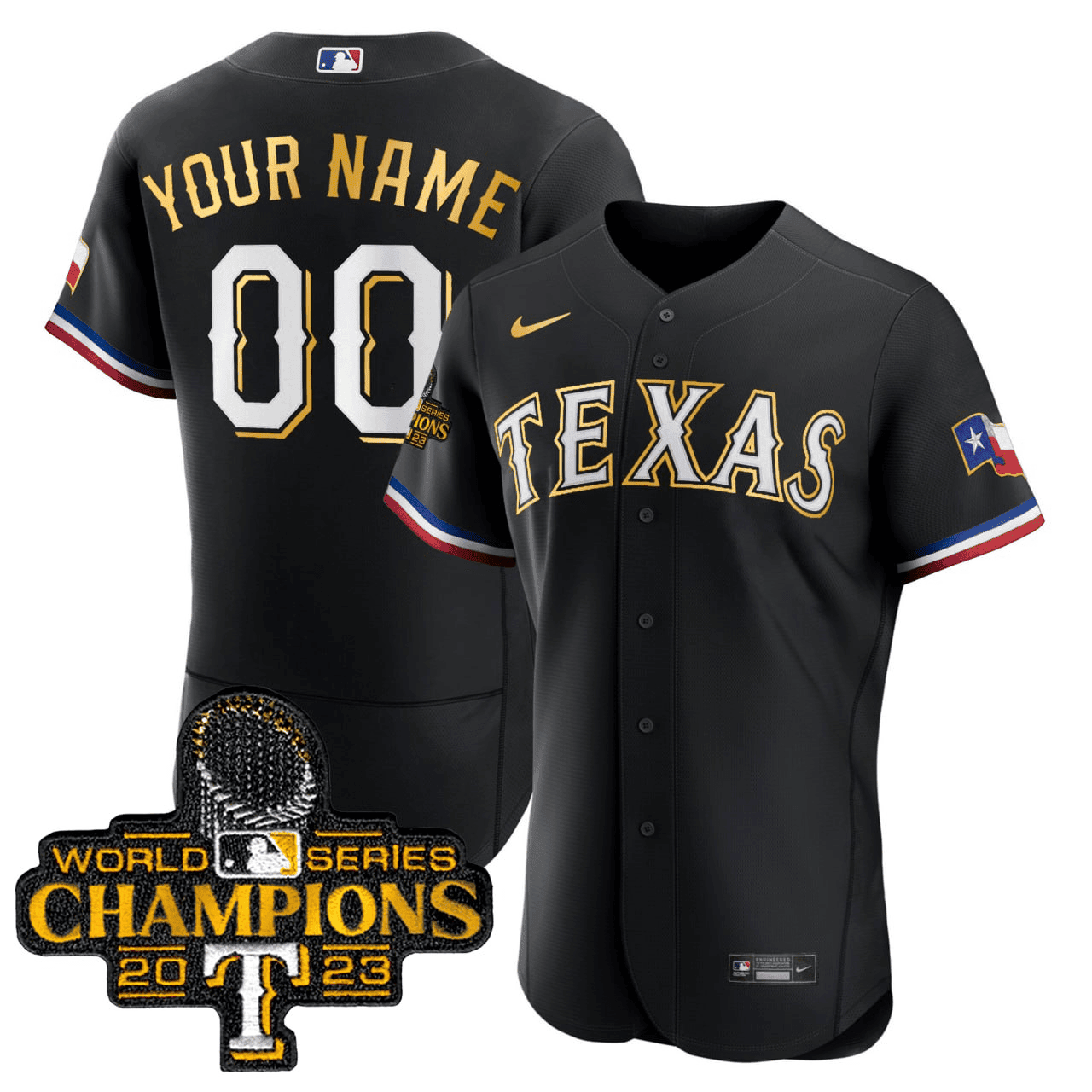 Texas Rangers 2023 World Series Champions Flex Base Gold Trim Custom Jersey – All Stitched