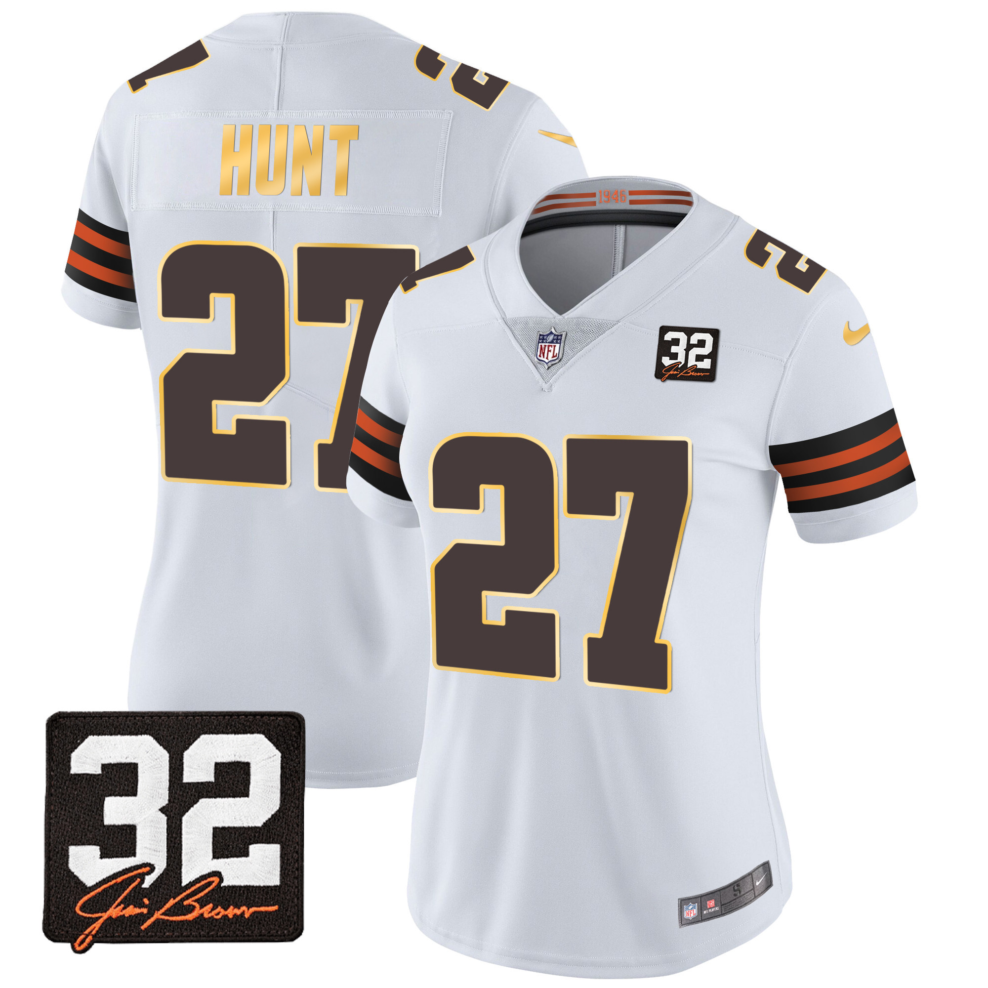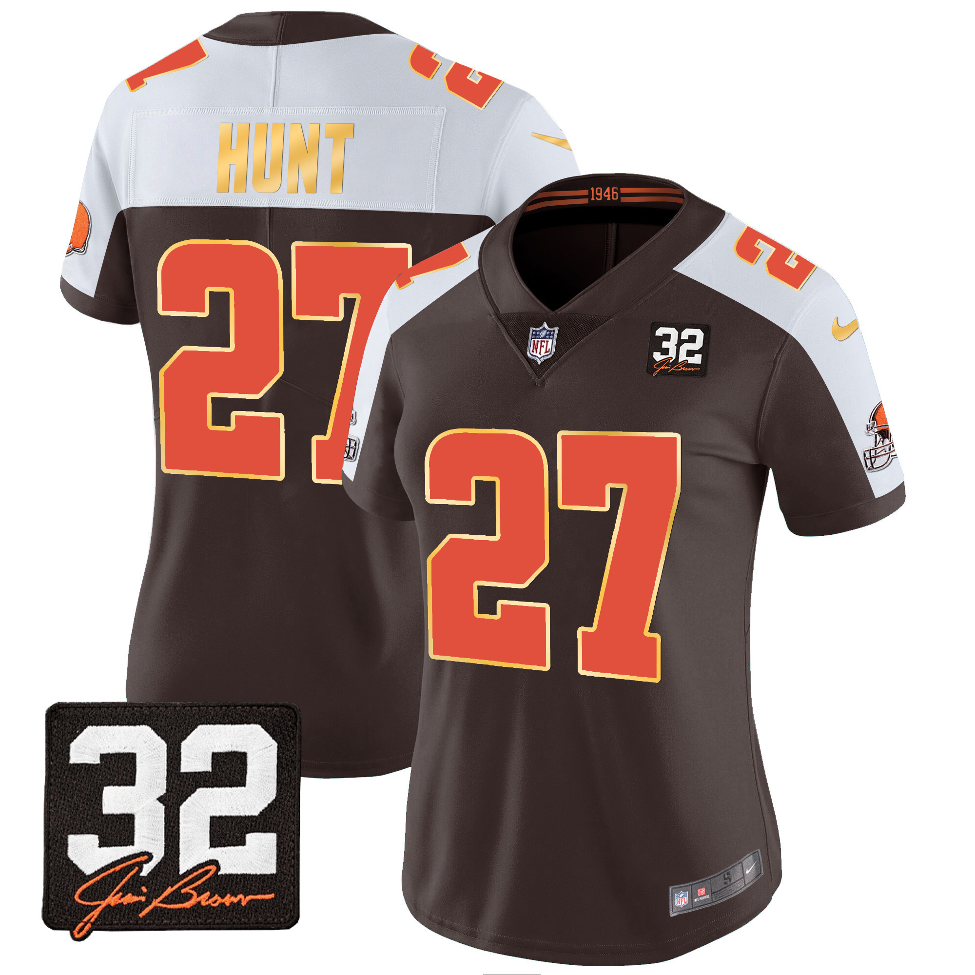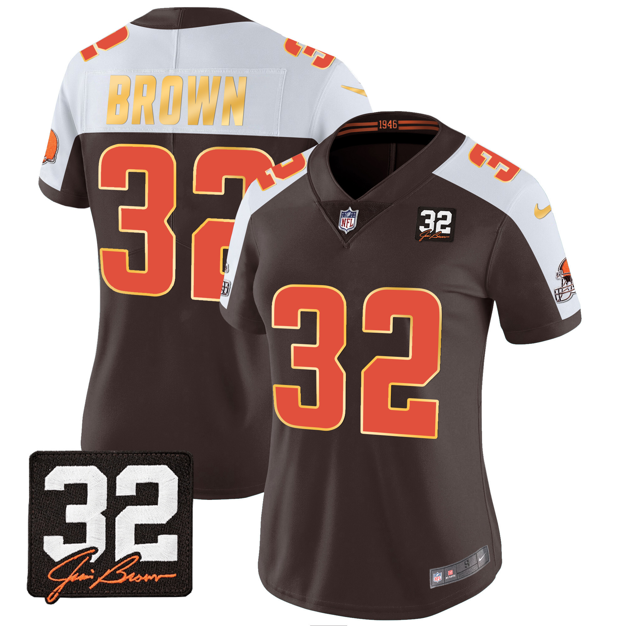 Women’s Browns #32 Jim Brown Memorial Patch Gold Trim Jersey – All Stitched