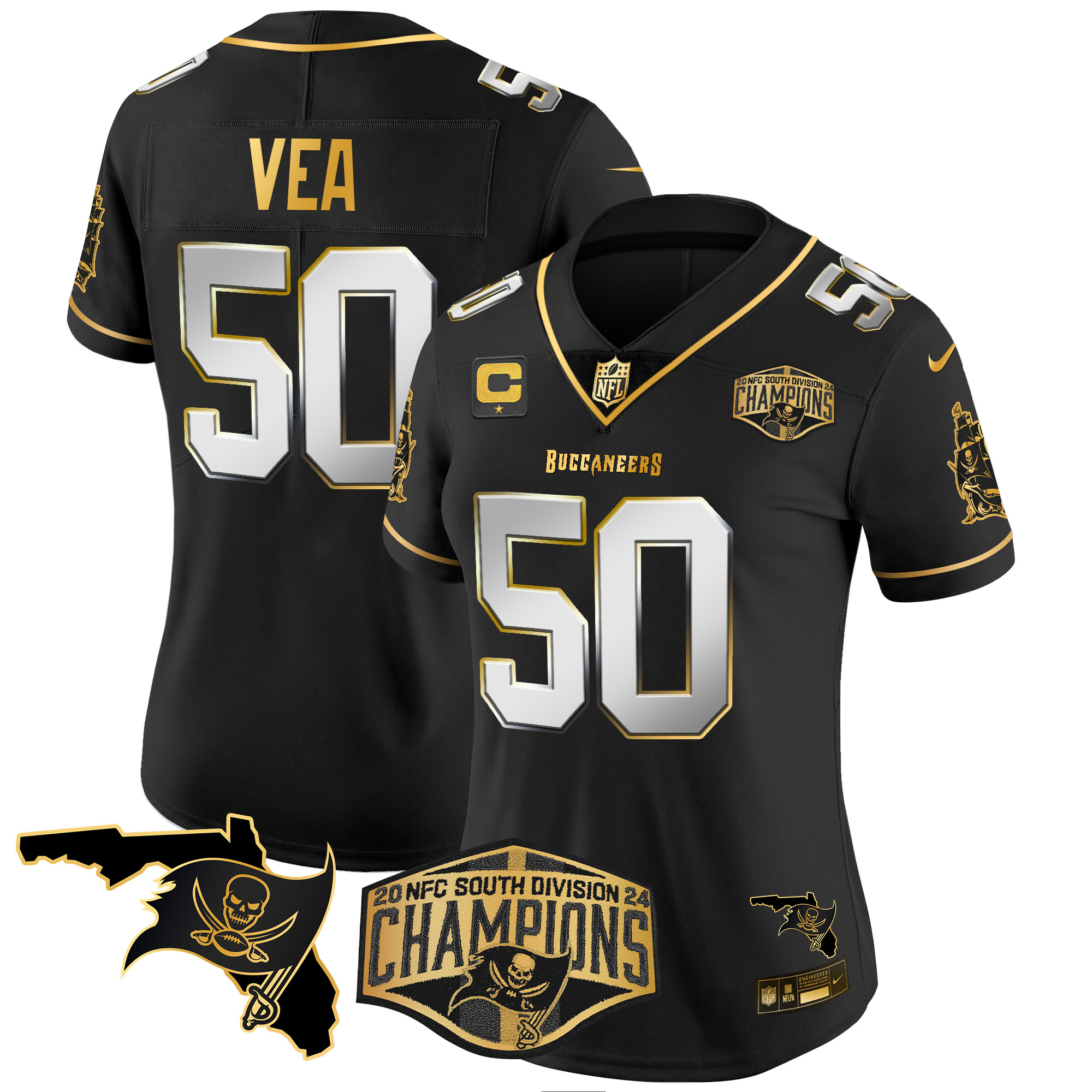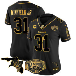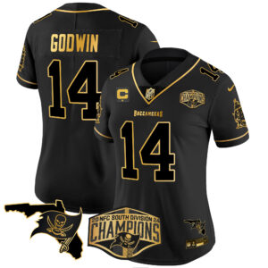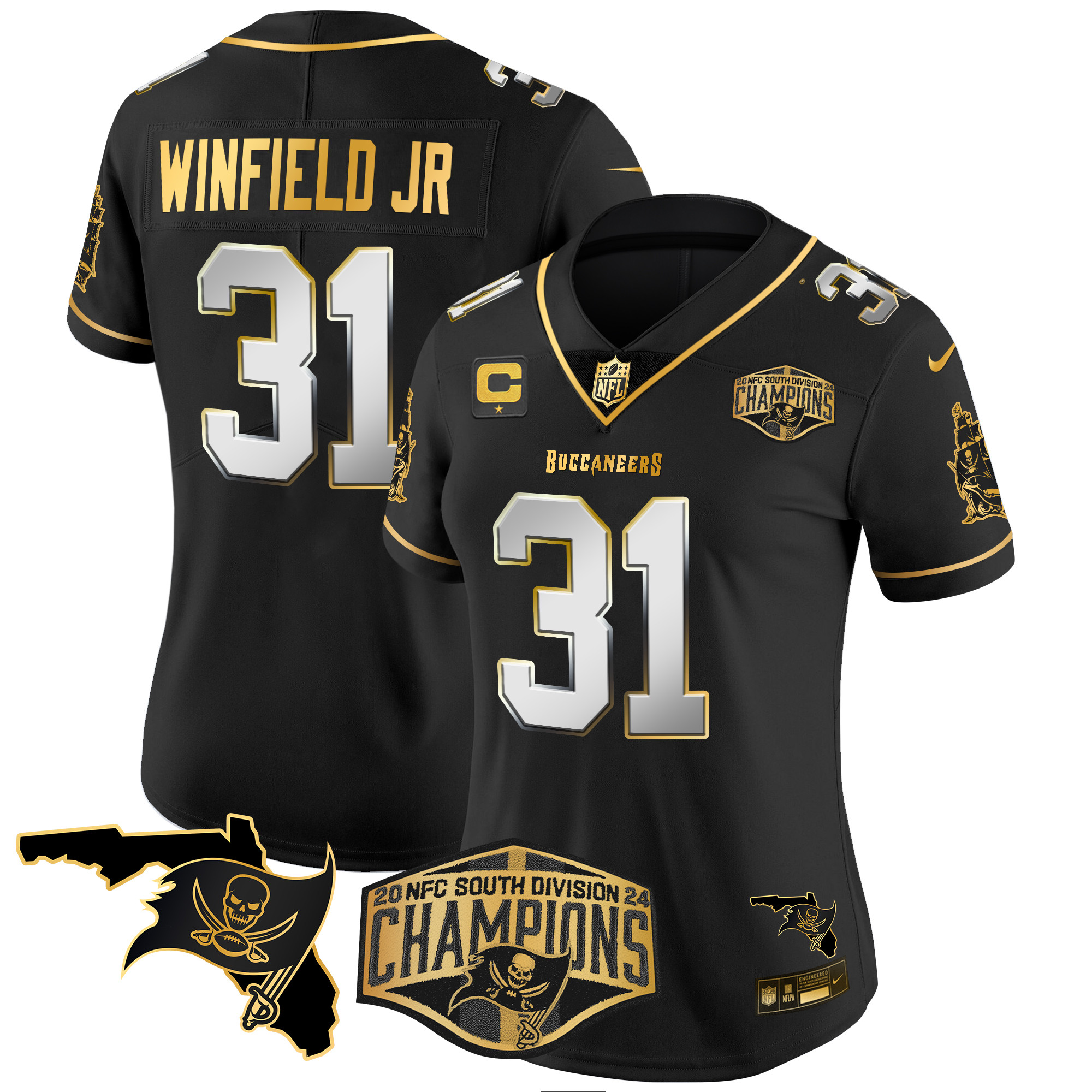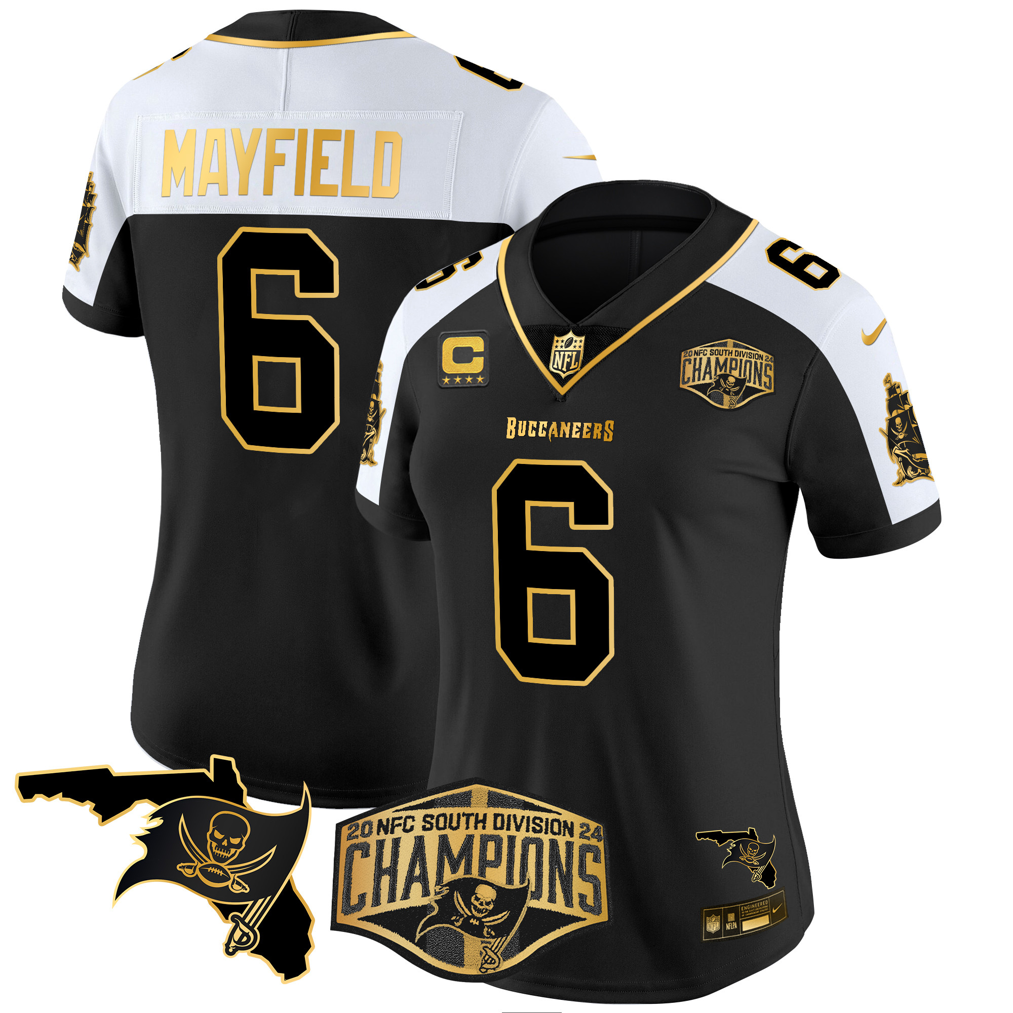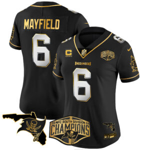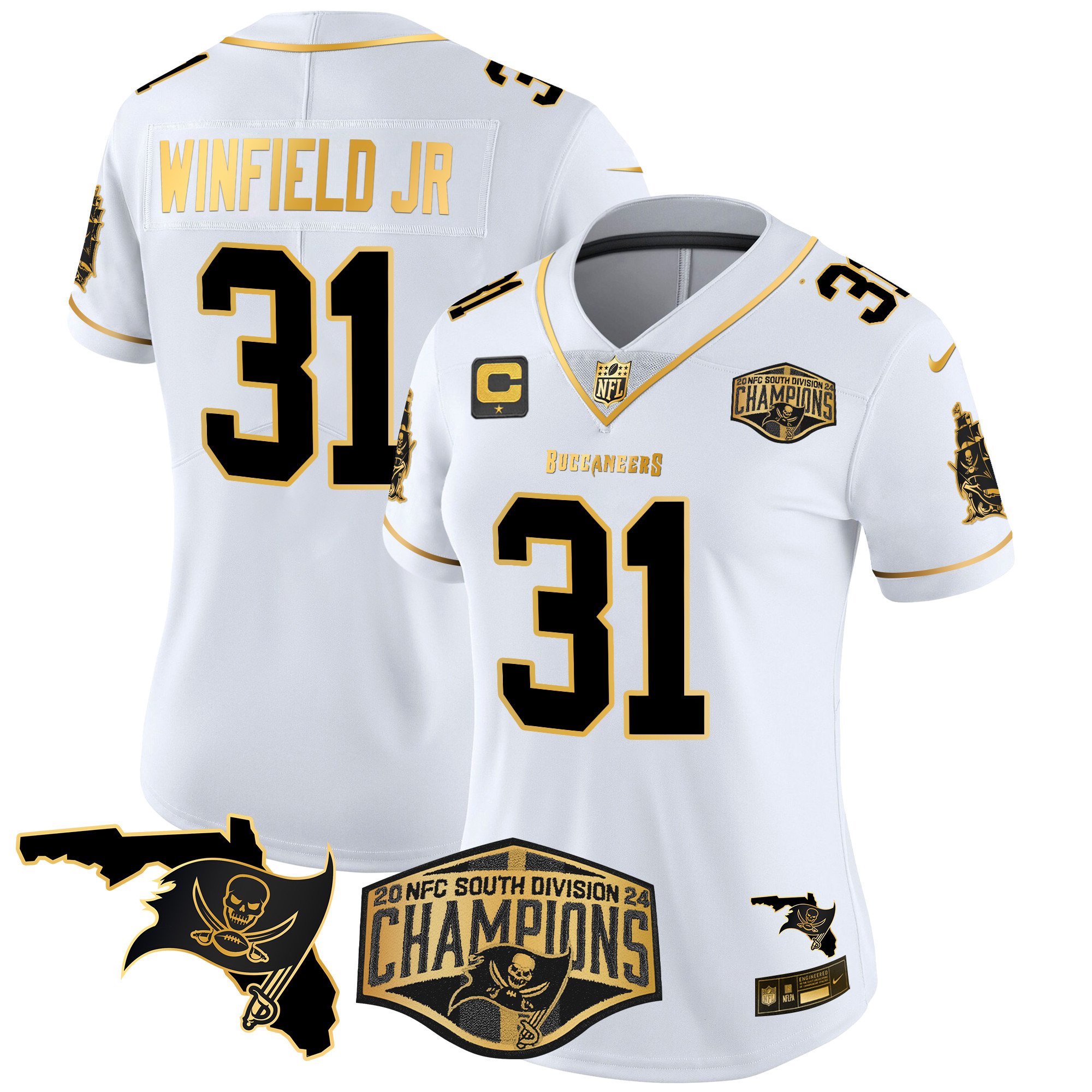 Women’s Buccaneers 2024 NFC South Division Champions Patch Gold Vapor Limited Jersey – All Stitched