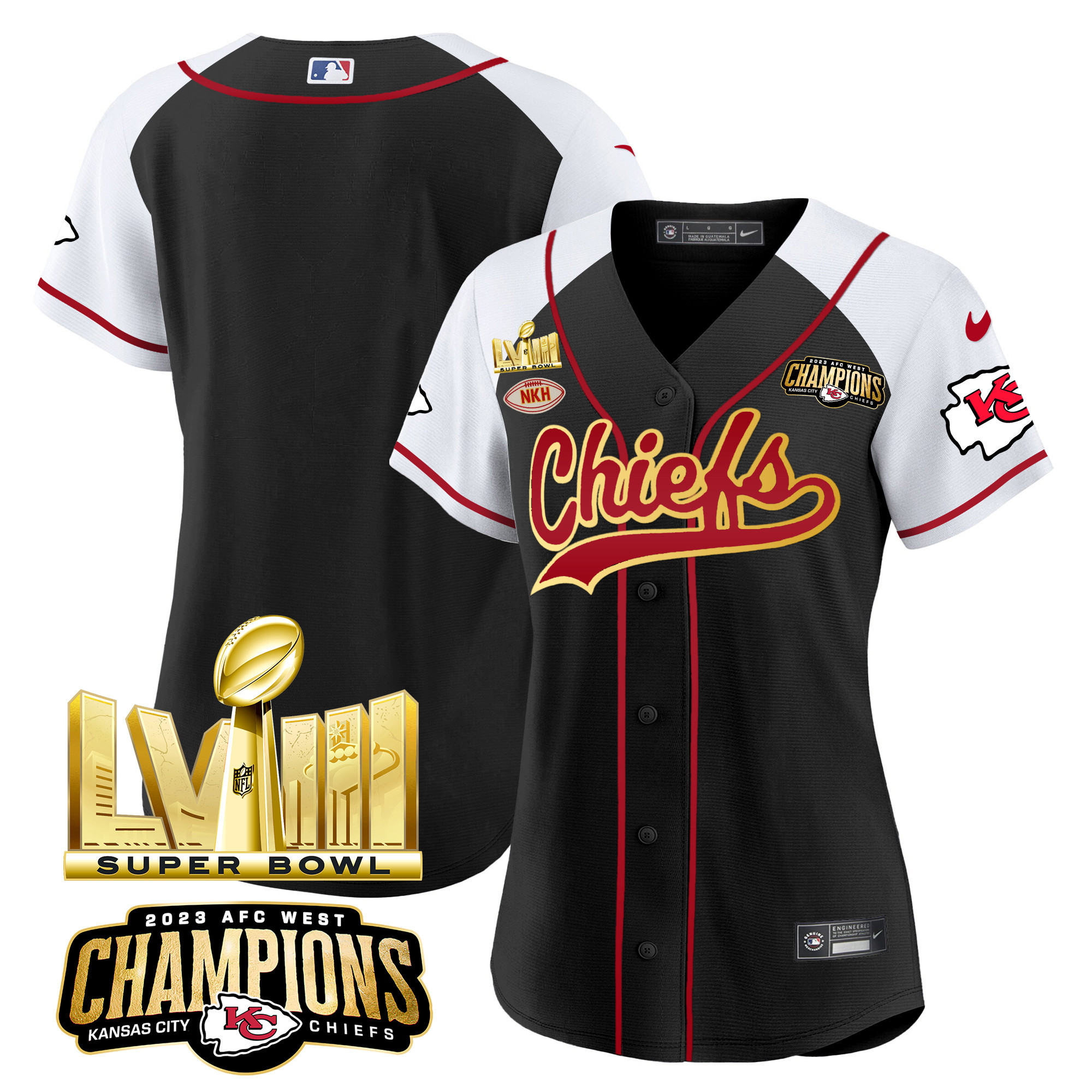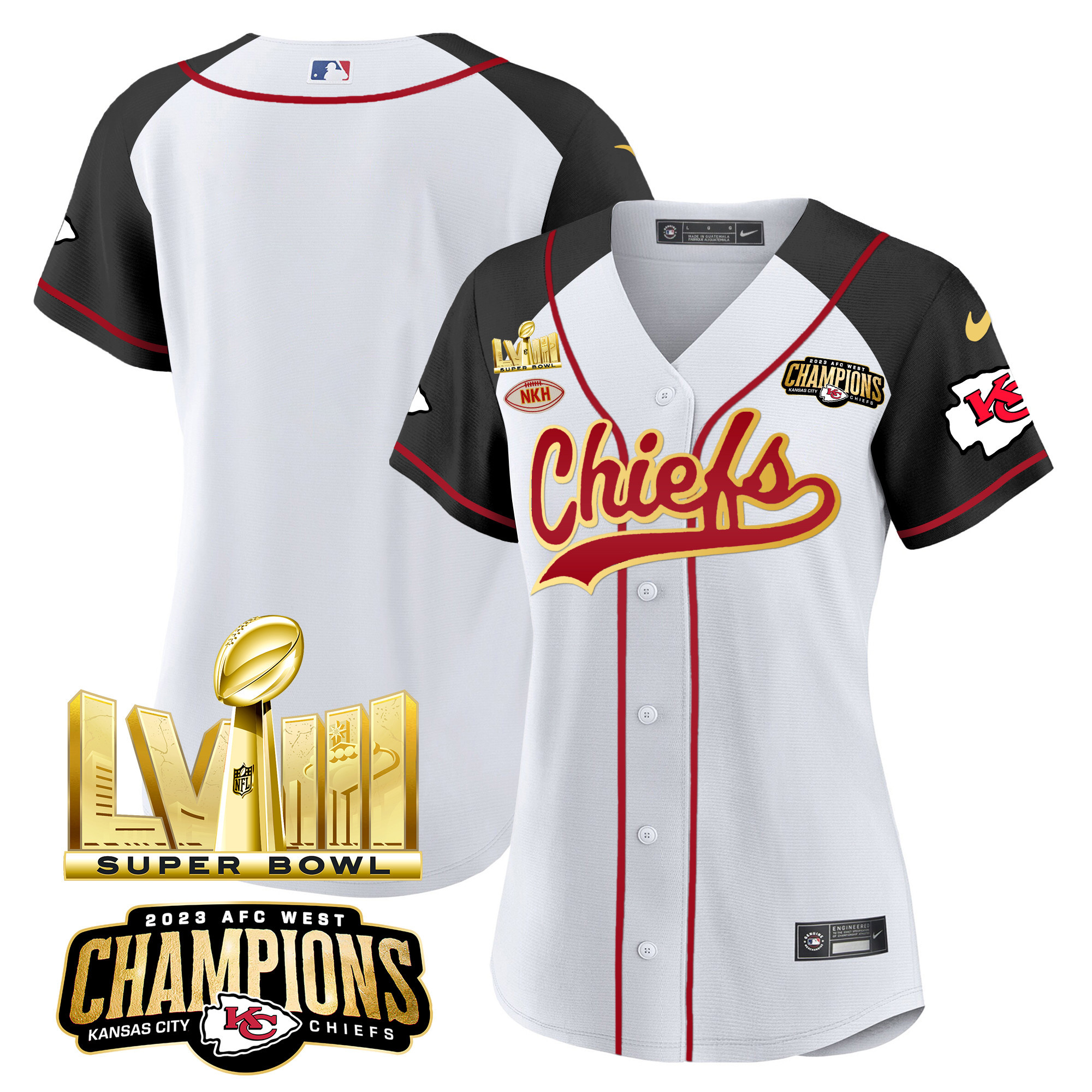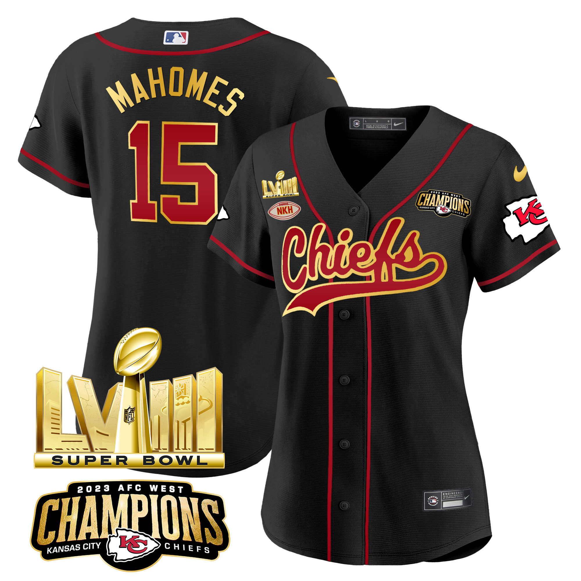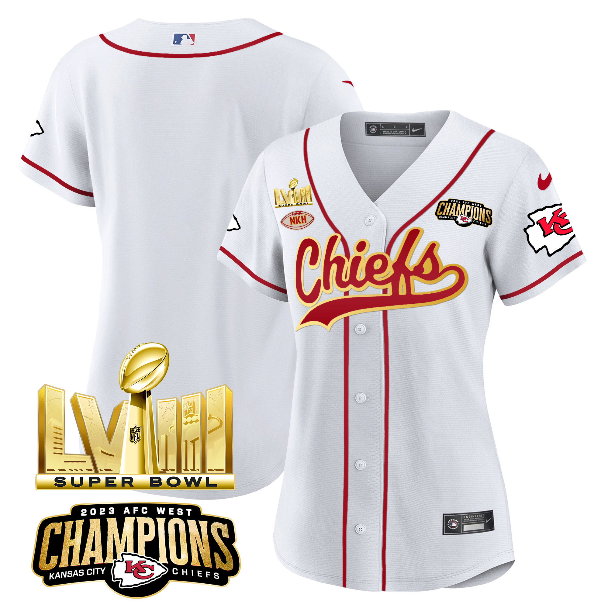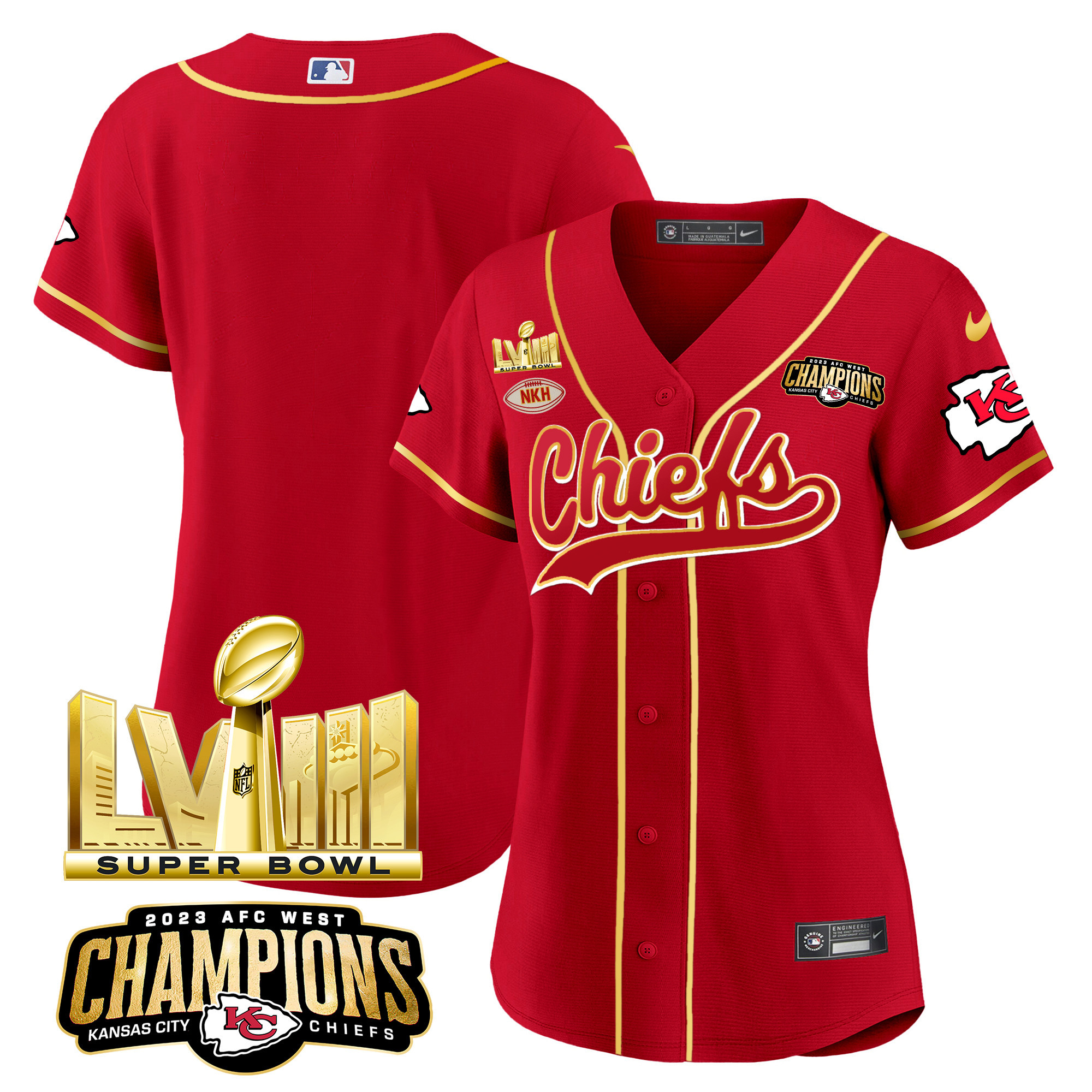 Women’s Chiefs AFC West Champions & Super Bowl LVIII Gold Patch Baseball Jersey – All Stitched