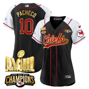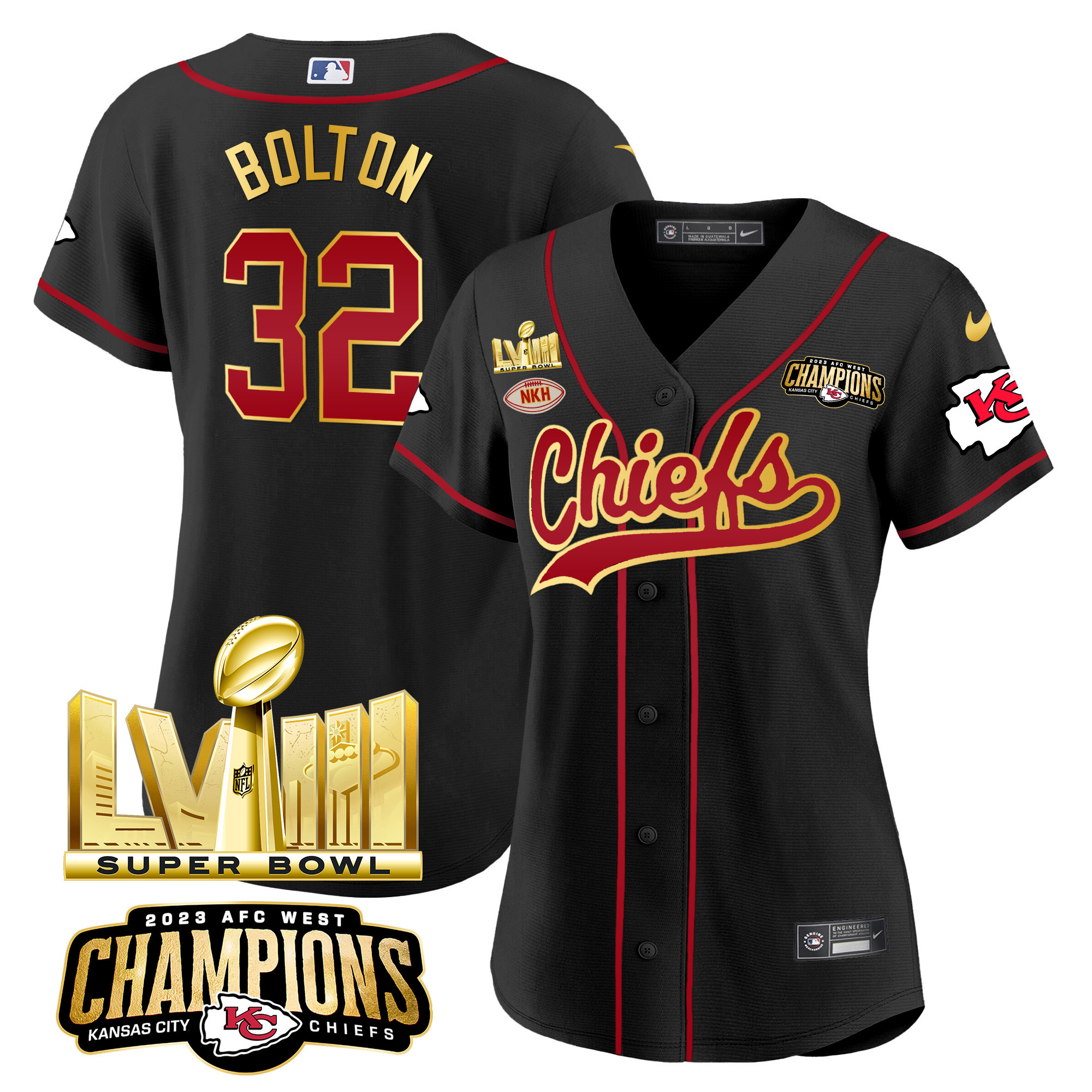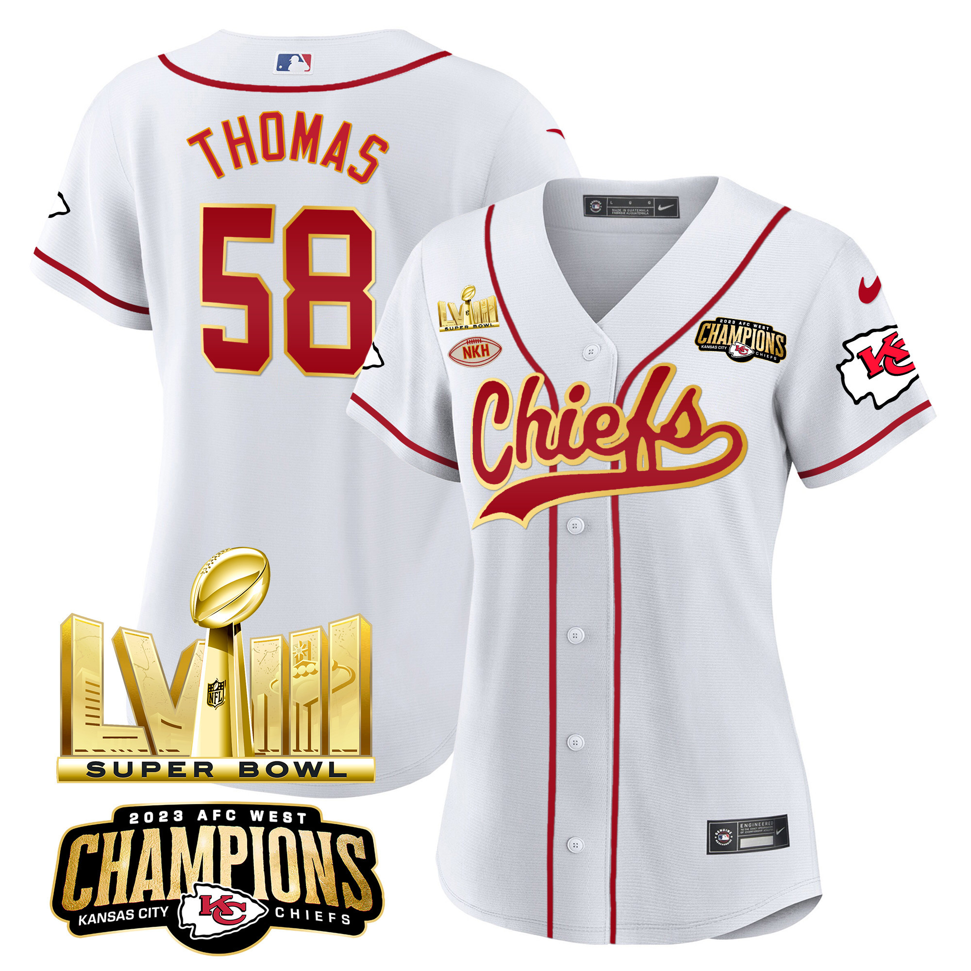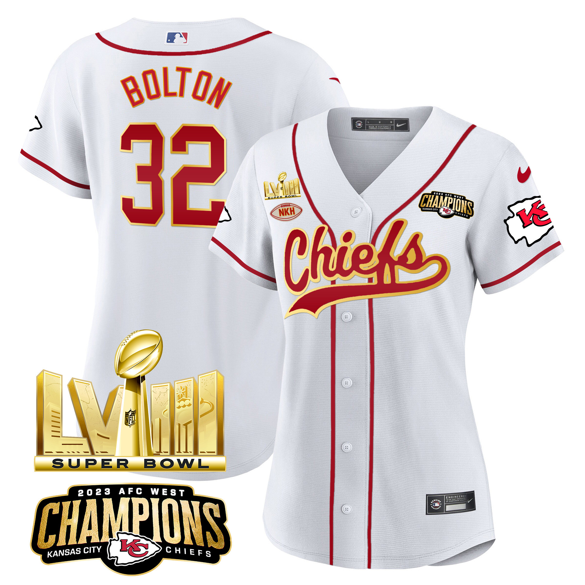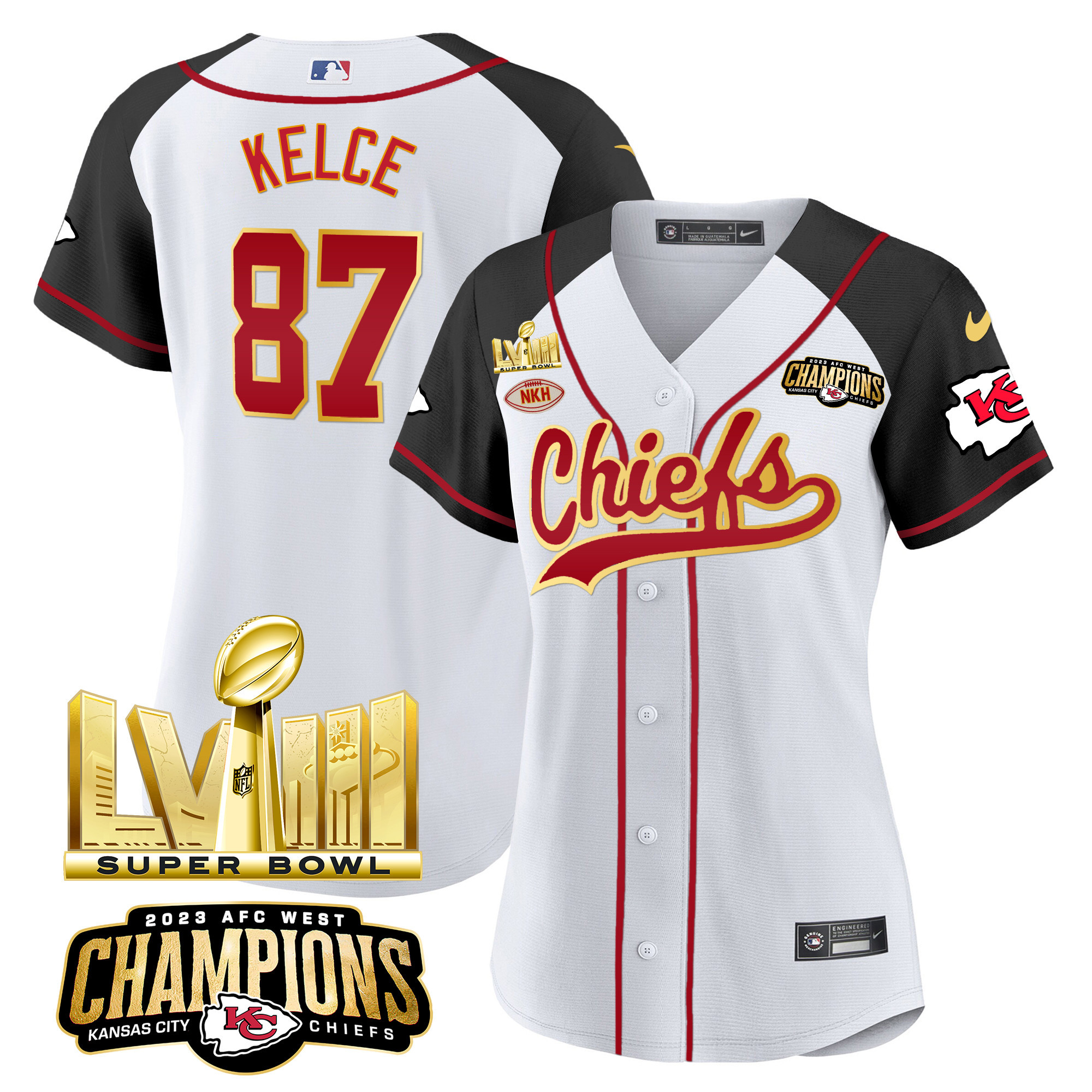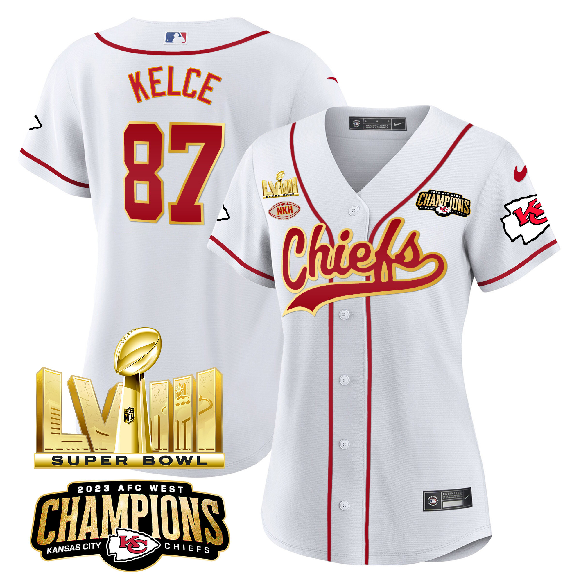 Women’s Chiefs AFC West Champions & Super Bowl LVIII Gold Patch Baseball Jersey – All Stitched