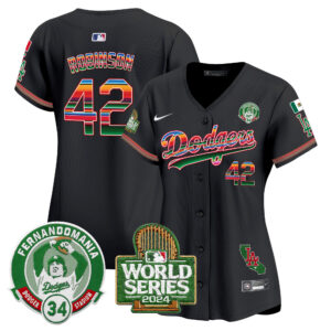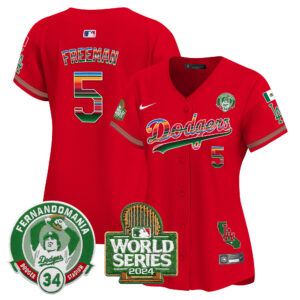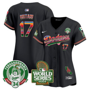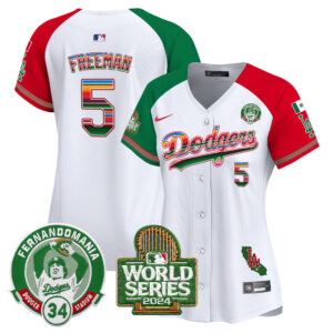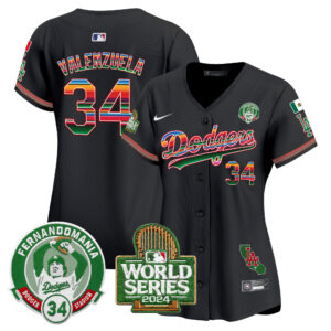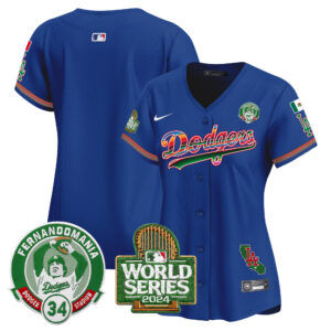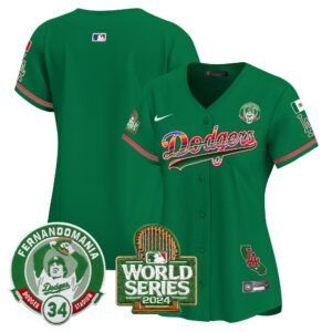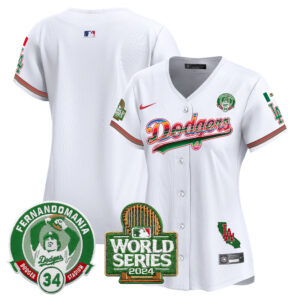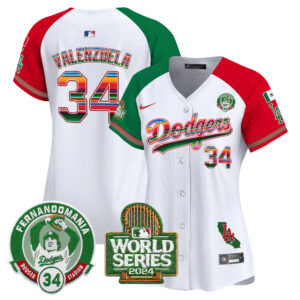 Women’s Dodgers Mexico Fernando Valenzuela & 2024 World Series Patch Vapor Premier Limited Jersey – All Stitched