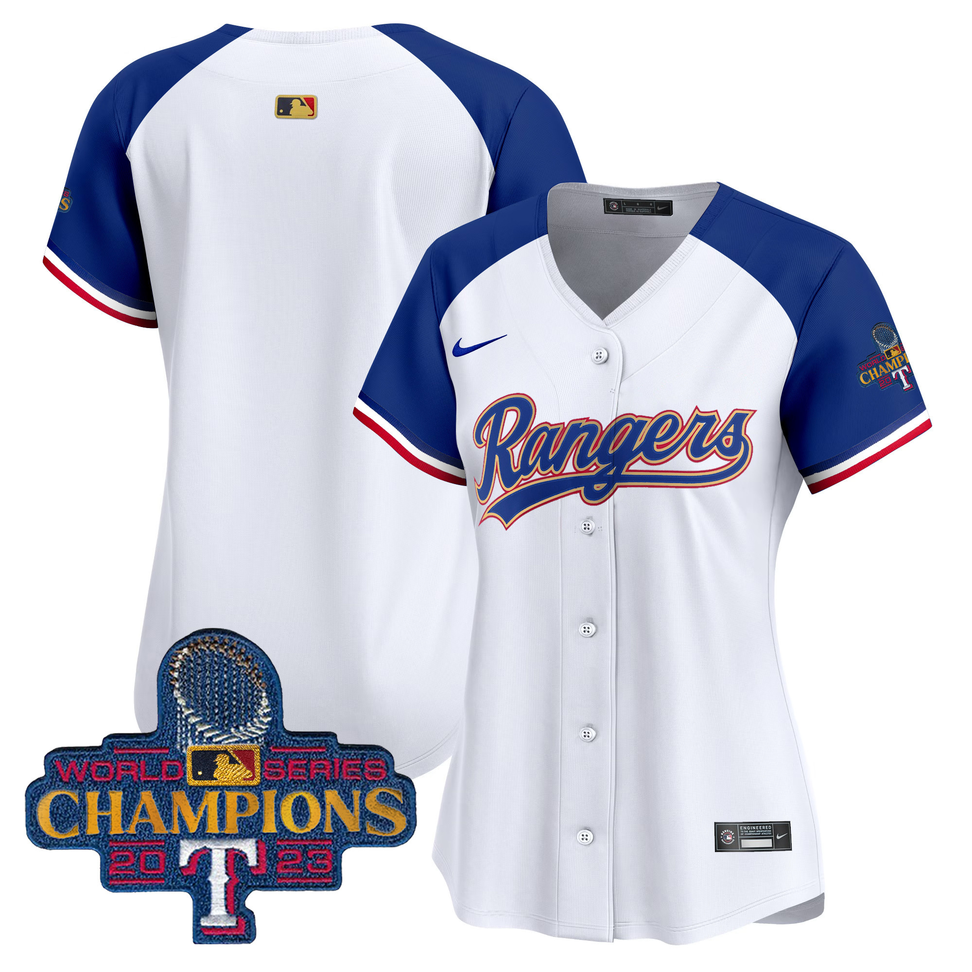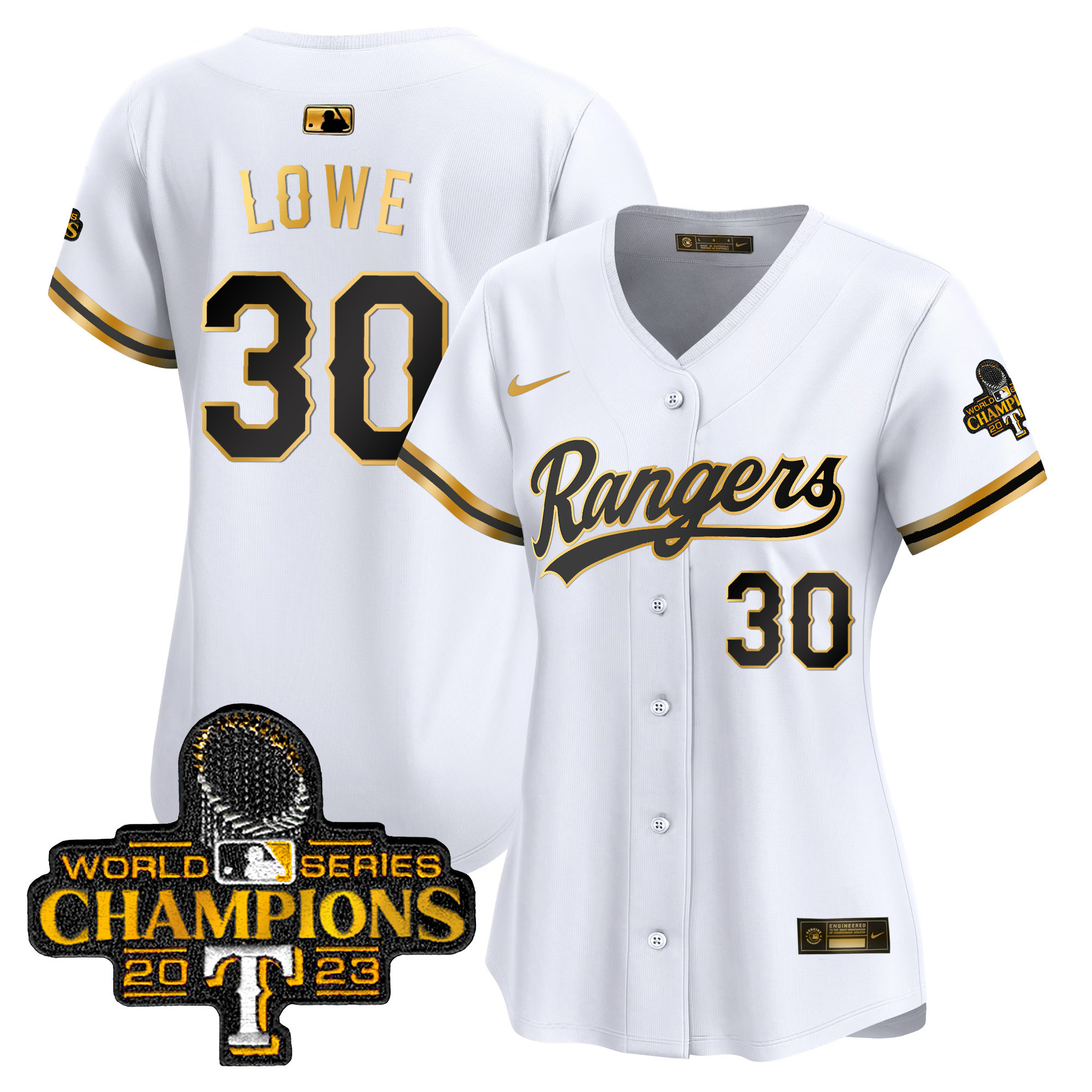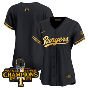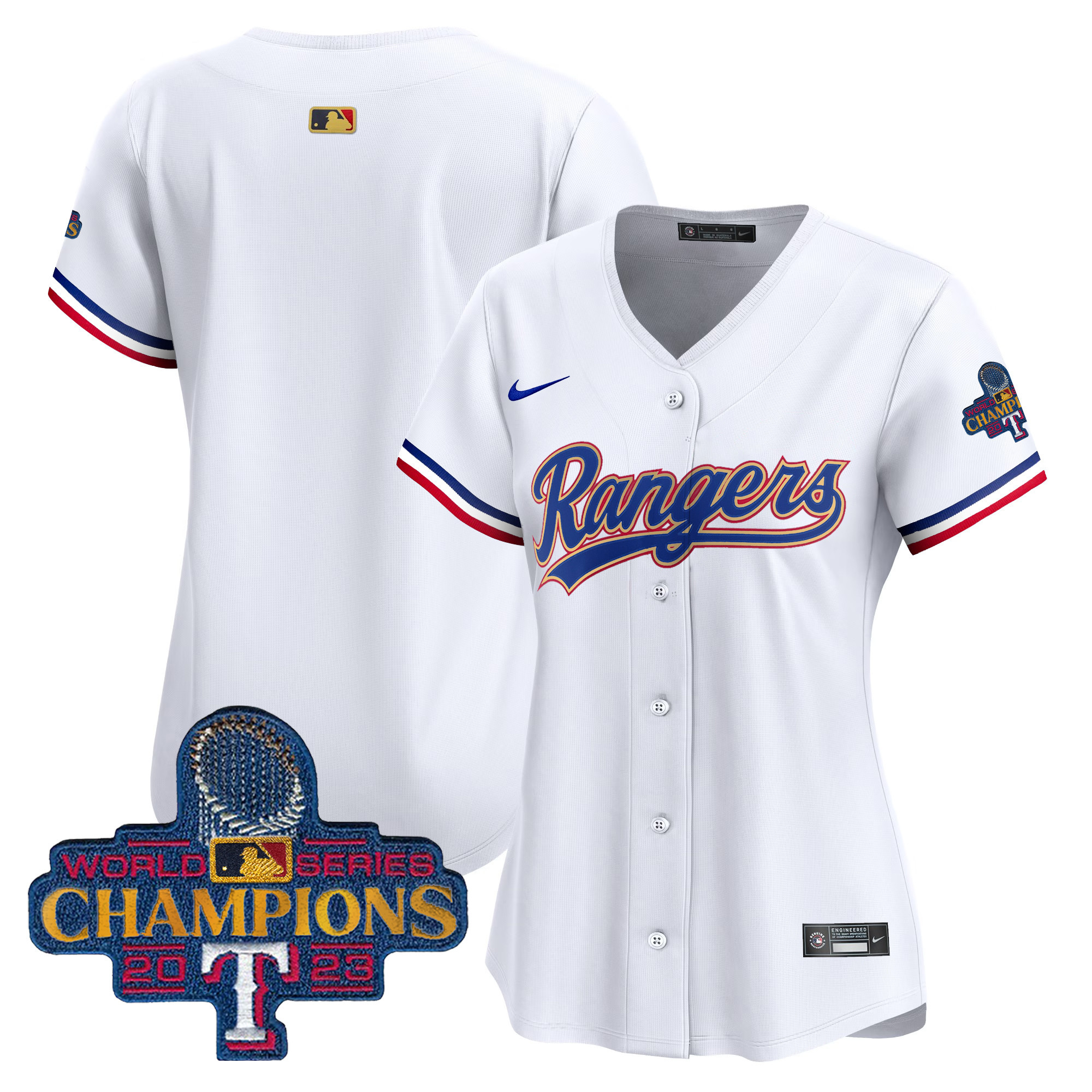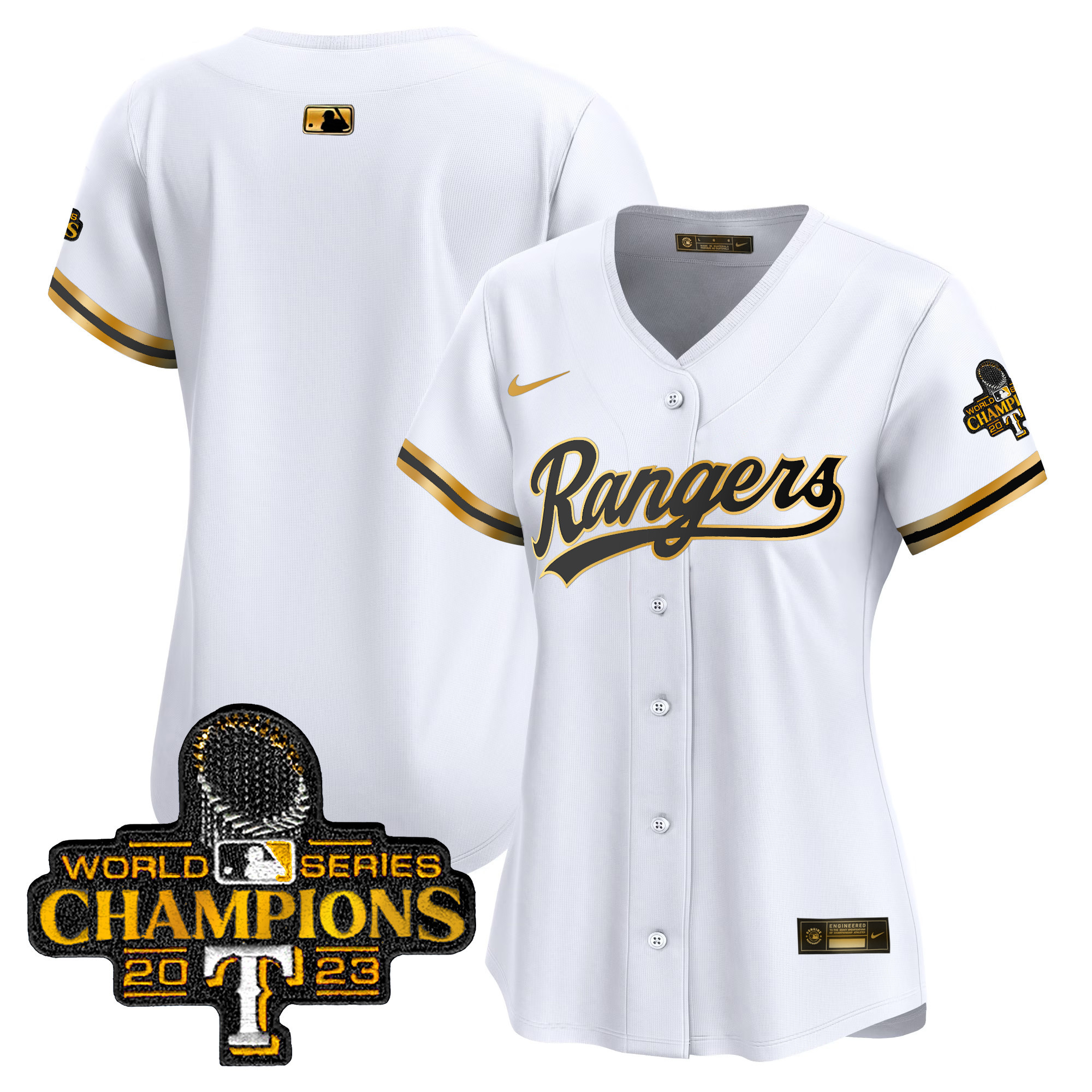 Women’s Texas Rangers 2023 World Series Champions Gold Trim Vapor Premier Limited Jersey – All Stitched