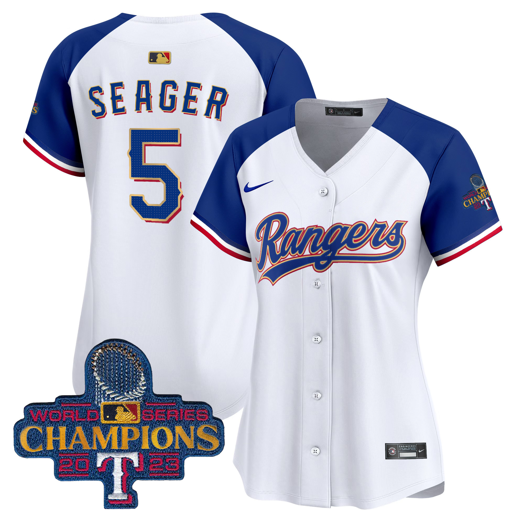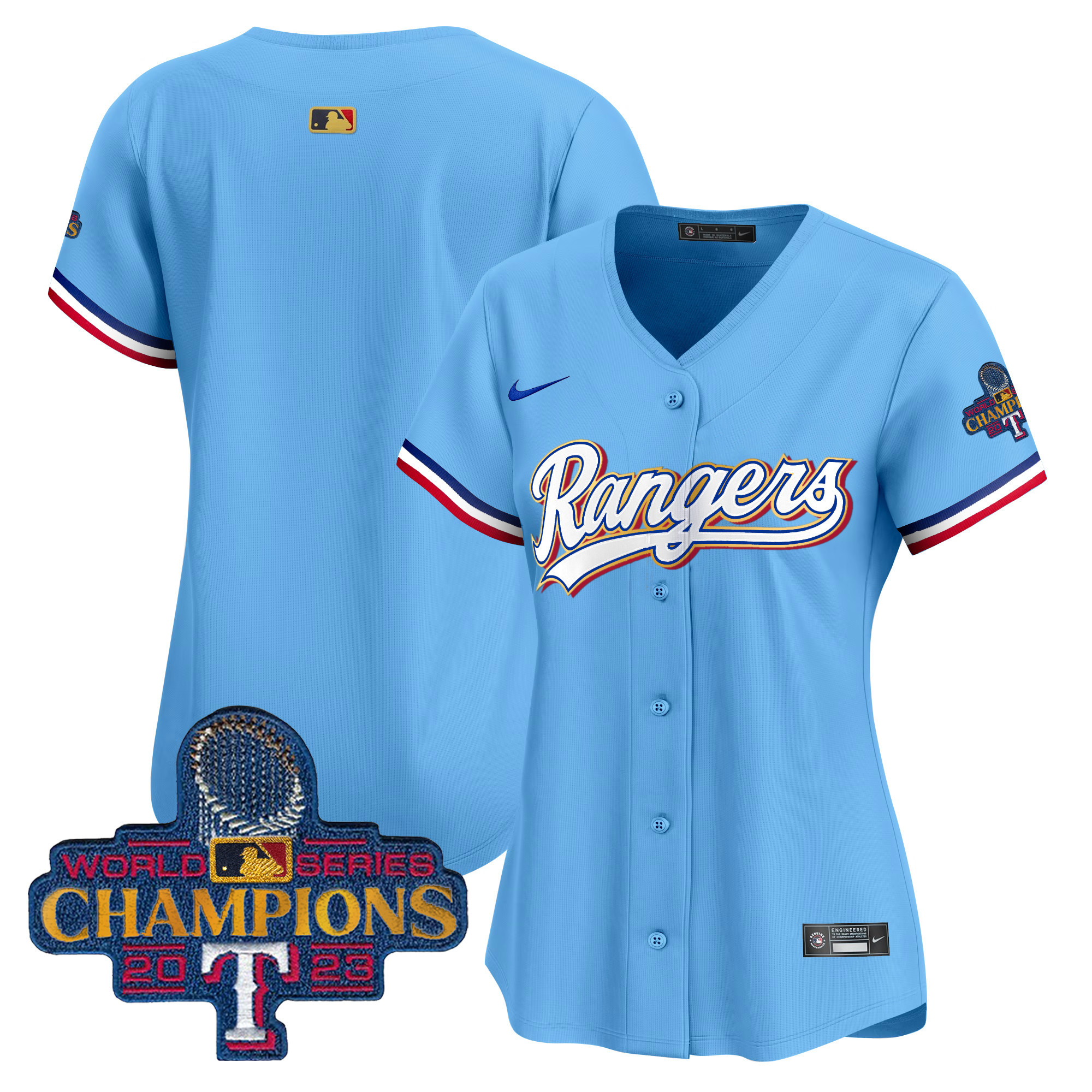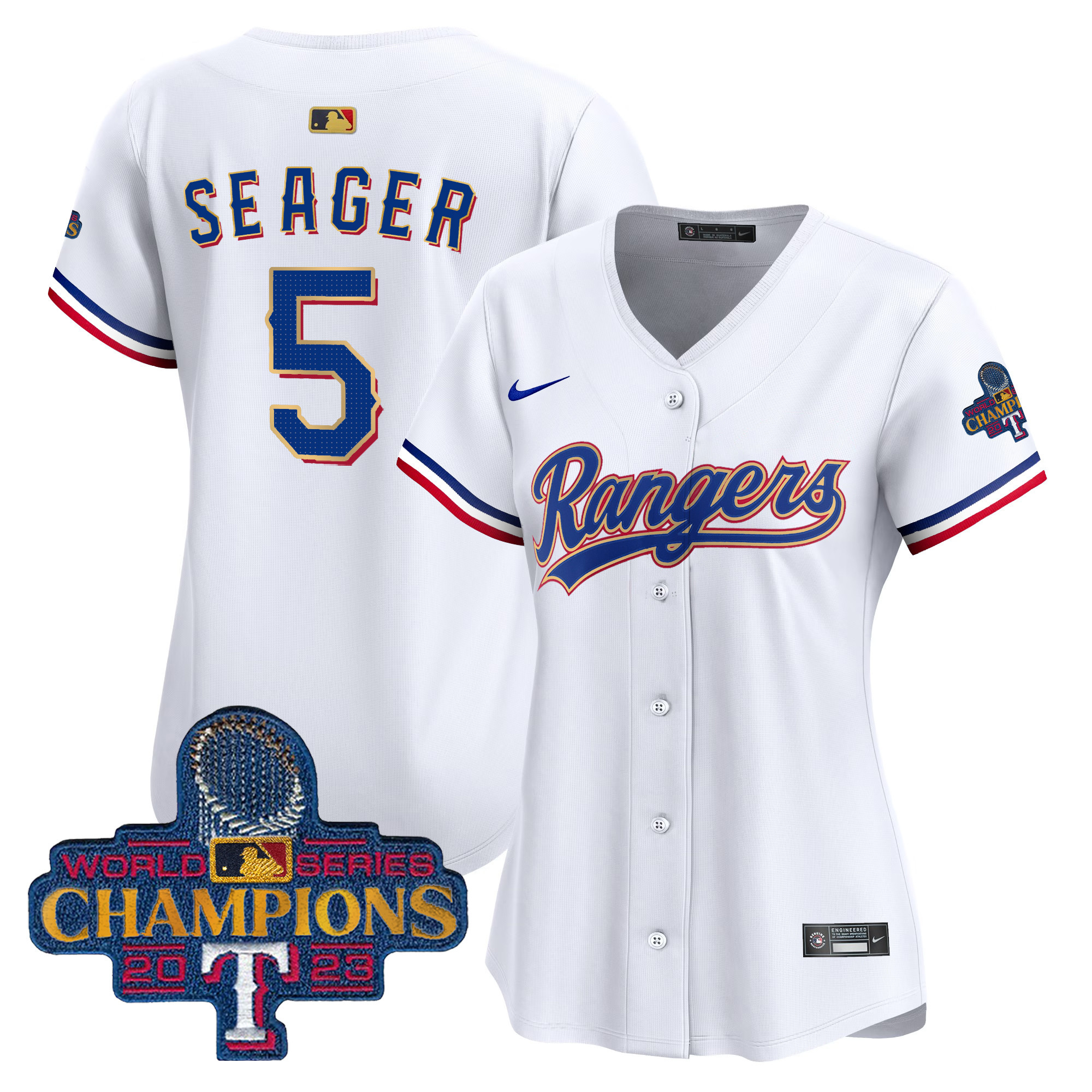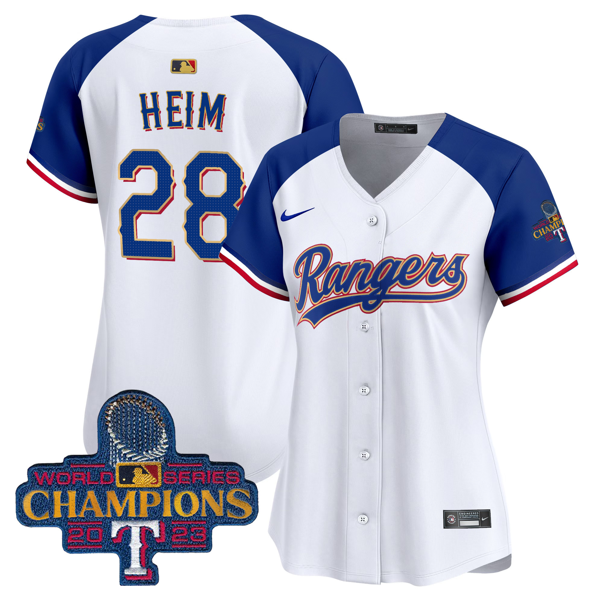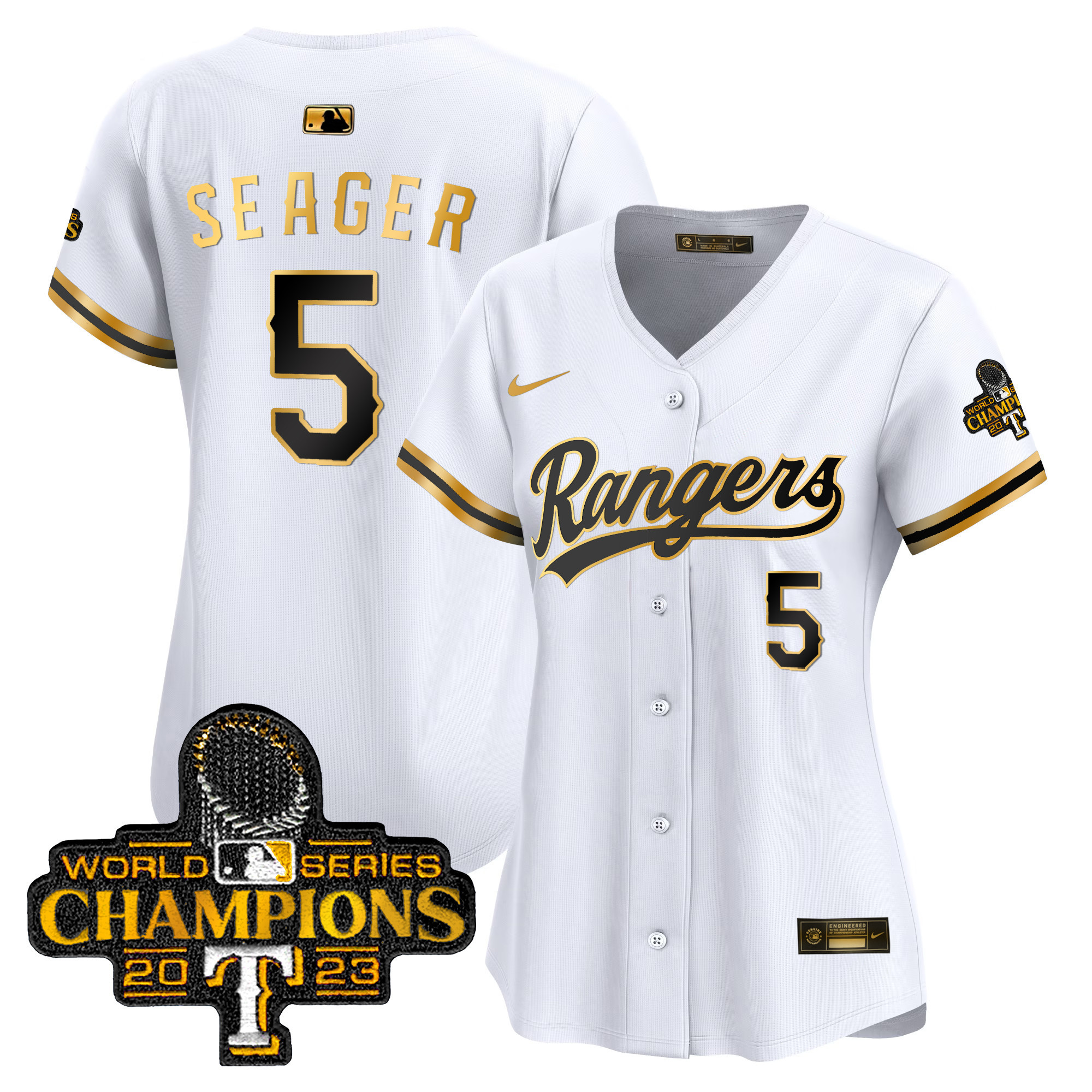 Women’s Texas Rangers 2023 World Series Champions Gold Trim Vapor Premier Limited Jersey – All Stitched