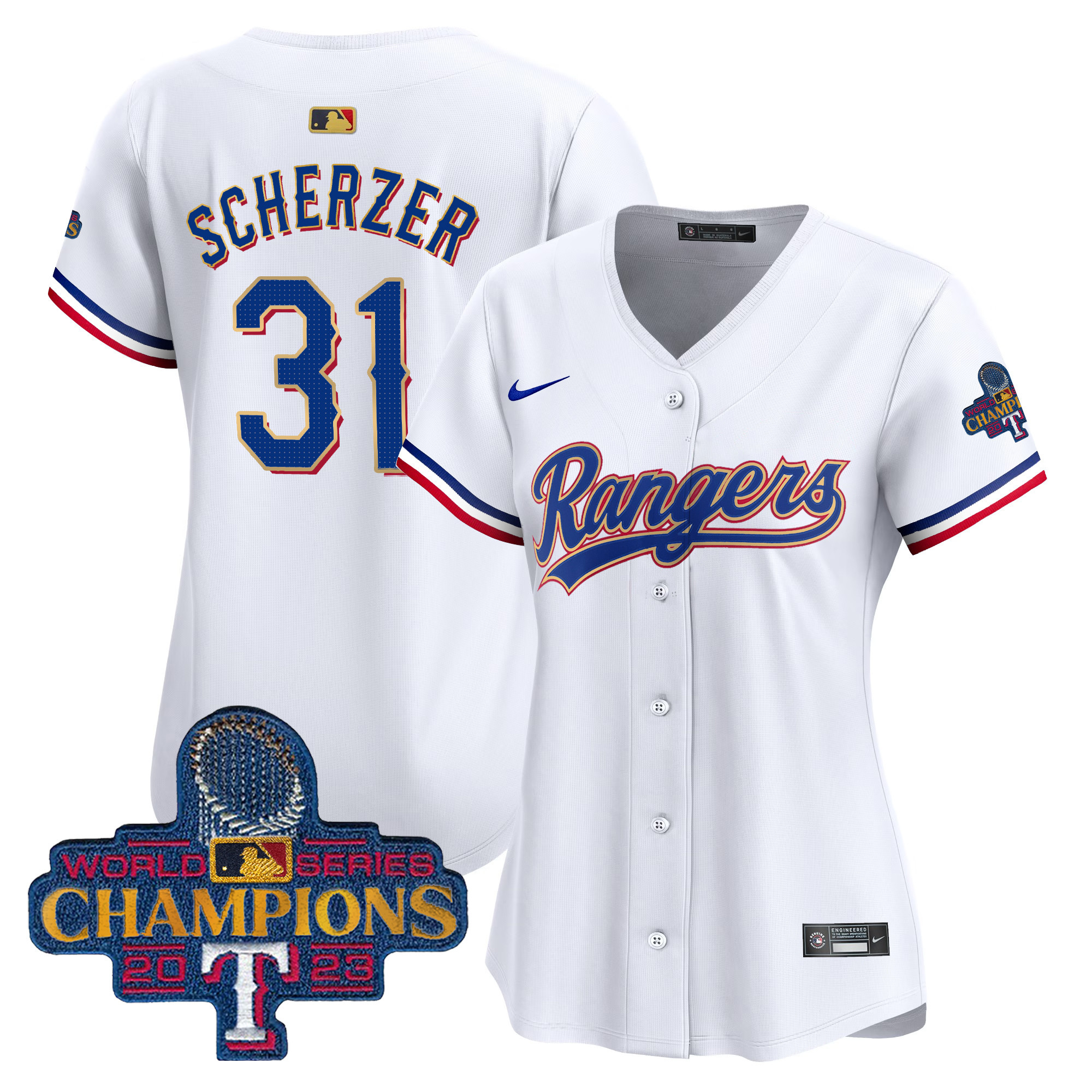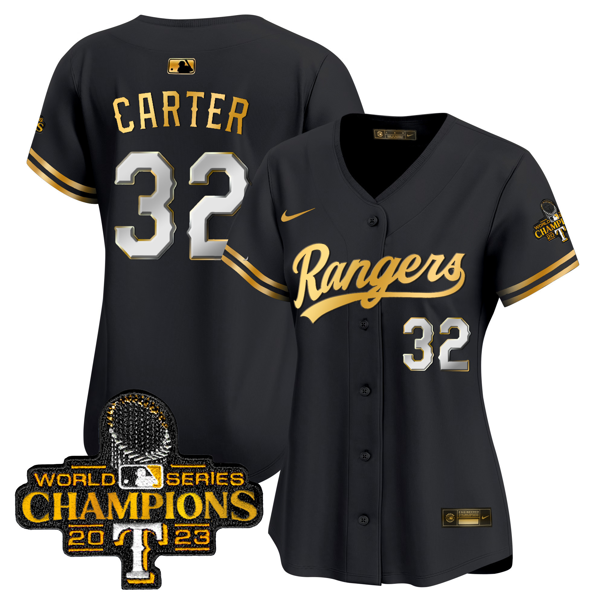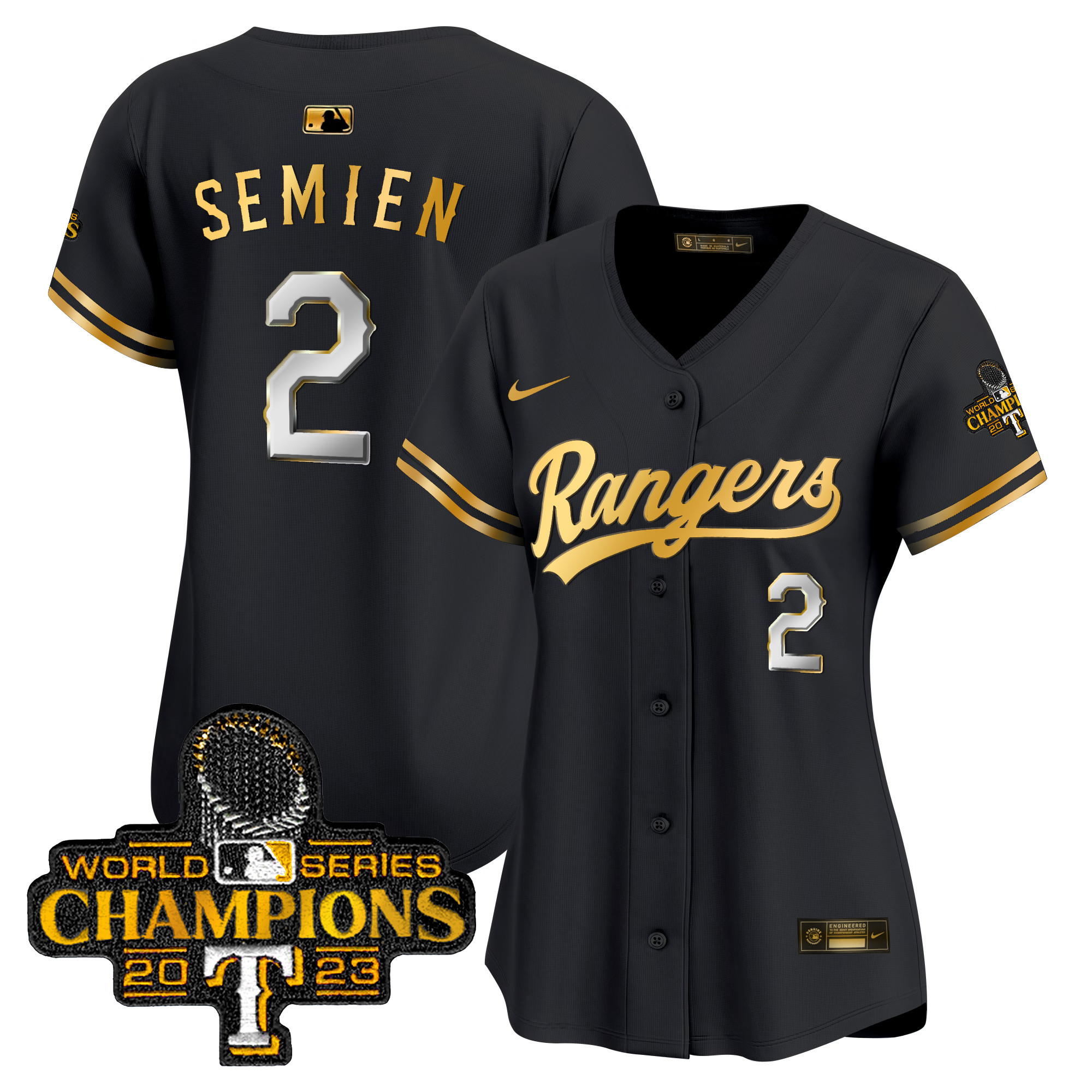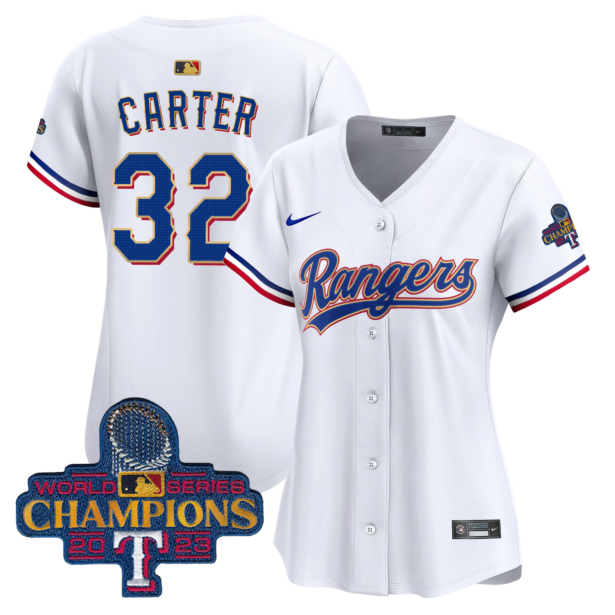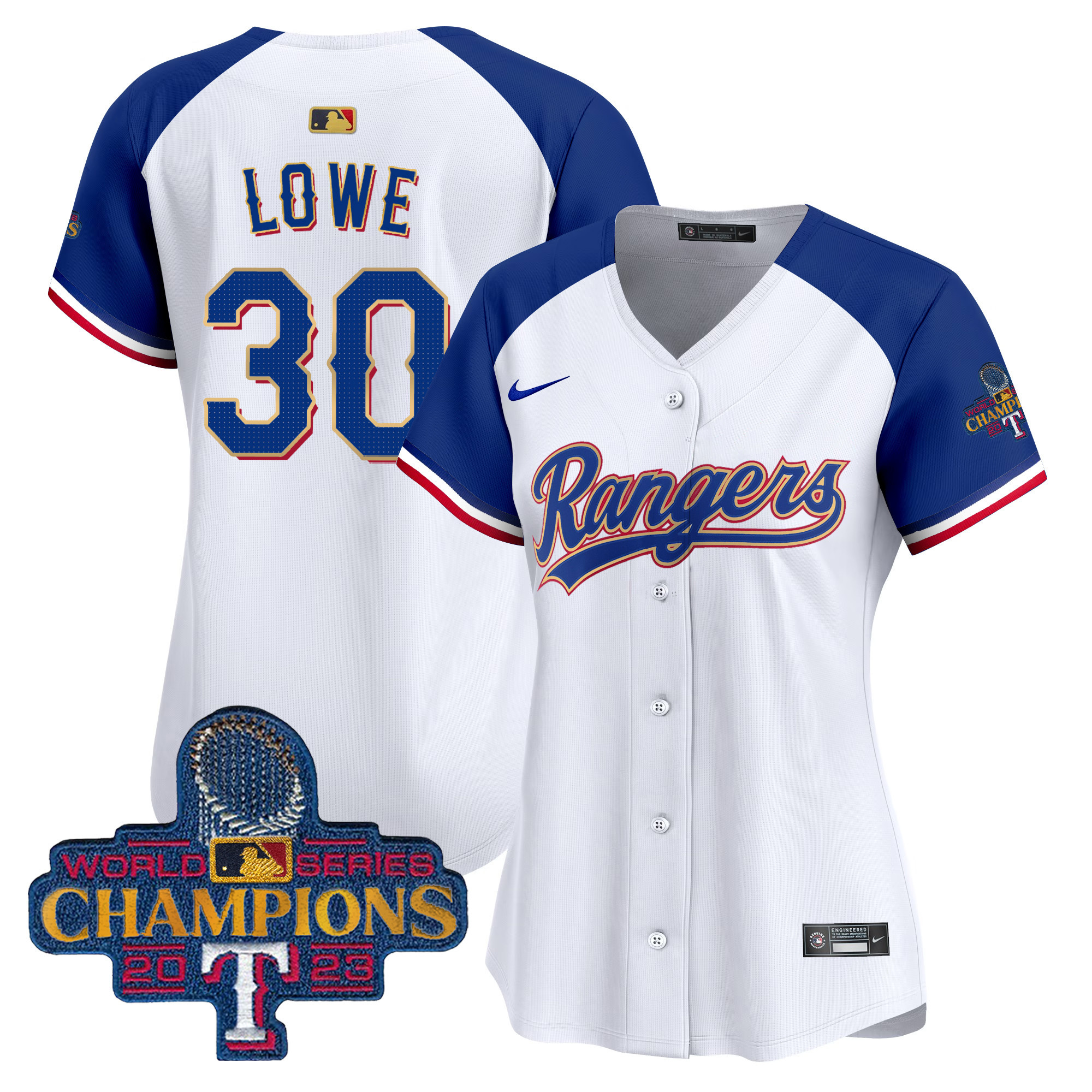 Women’s Texas Rangers 2023 World Series Champions Gold Trim Vapor Premier Limited Jersey – All Stitched