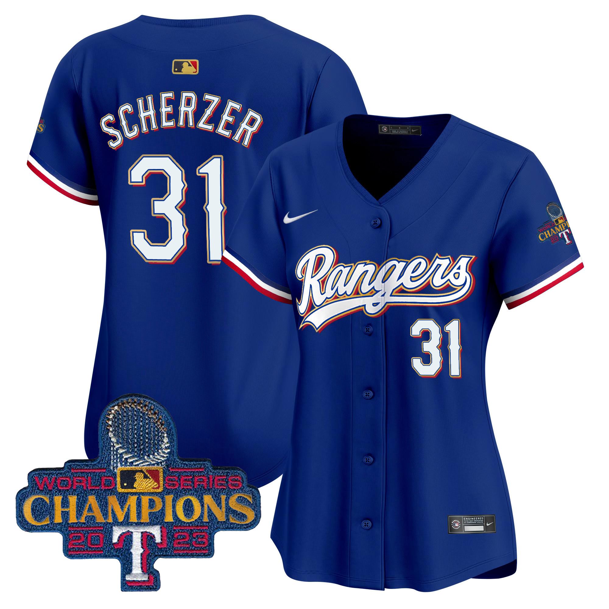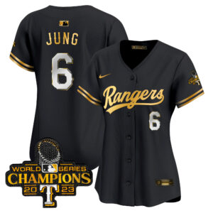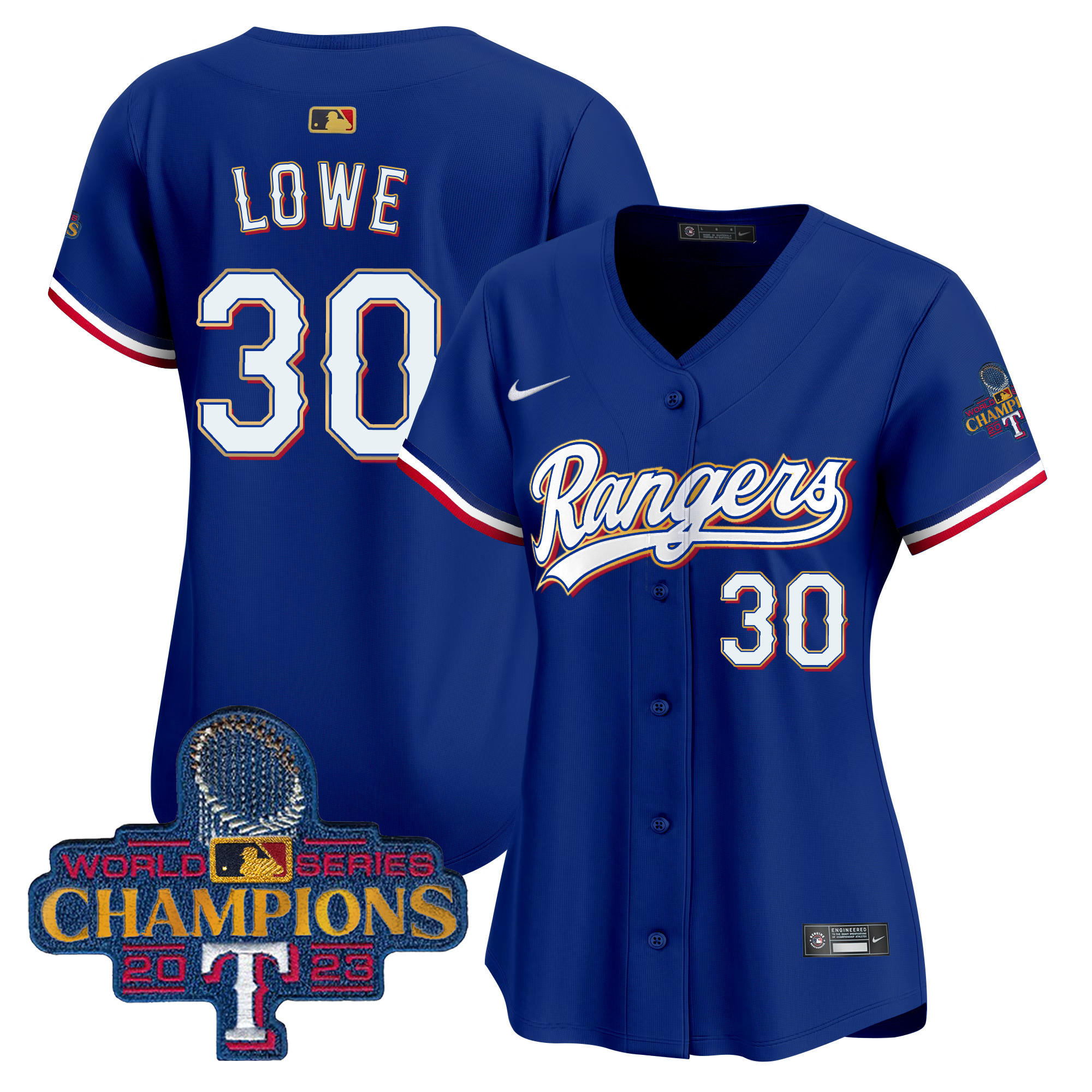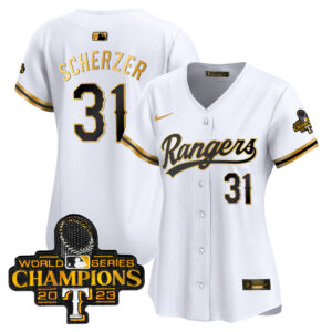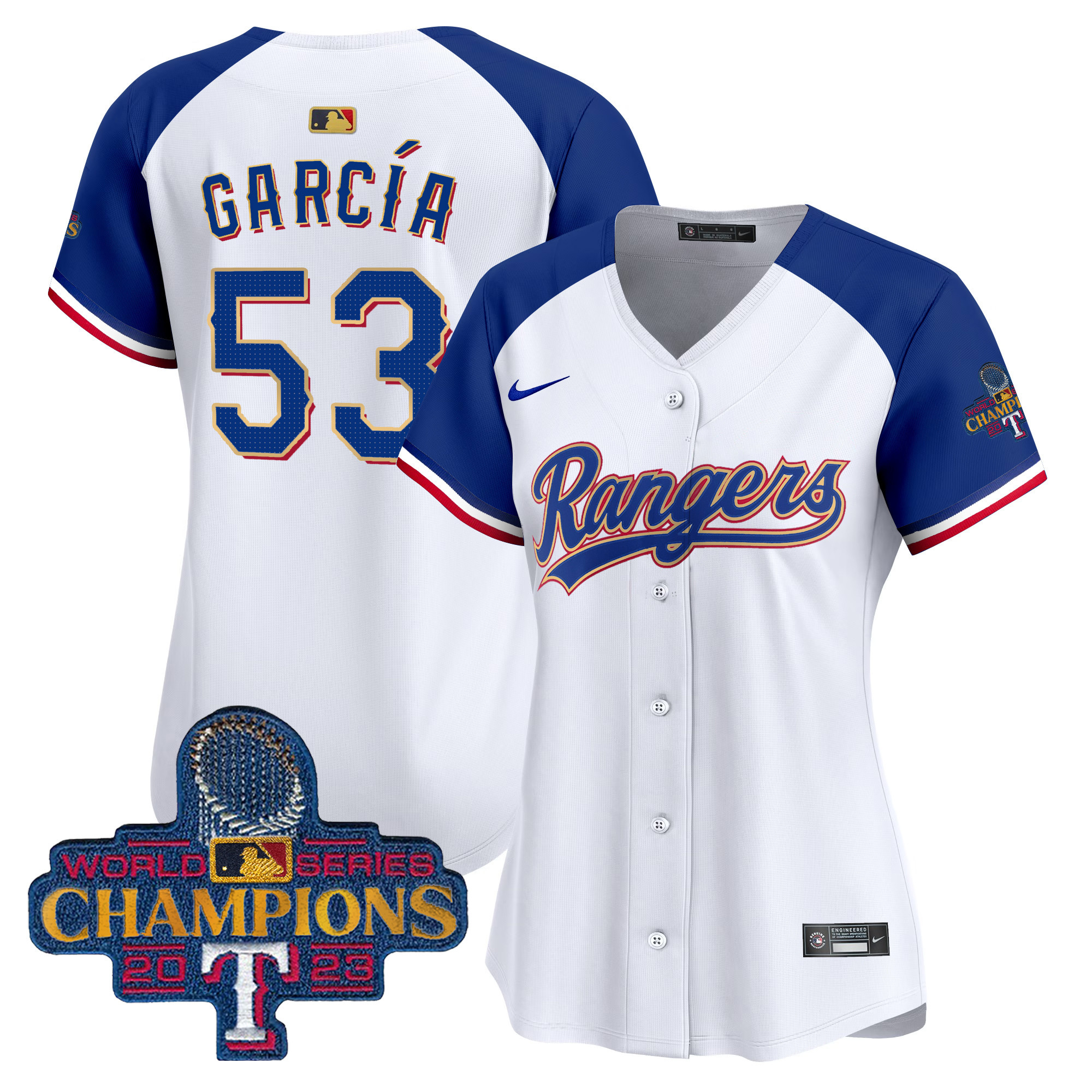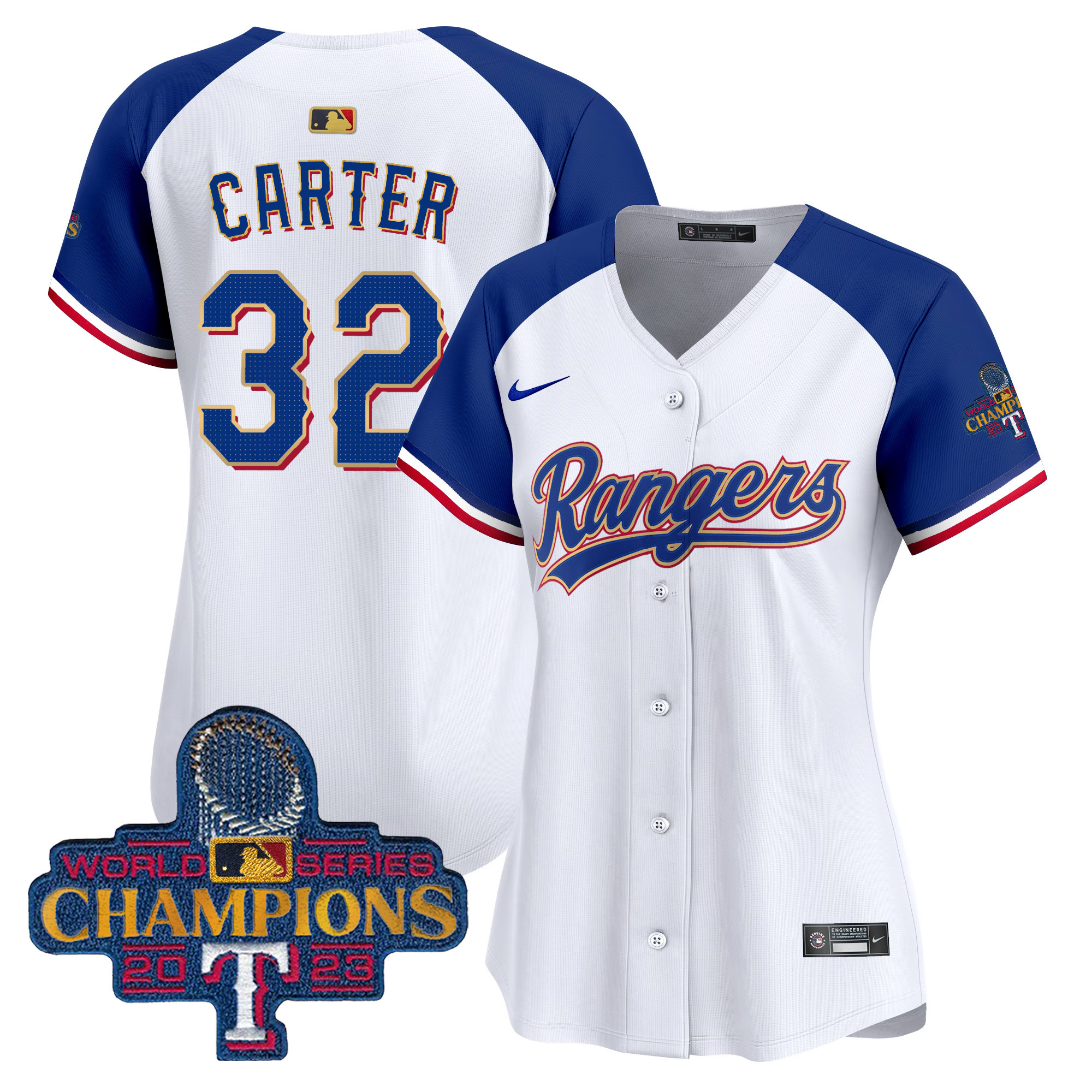 Women’s Texas Rangers 2023 World Series Champions Gold Trim Vapor Premier Limited Jersey – All Stitched