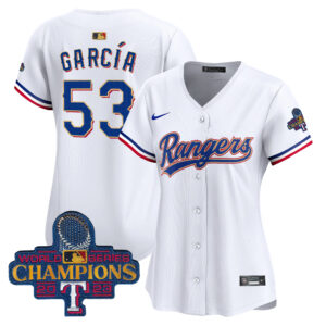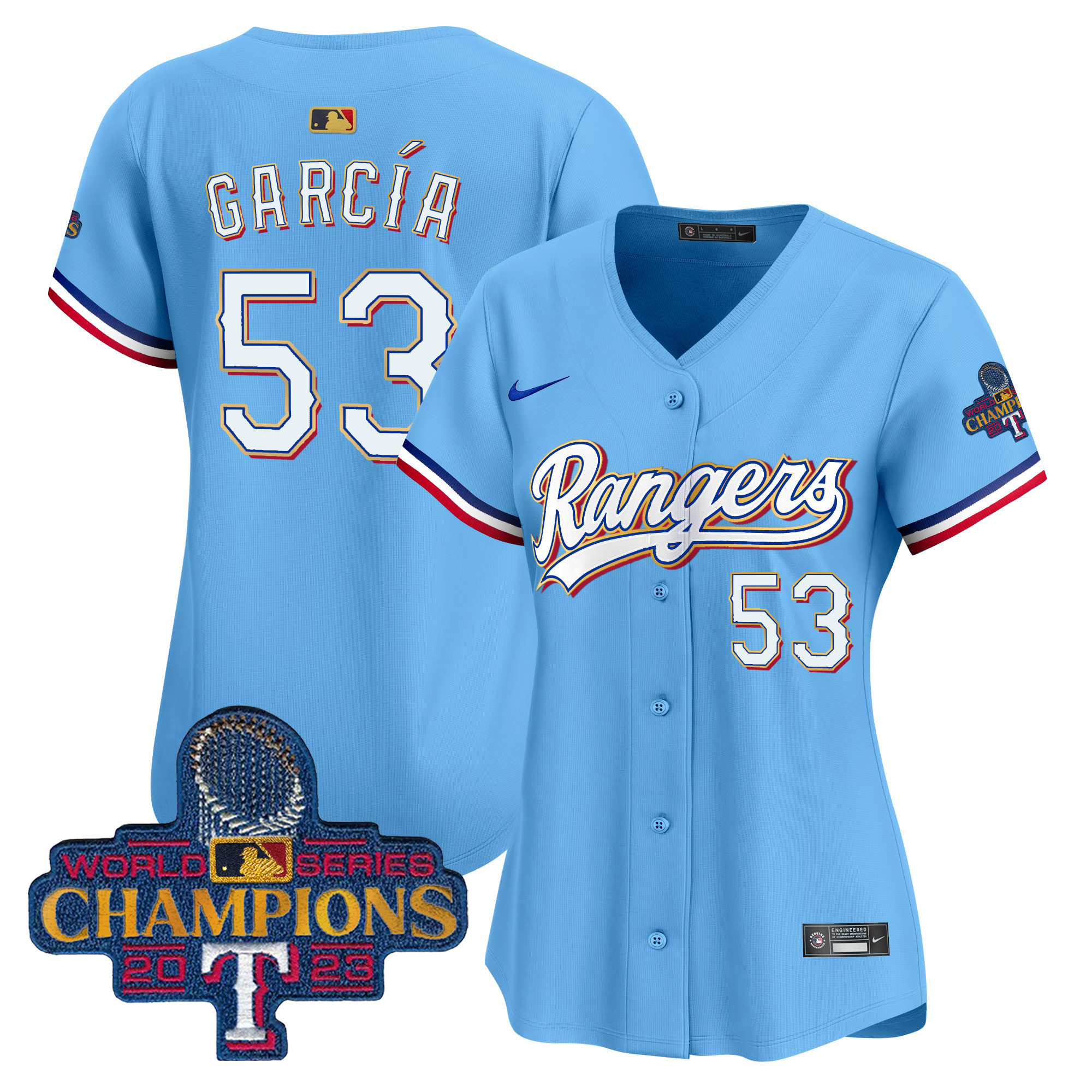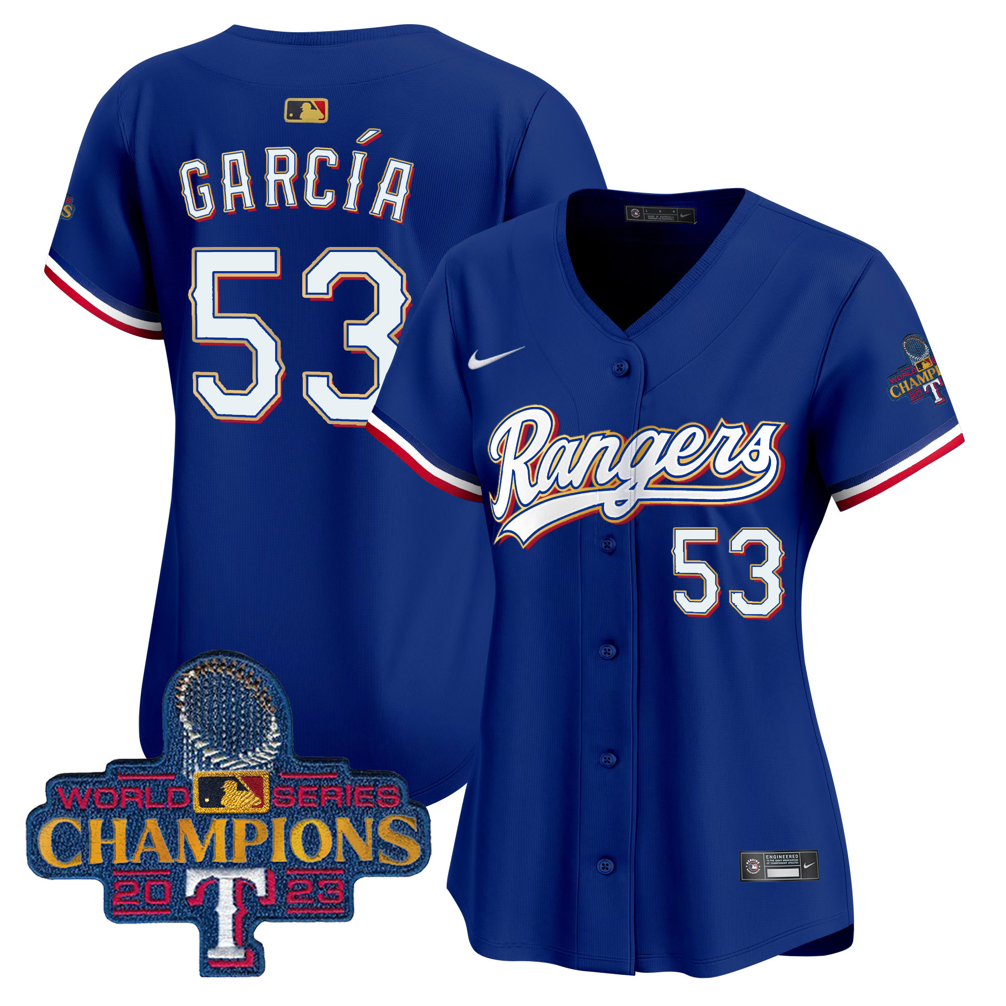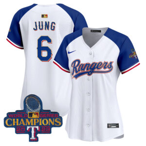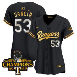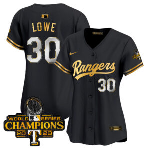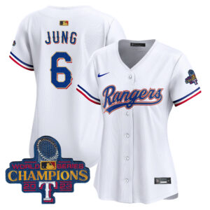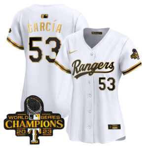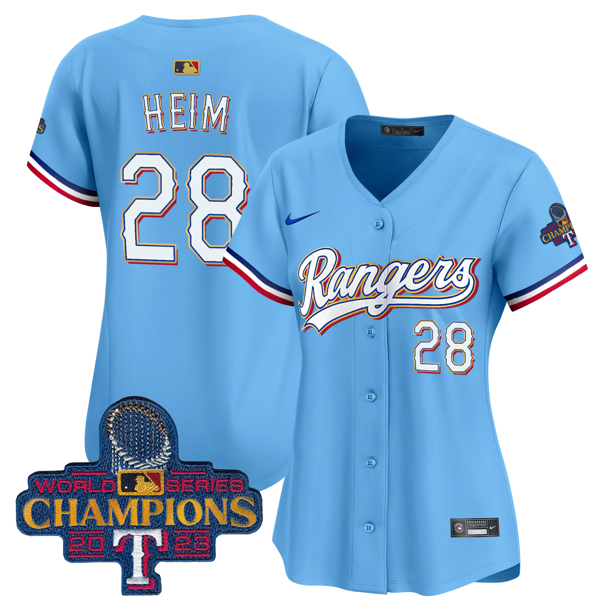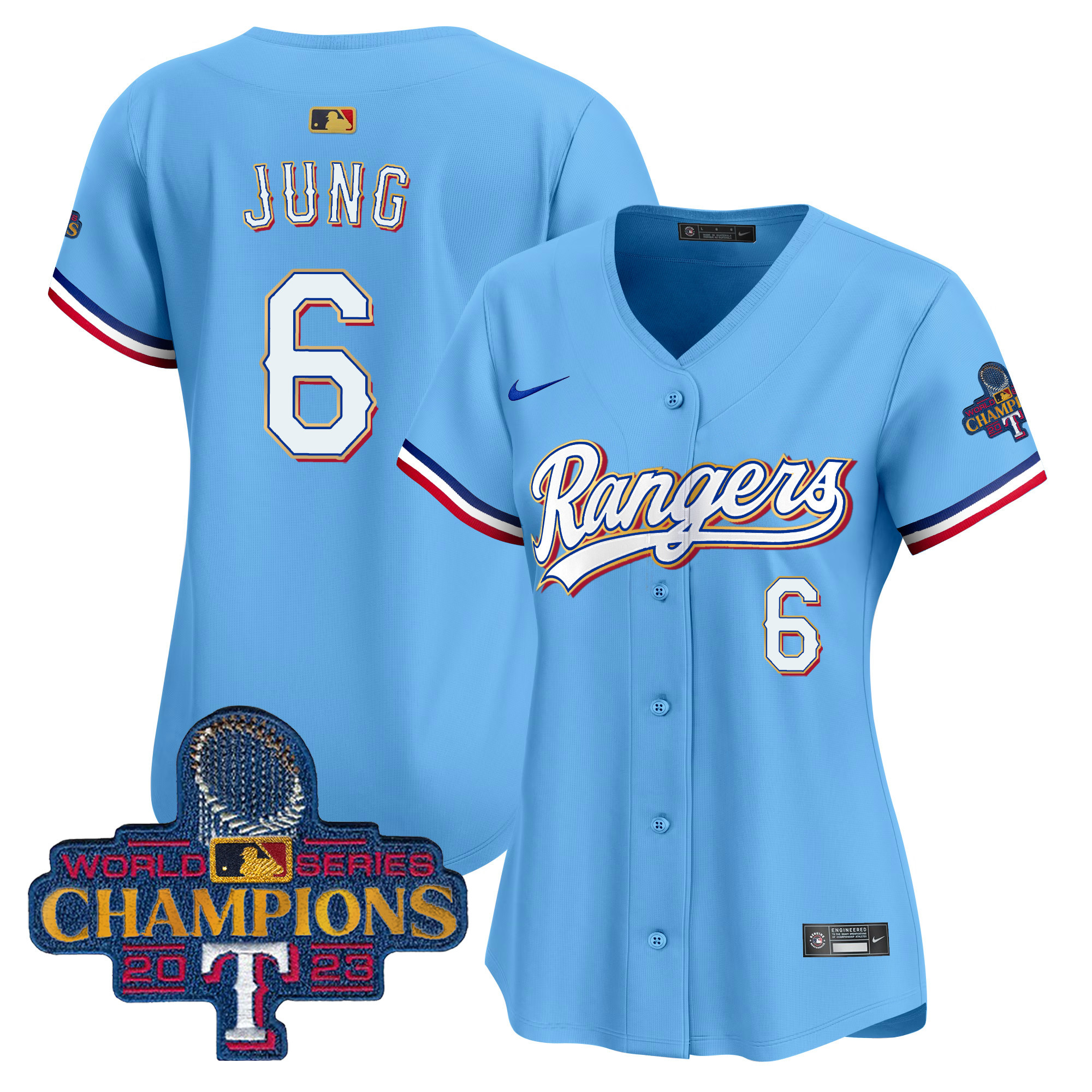 Women’s Texas Rangers 2023 World Series Champions Gold Trim Vapor Premier Limited Jersey – All Stitched